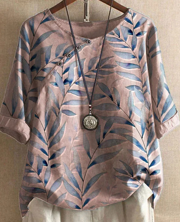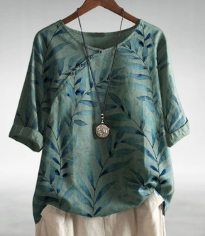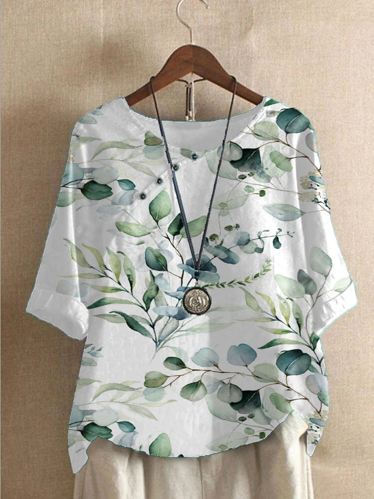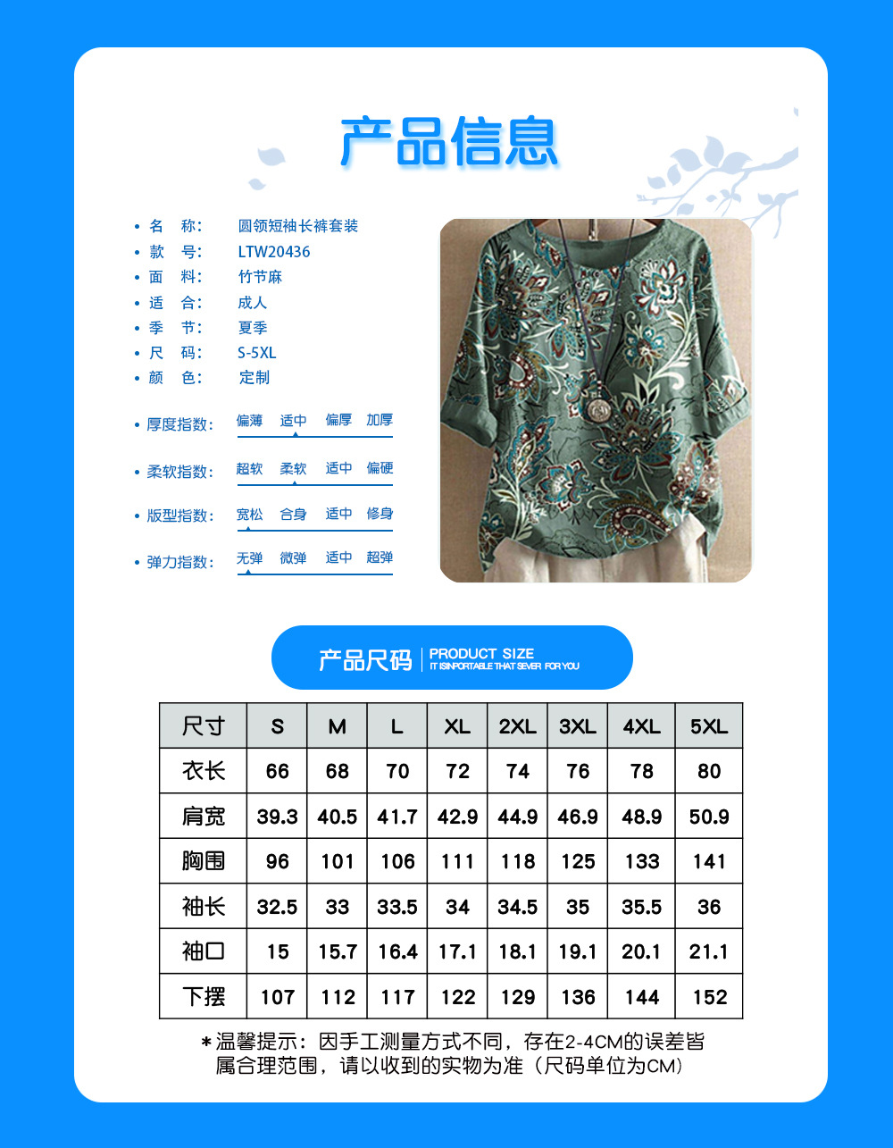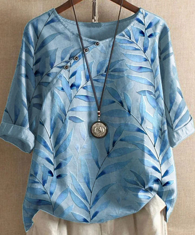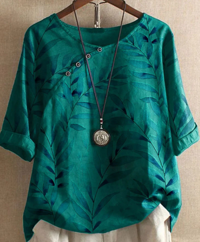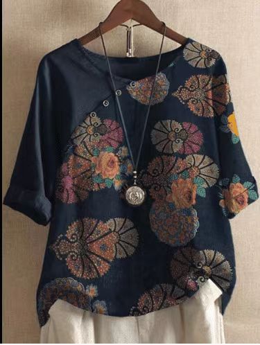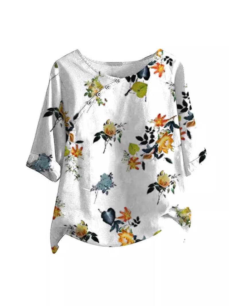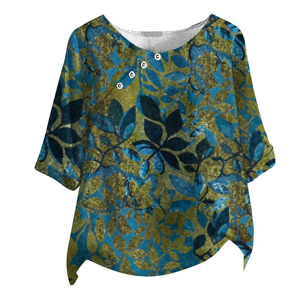 대외 무역 독립 역 새로운 셔츠 여성 꽃 3D 인쇄 슬럽 라운드 넥 짧은 소매 버튼 7 점 소매 셔츠