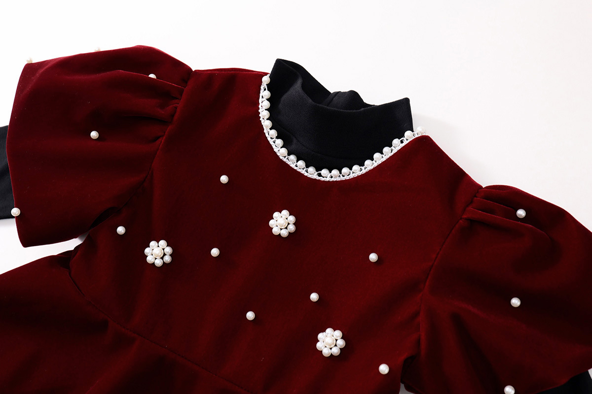 여아용 레드 벨벳 드레스 2025 가을 겨울 신상 여아용 퍼프 소매 비즈 장식 공주 드레스 도매스토어 가기