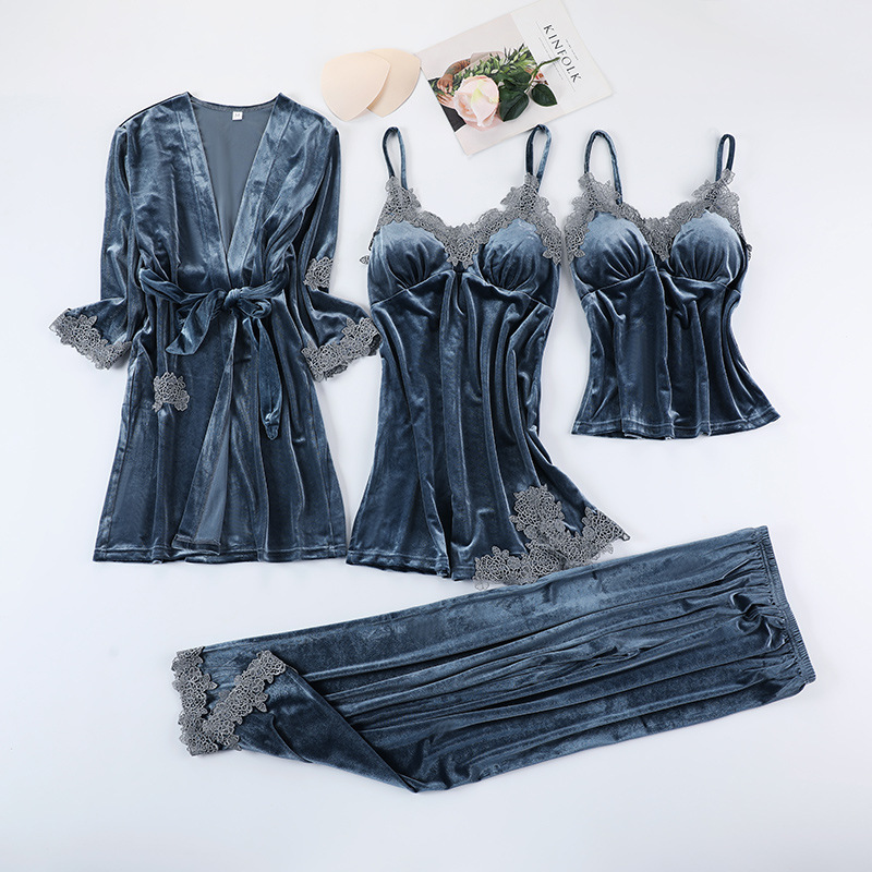 4 피스 잠옷 여성의 봄과 가을 황금 벨벳 잠옷 가을과 겨울 긴팔 바지 세트 섹시한 벨트 가슴 패드 홈 옷