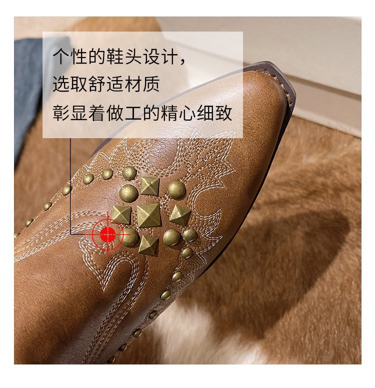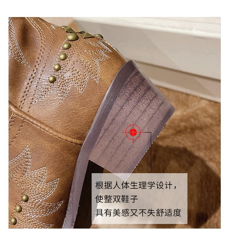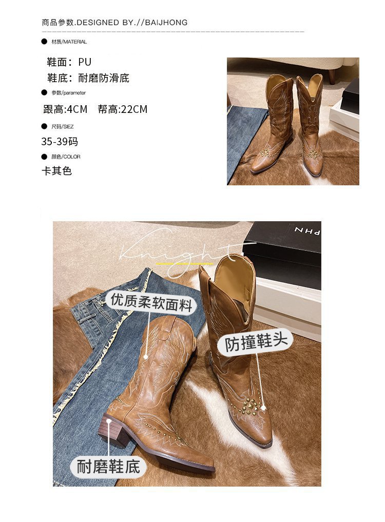 스팟 리벳 레트로 웨스턴 카우보이 부츠 여성 새로운 두꺼운 뒤꿈치 V 입 수 놓은 나이트 부츠 지적 발가락 중반 송아지 부츠 여성스토어 가기