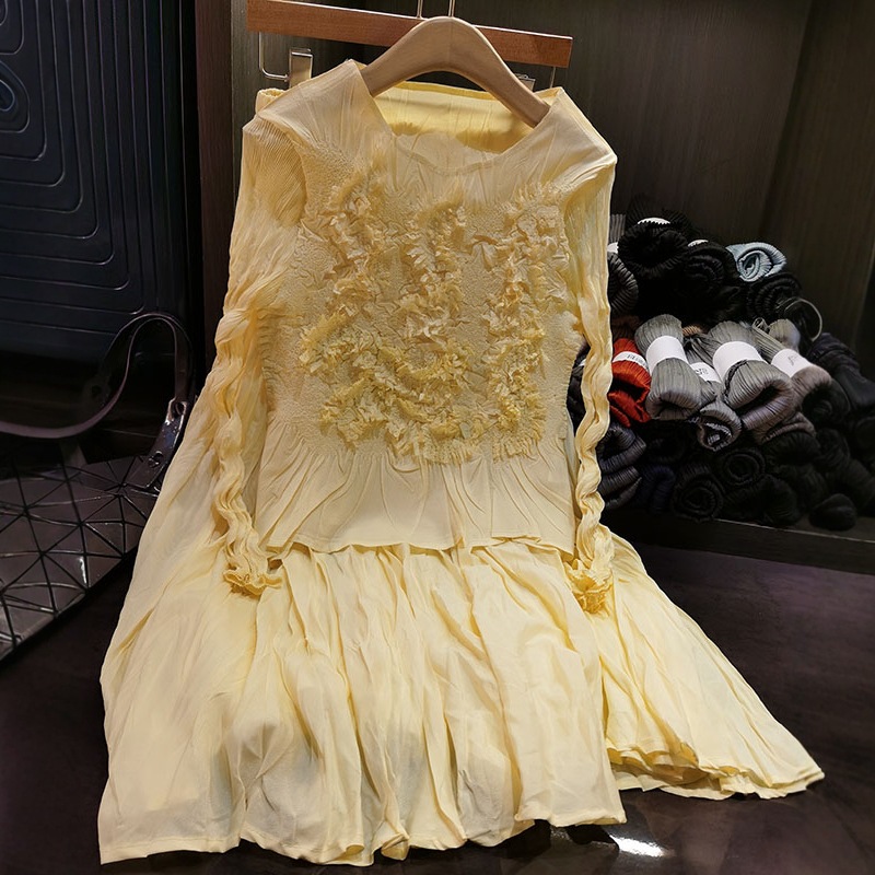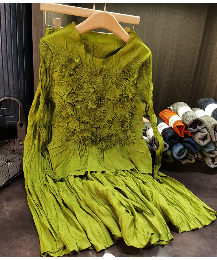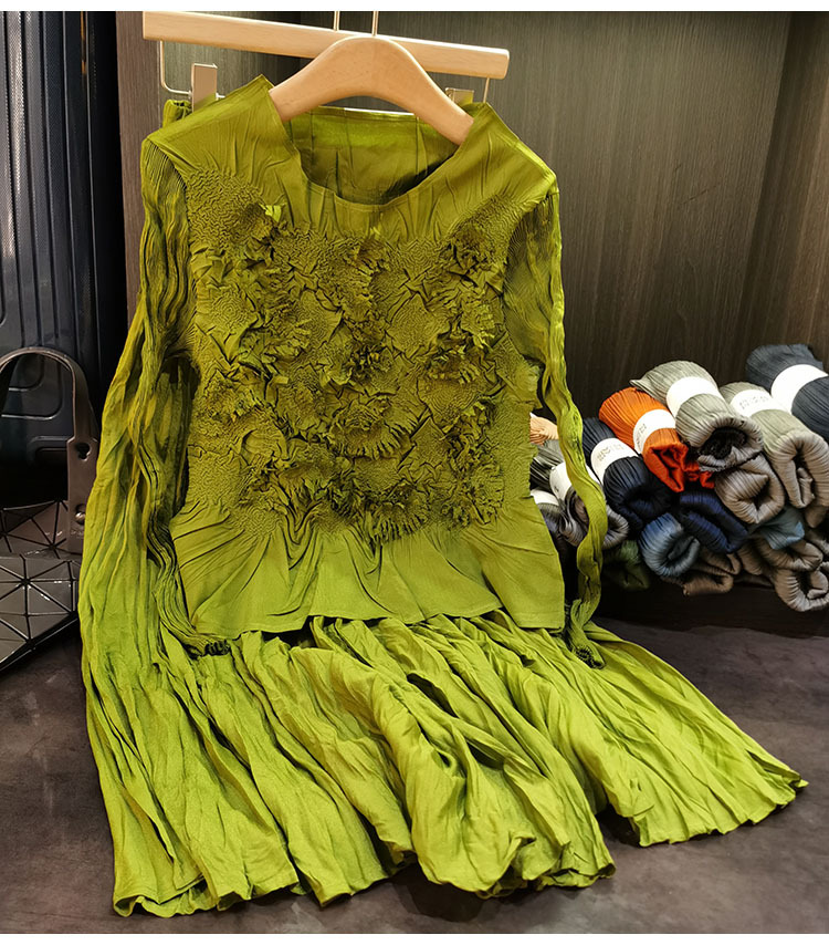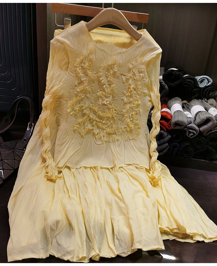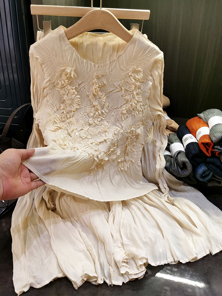 고급스러운 수제 플라워 플리츠 탑과 스커트 투피스 세트, 여성 가을 신상 패셔너블 슈트