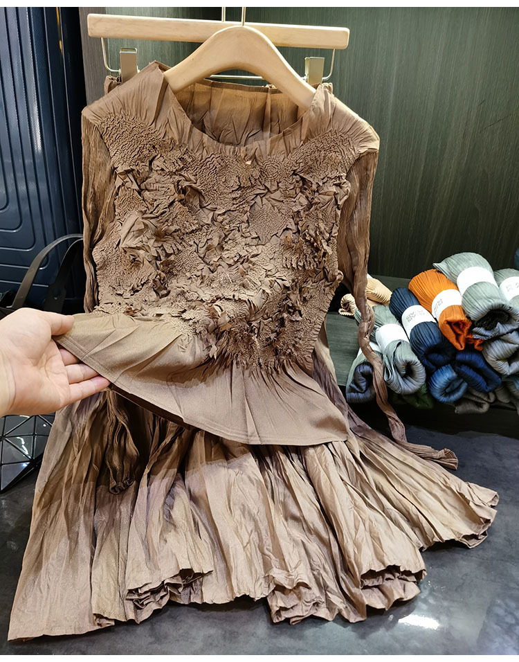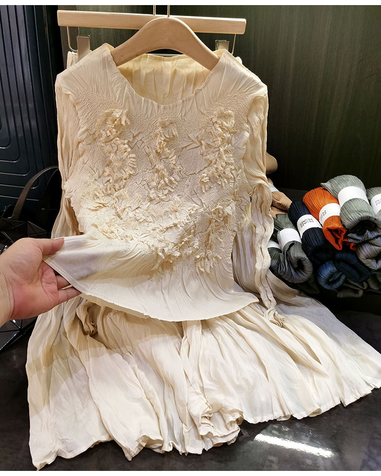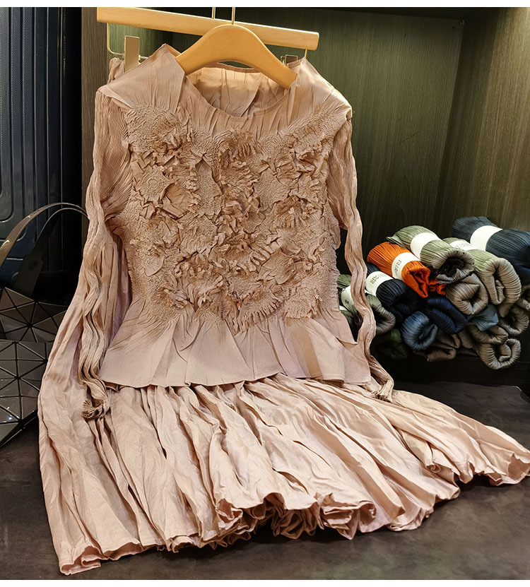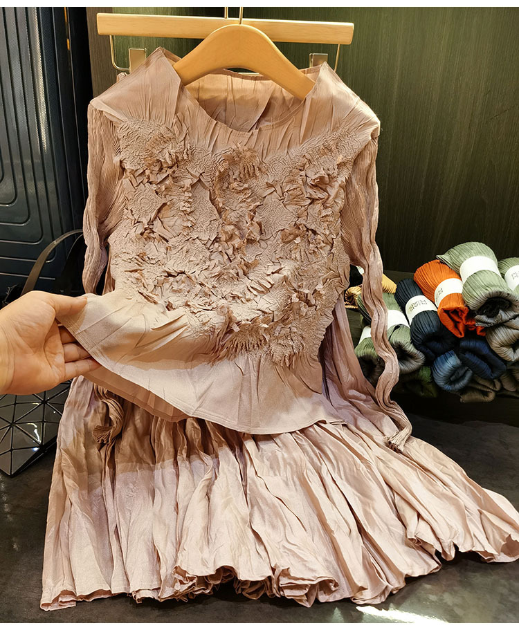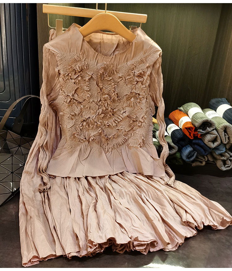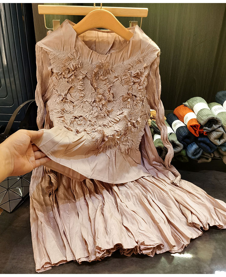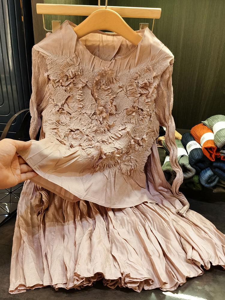 고급스러운 수제 플라워 플리츠 탑과 스커트 투피스 세트, 여성 가을 신상 패셔너블 슈트스토어 가기