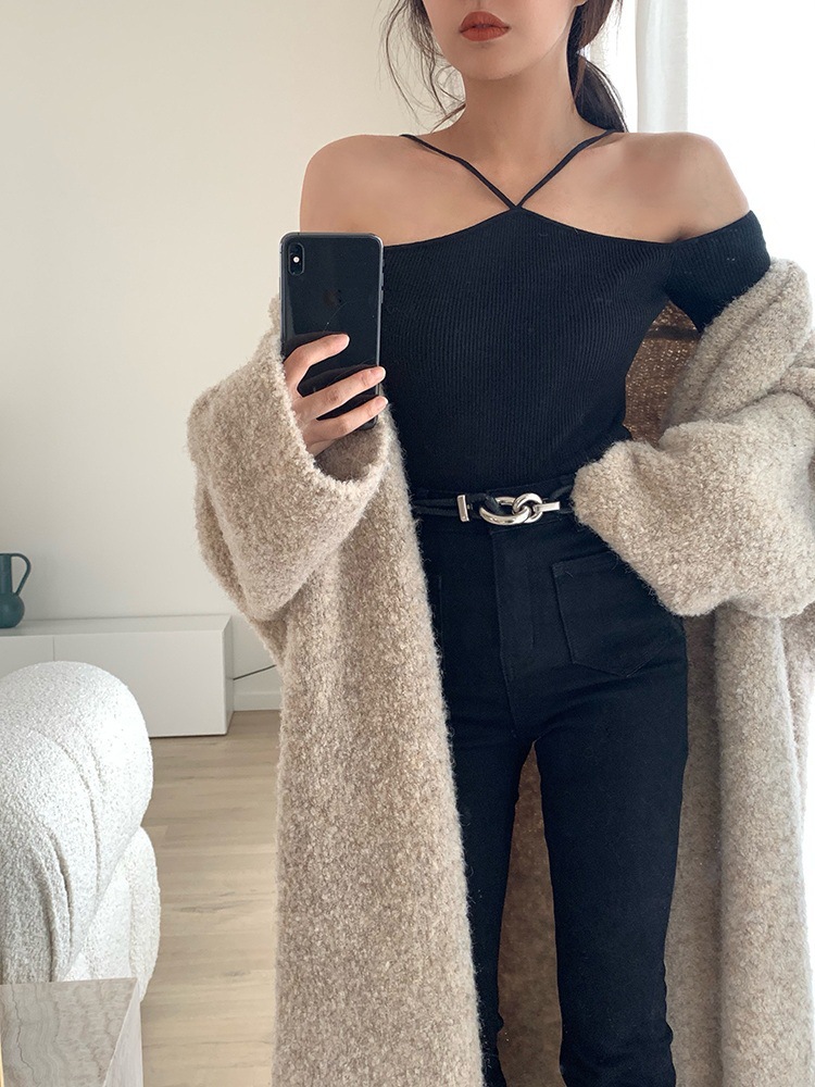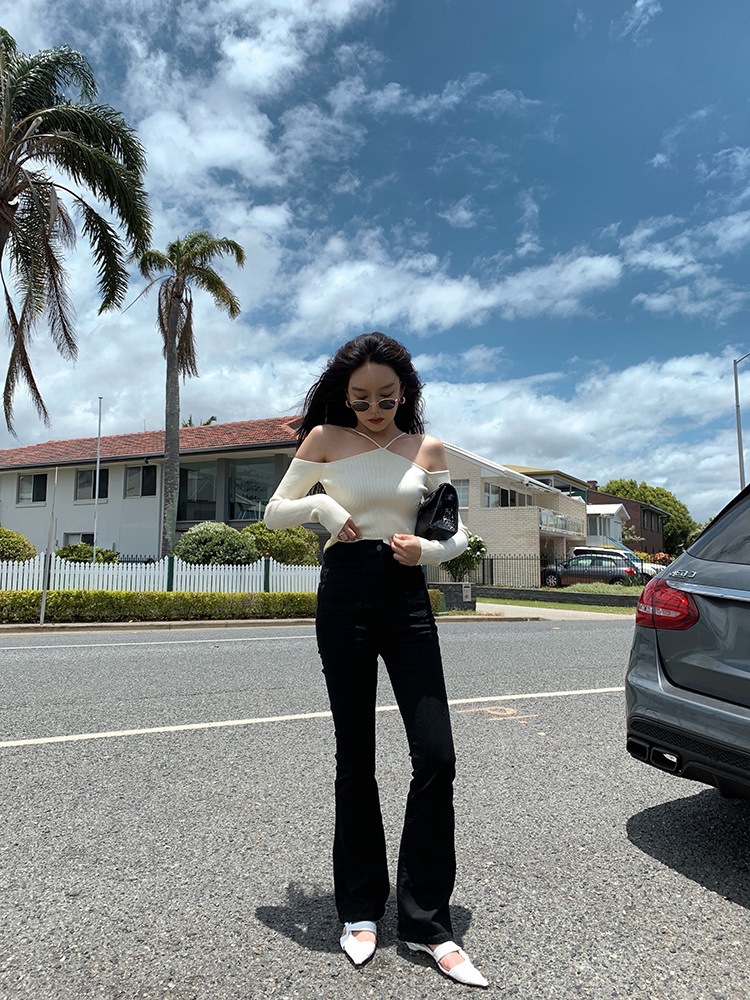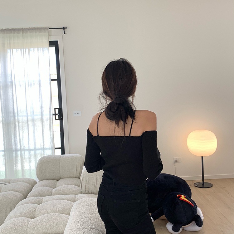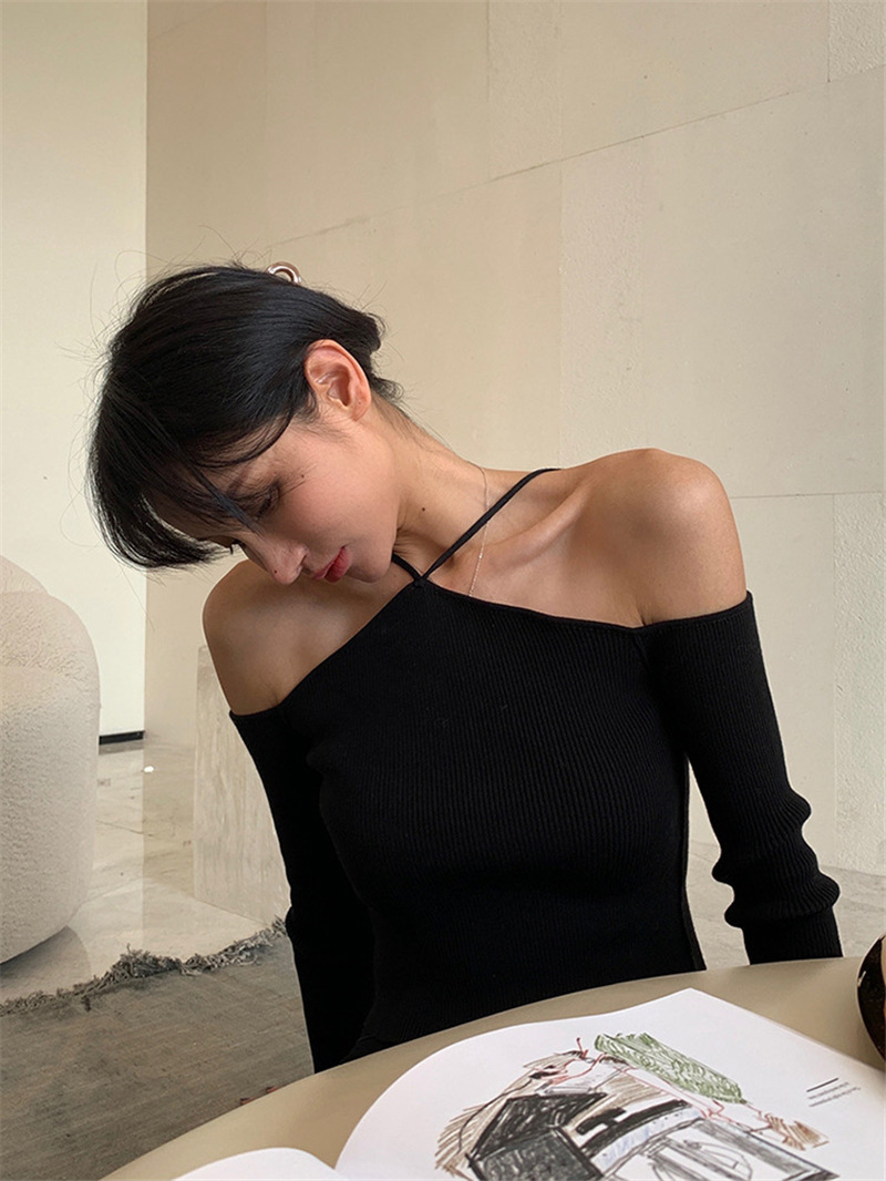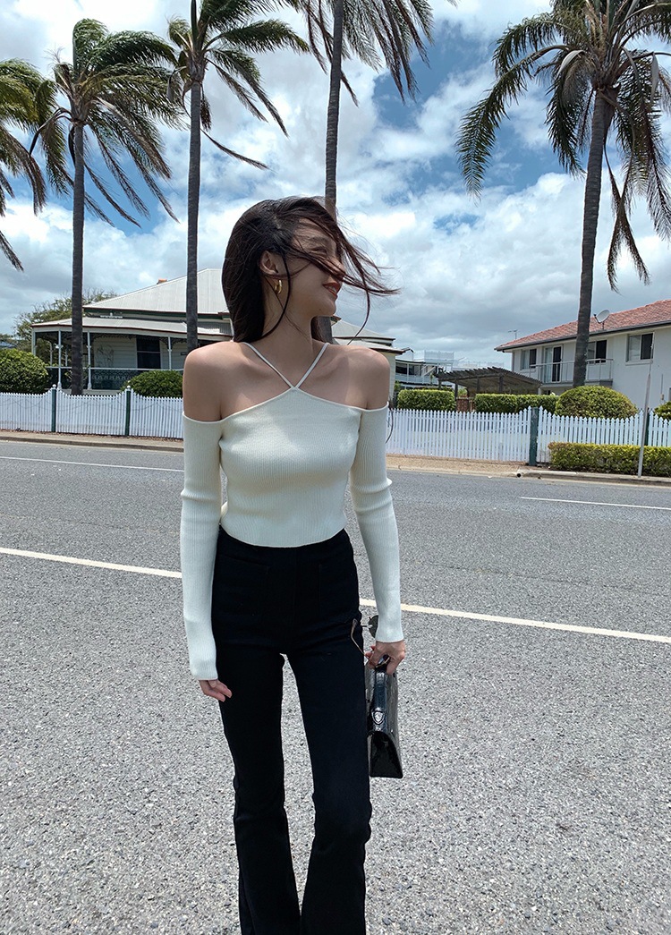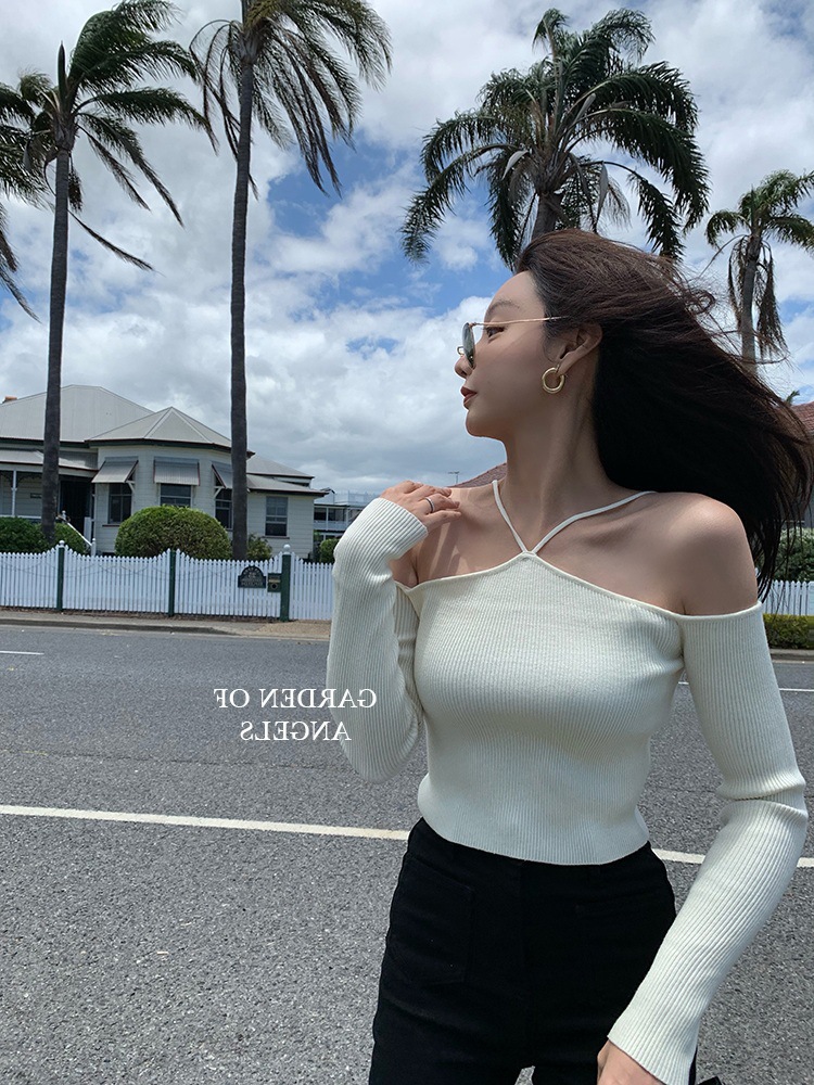 화이트 오프 숄더 디자인 센스 니치베이스 셔츠 여성의 2023 년 초 가을 새 목 섹시한 짧은 스웨터 탑