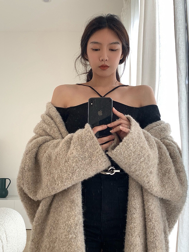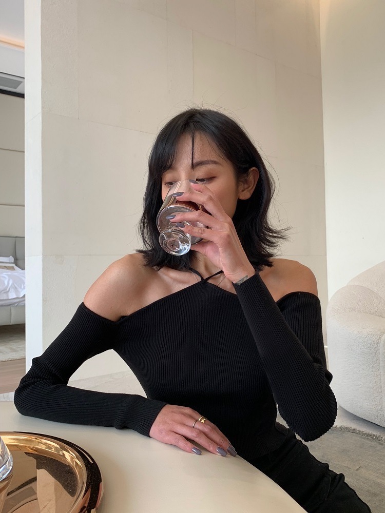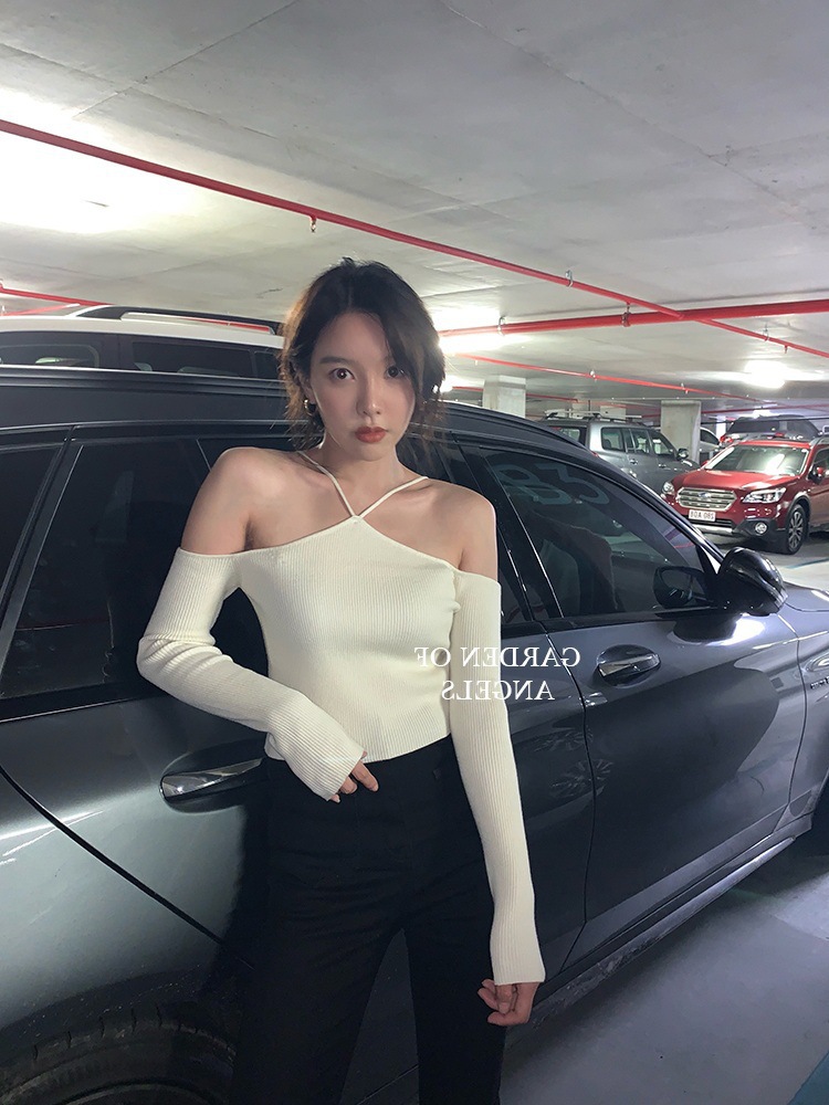 화이트 오프 숄더 디자인 센스 니치베이스 셔츠 여성의 2023 년 초 가을 새 목 섹시한 짧은 스웨터 탑스토어 가기
