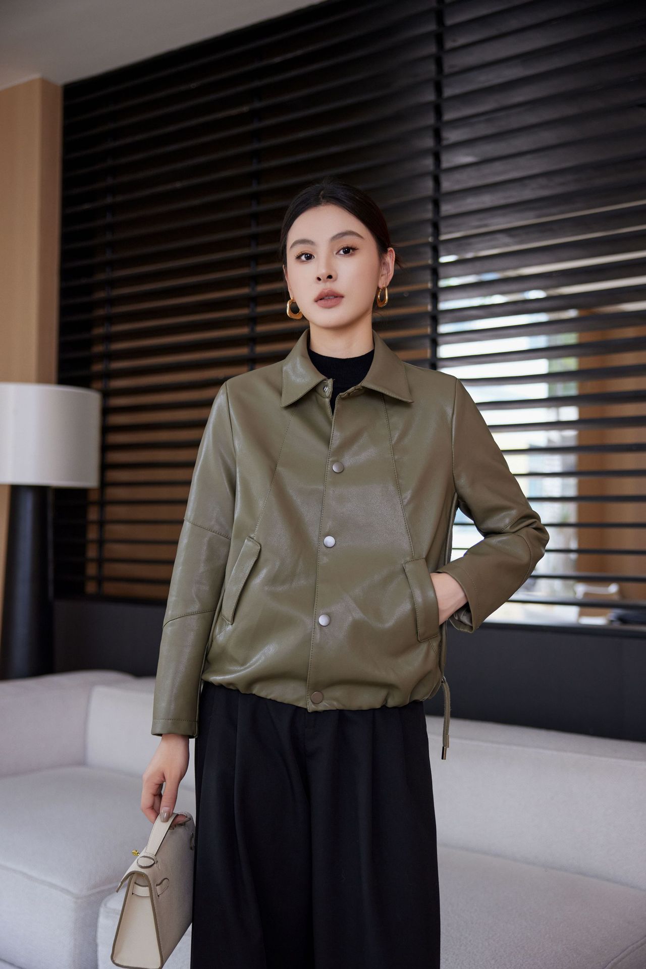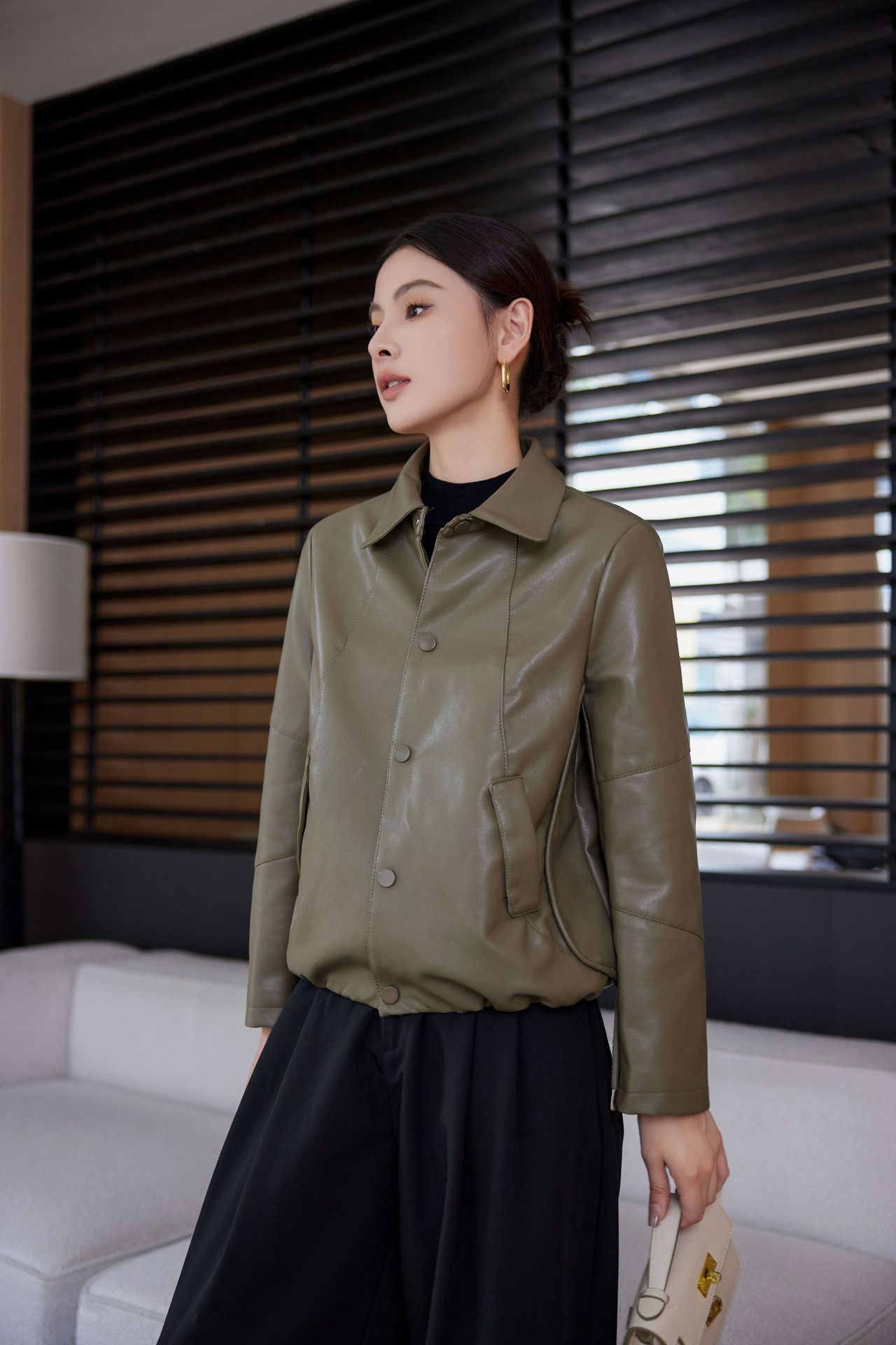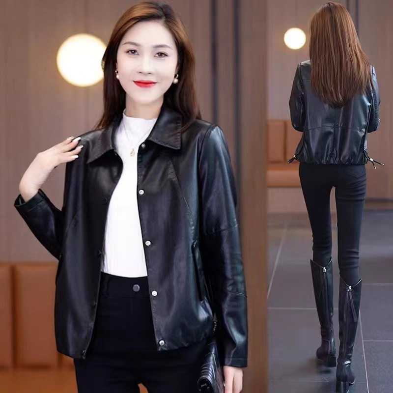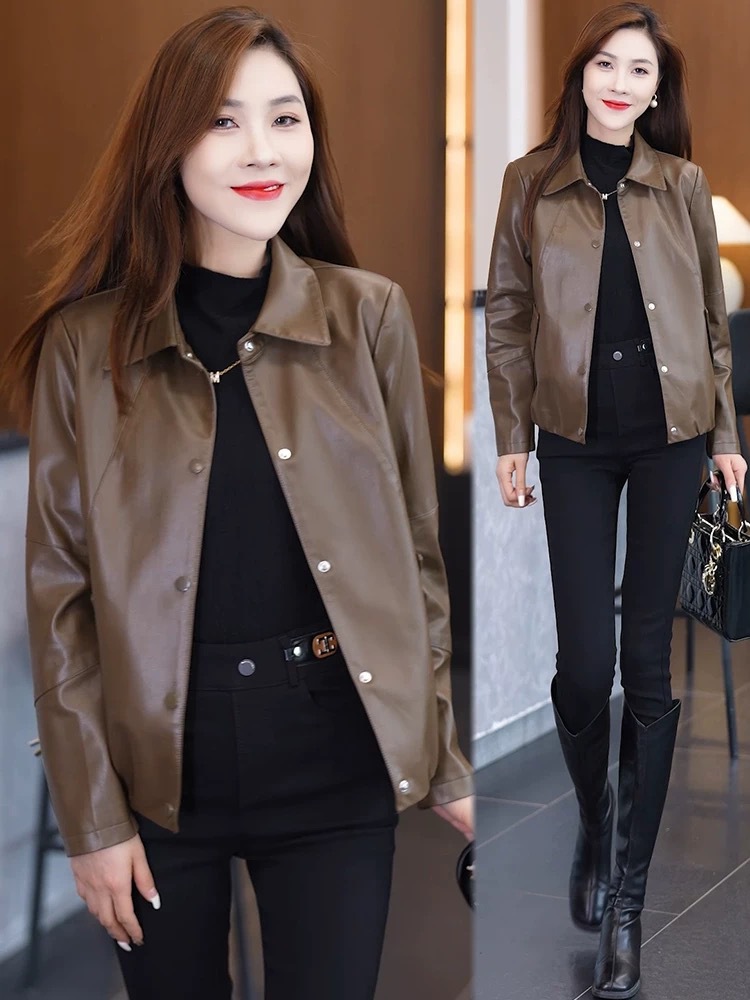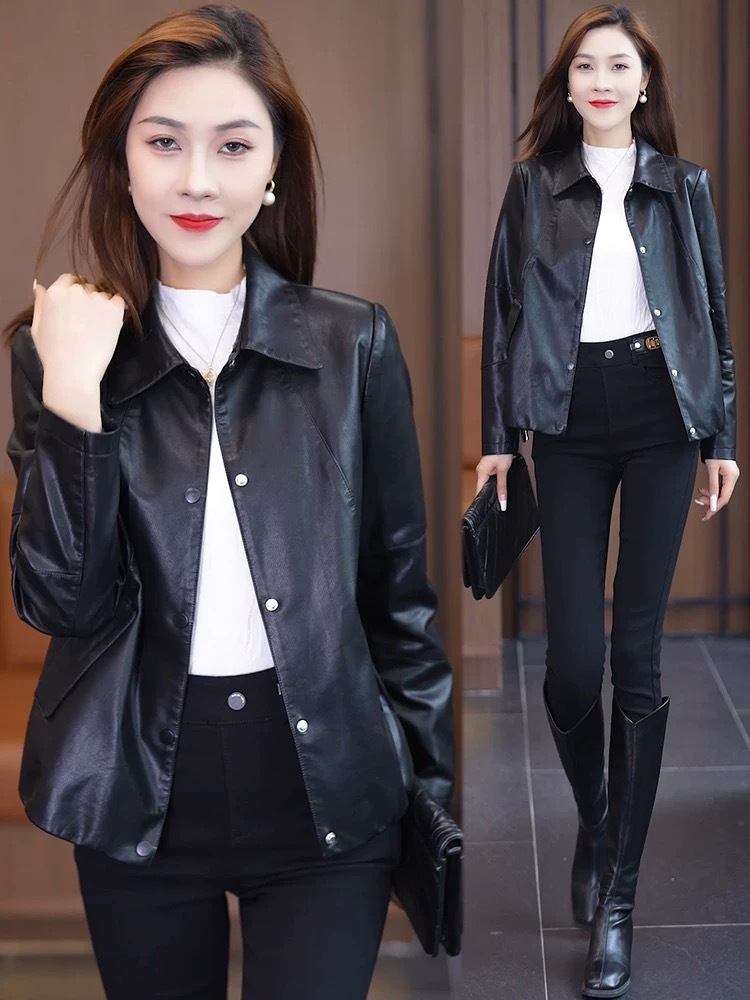 짧은 가죽 자켓 여성의 2024 봄 새로운 패션 우아한 슬림 룩 쁘띠 올 매치 가죽 자켓 탑스토어 가기