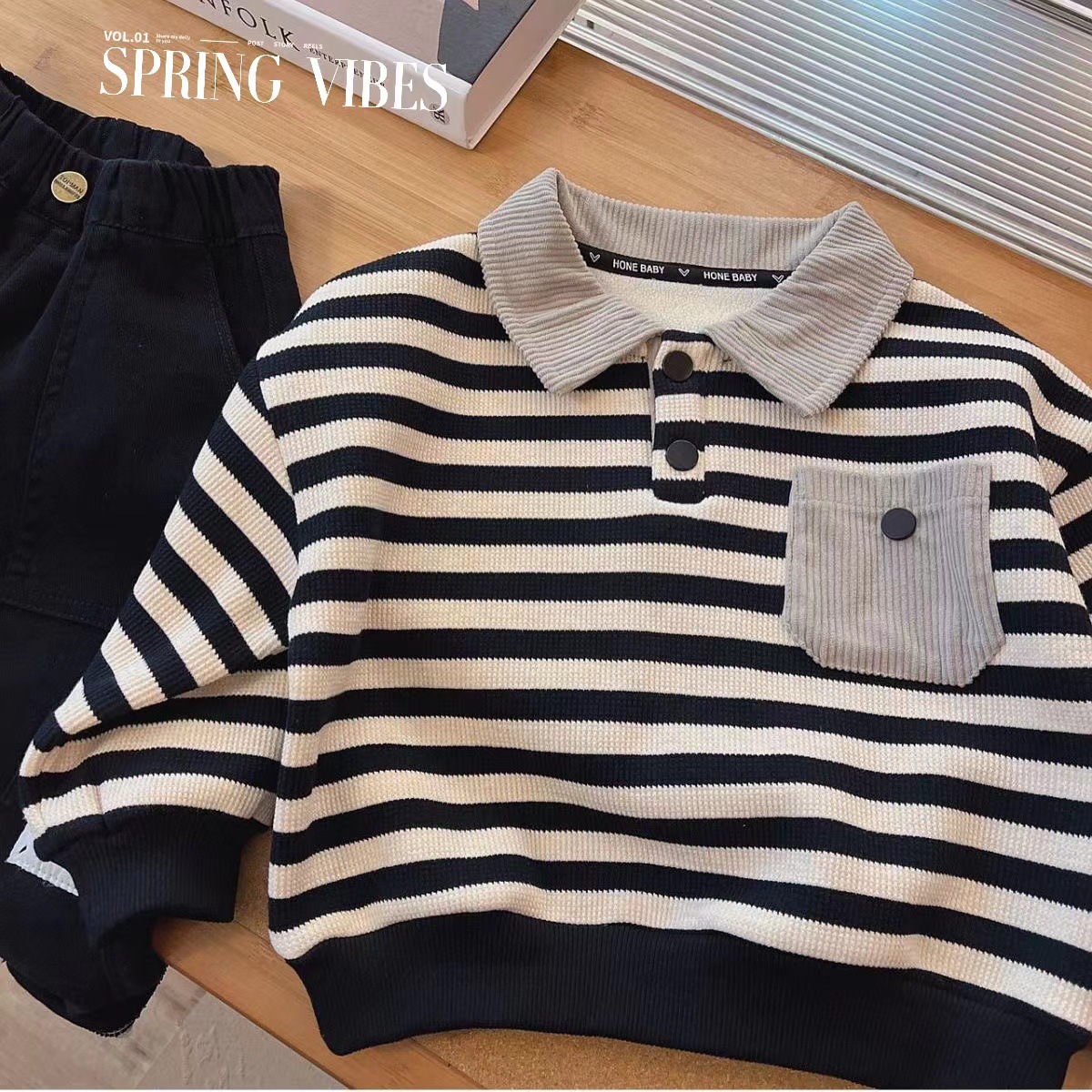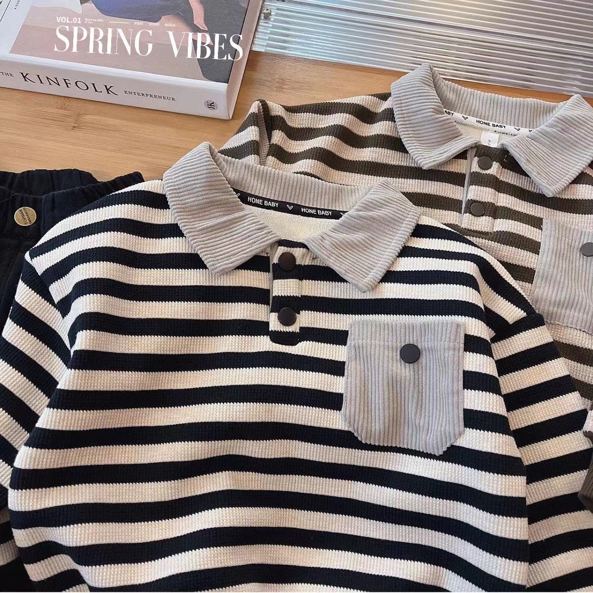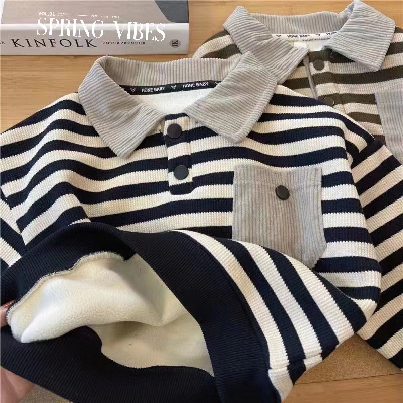 소년 겨울 기모 스웨터 2024 새로운 아기 긴팔 POLO 셔츠 한국 줄무늬 어린이 원피스 벨벳.