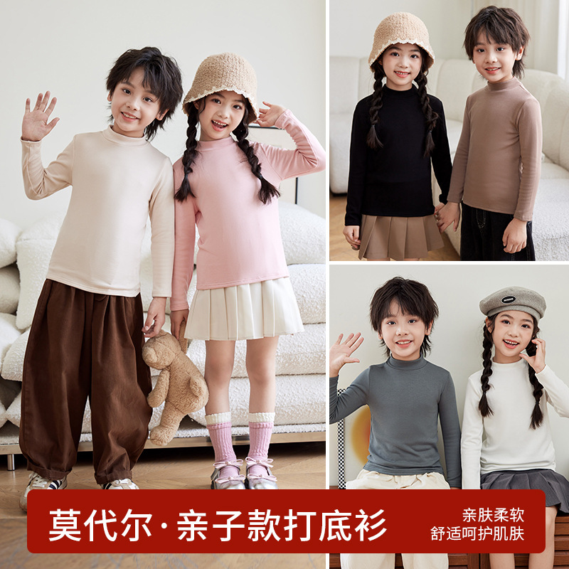 어린이 가을 및 겨울 모달 면 샌딩 베이스 셔츠 중간 칼라 여성 남성 어린이 최고 싱글 피스 아동복 긴팔 패밀리 의류