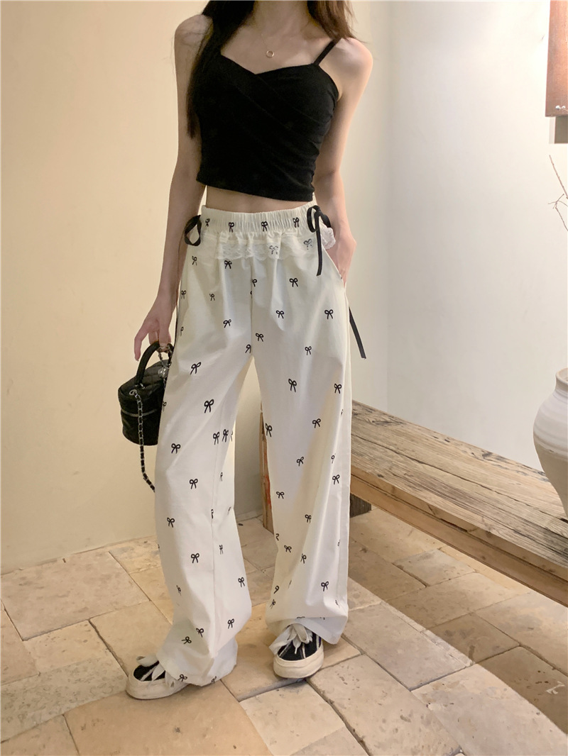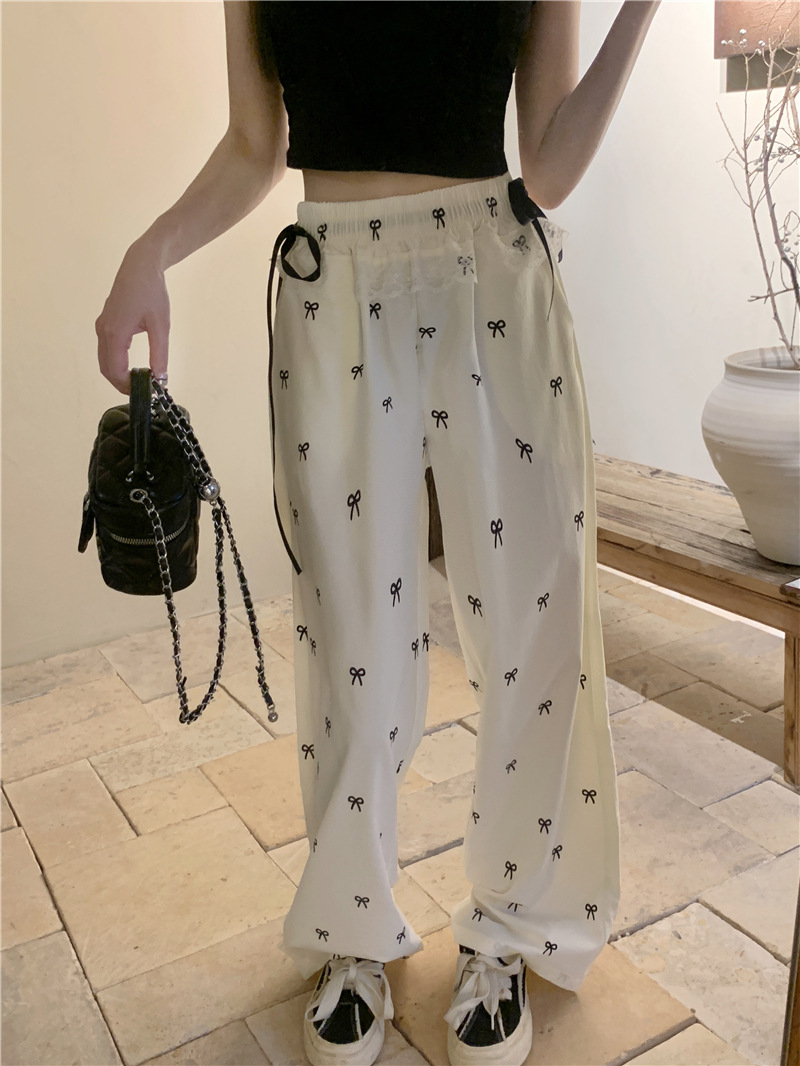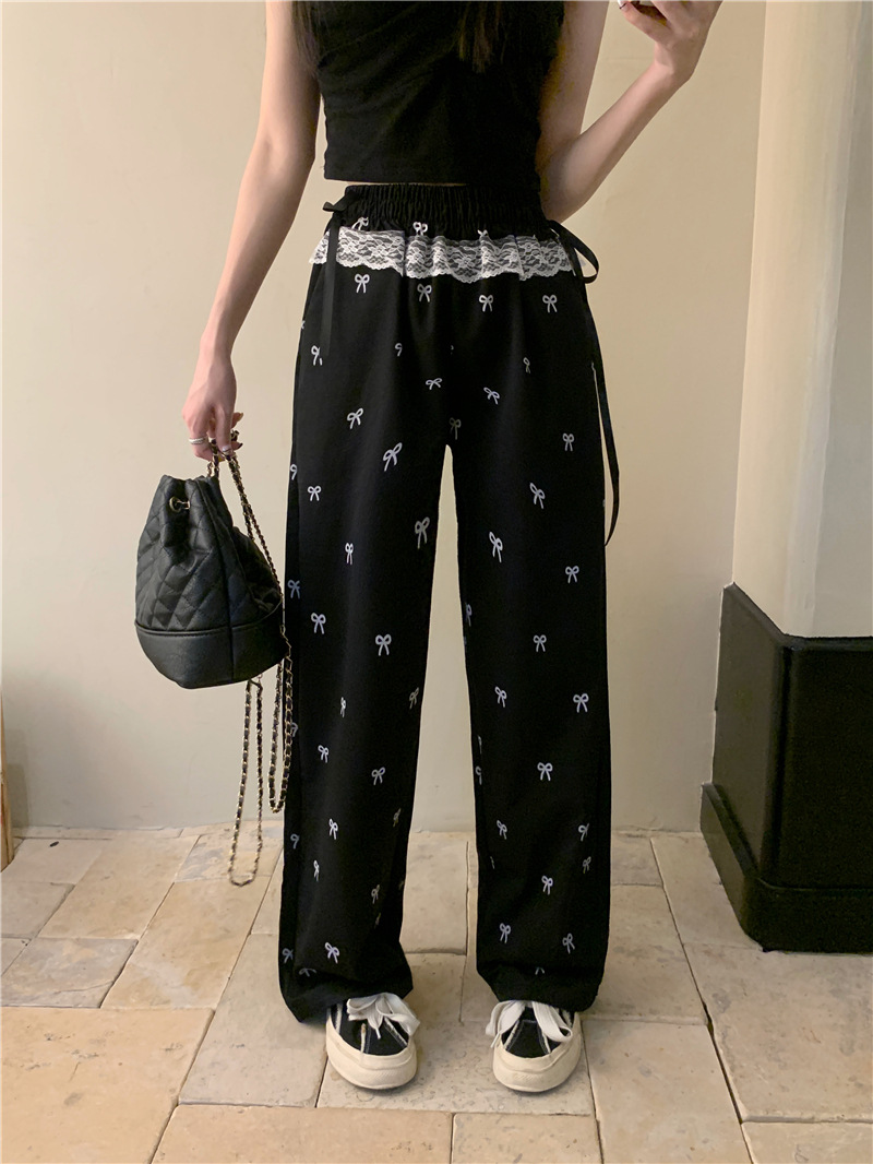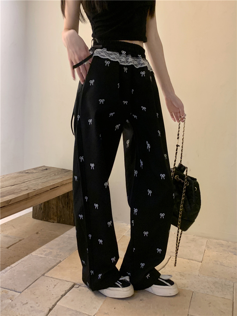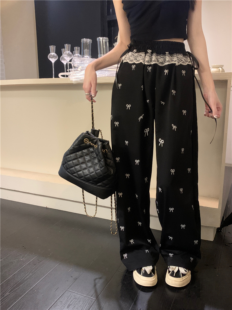 달콤한 스파이스 소녀 활 레이스 바느질 캐주얼 바지 여성 가을 디자인 감각 느슨한 느슨한 느슨한 허리 넓은 다리 바지 스트레이트 다리 바지