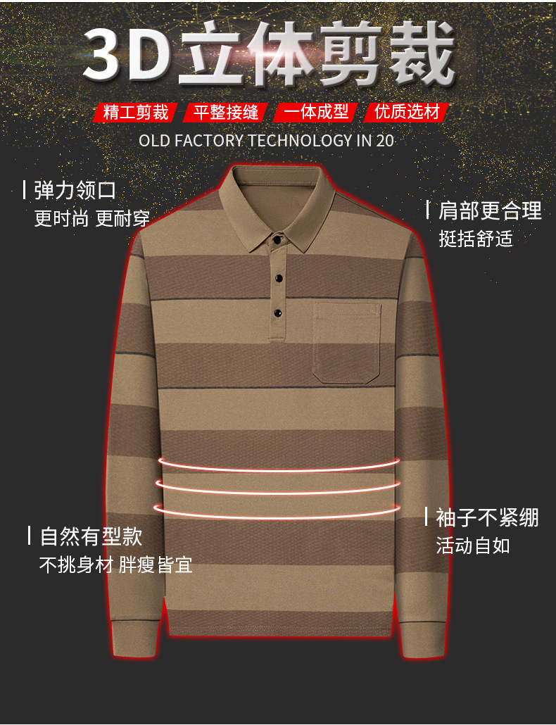 봄과 가을 새로운 남성 와이드 스트라이프 긴팔 티셔츠 Lel Real Pocket Base 중년 및 노인 POLO 셔츠를위한 스킨 친화적 인 탑스토어 가기