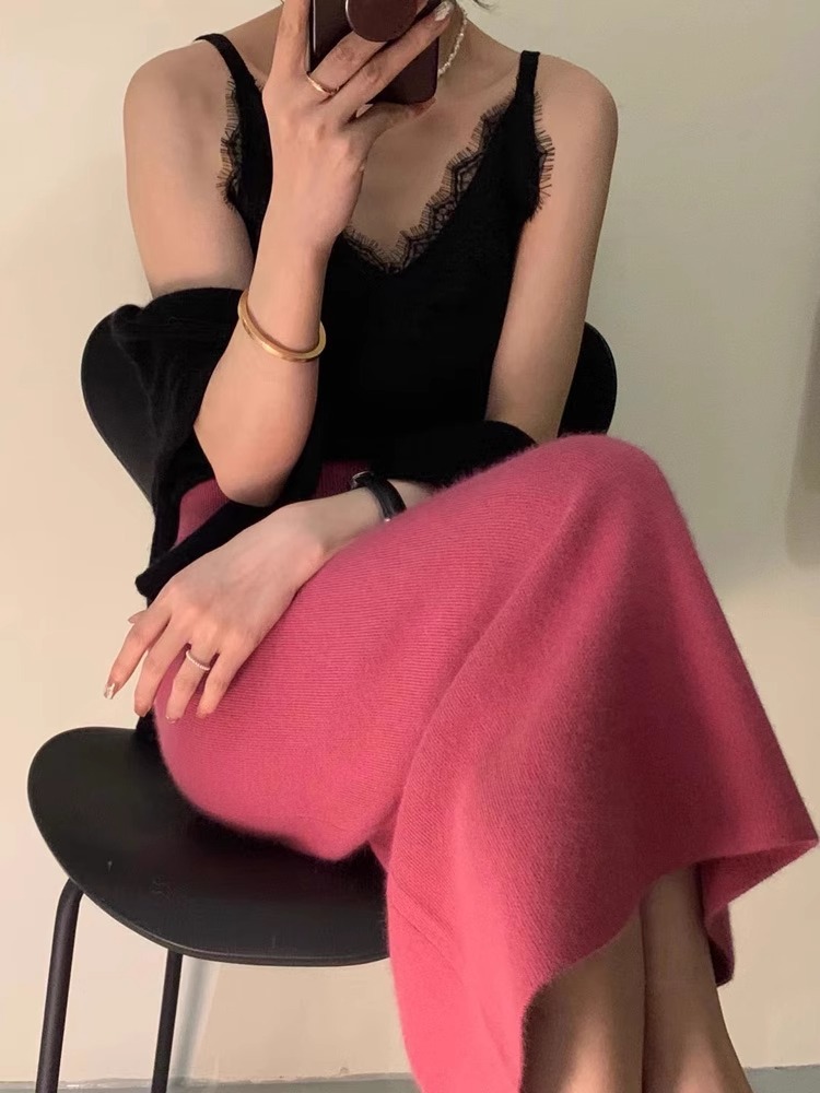 모조 너구리 양털 오버 스커트 여성 가을 및 겨울 높은 허리 엉덩이 리프팅 우아한 슬림 무릎 스커트 여성용 스커트 겨울 스웨터