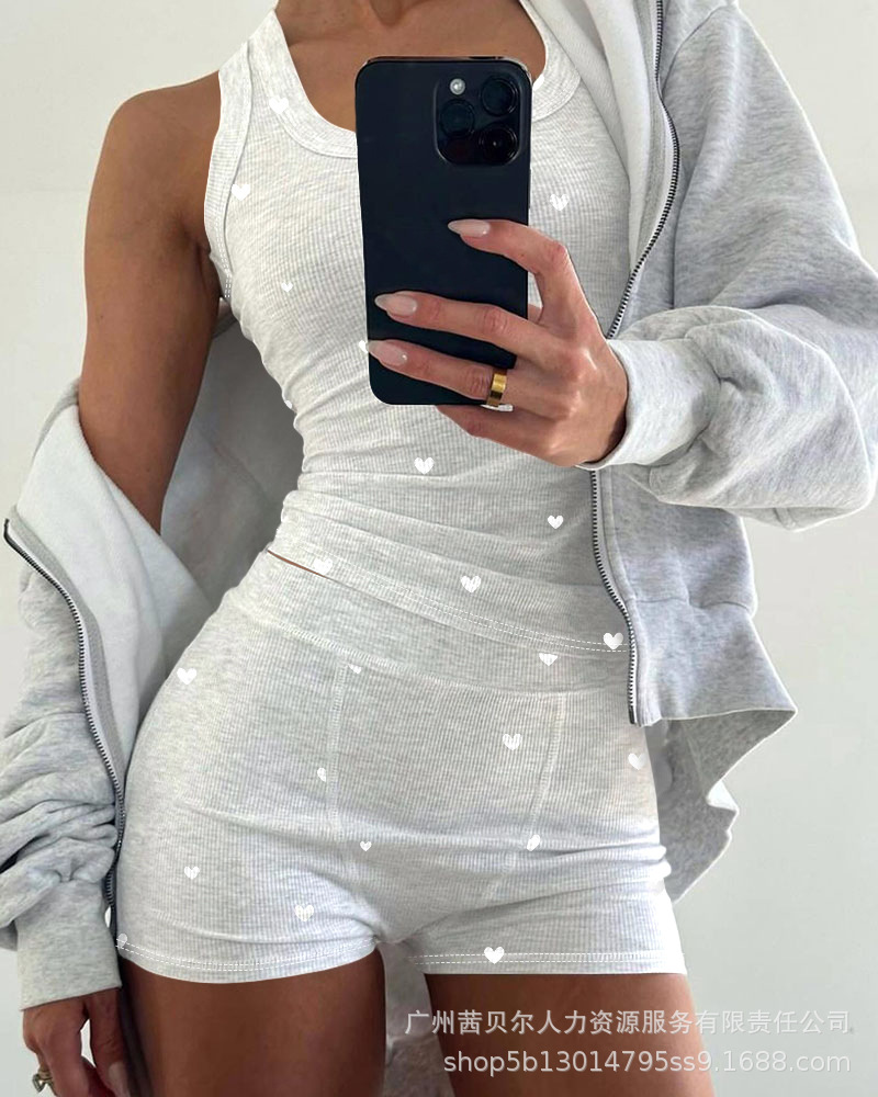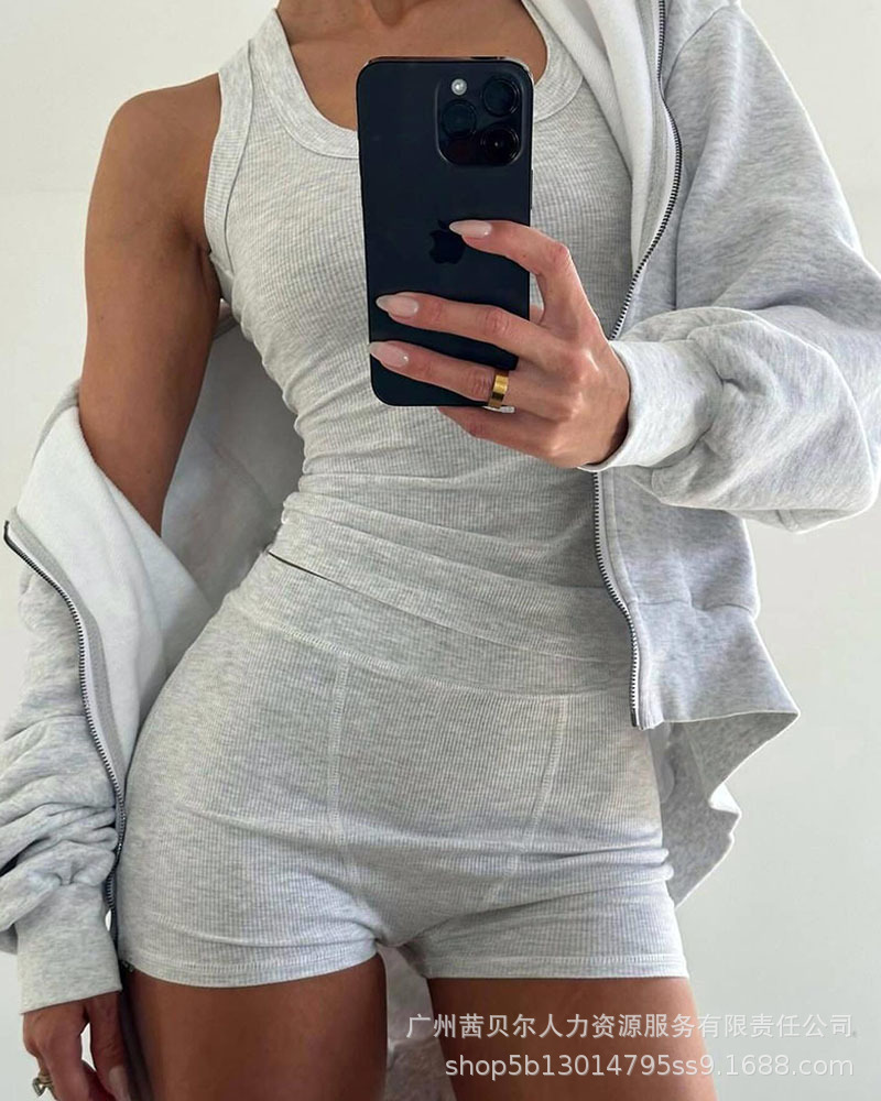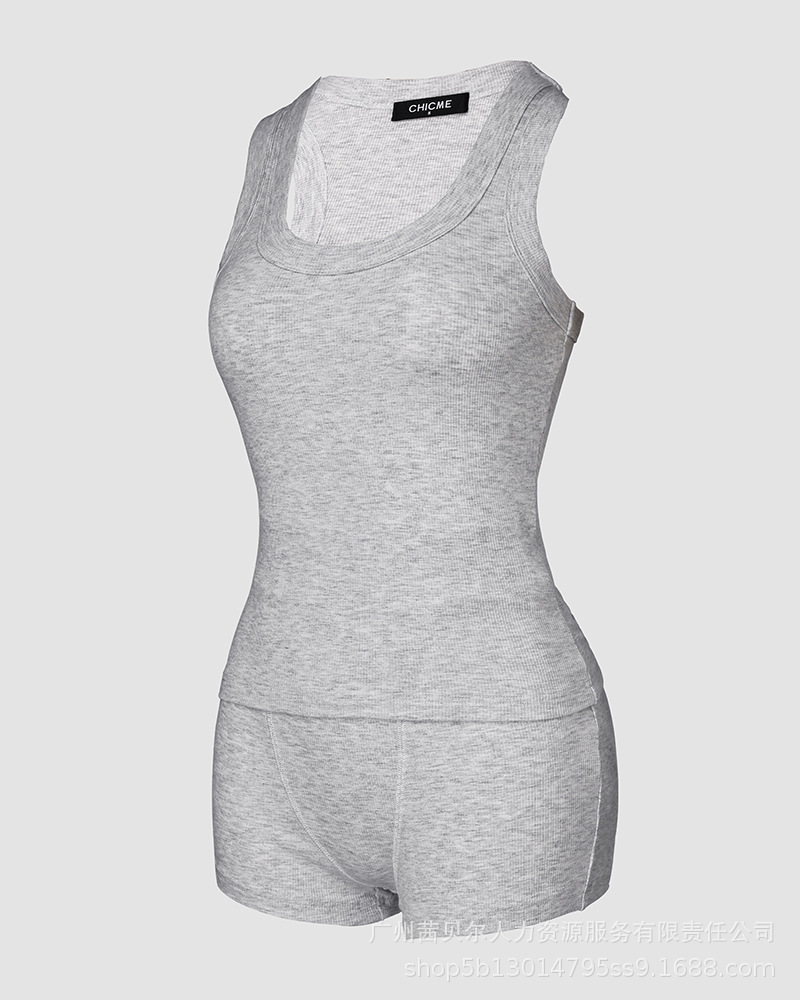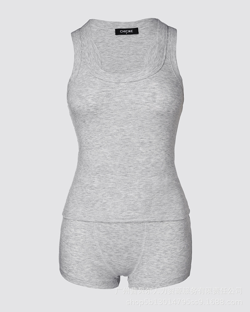 LZR18849 라이트 그레이 U 칼라 리브 조끼 반바지 세트 2 피스 세트
