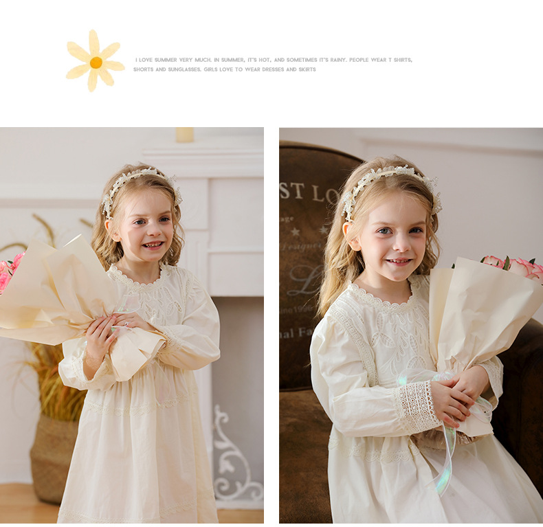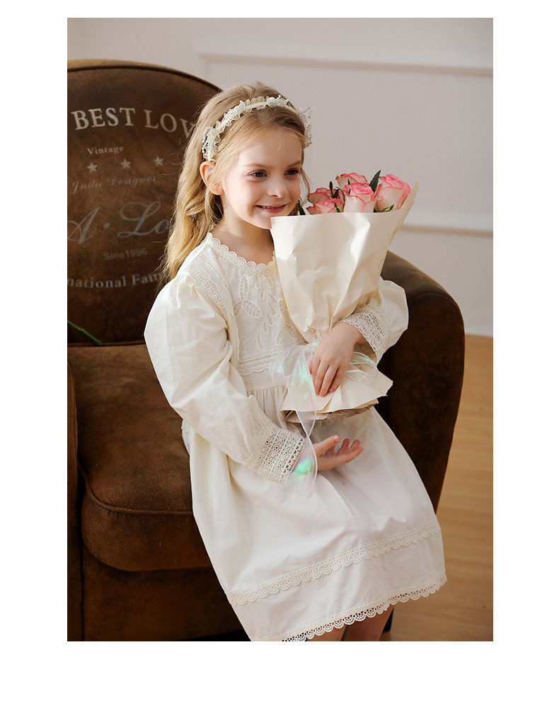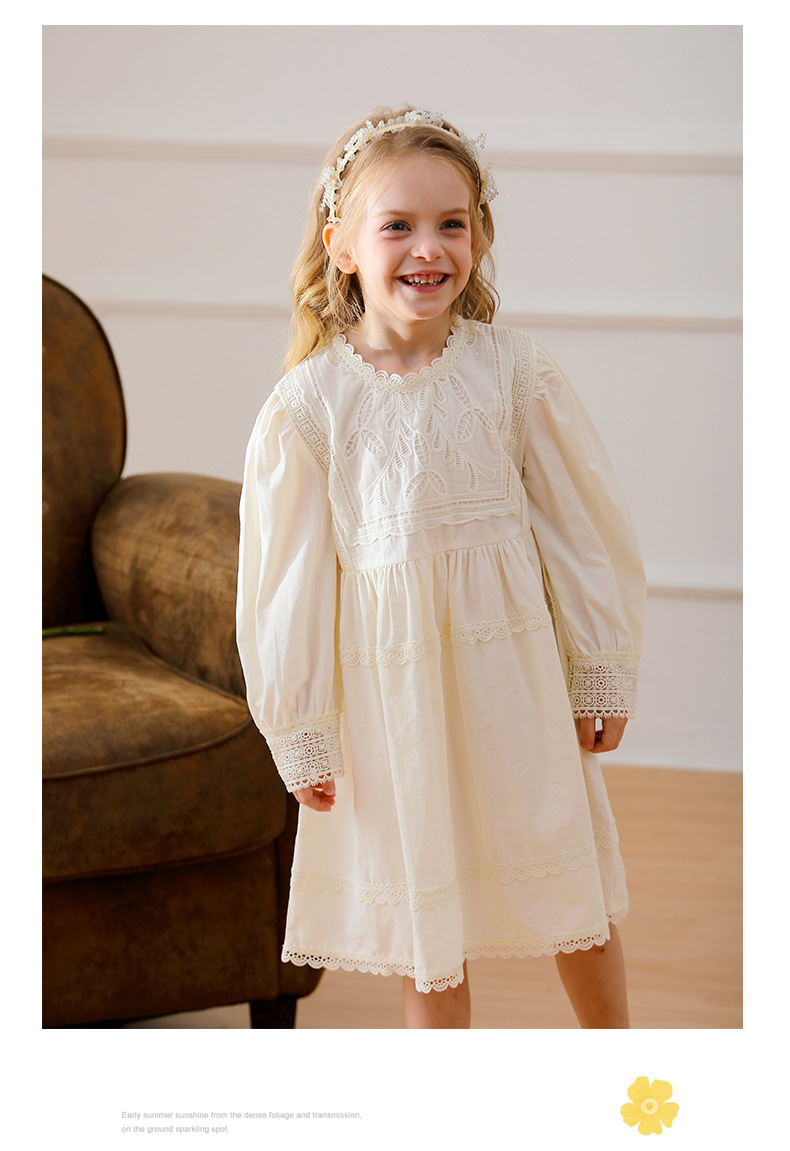 프랑스 스타일 레이스 우아한 소녀 원피스 2024 한국 아동복 둥근 목 긴 소매 면화 소녀 공주 원피스스토어 가기