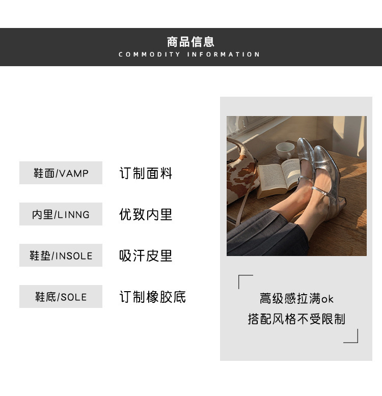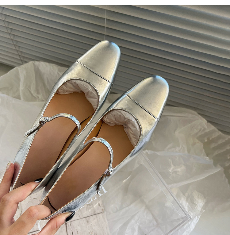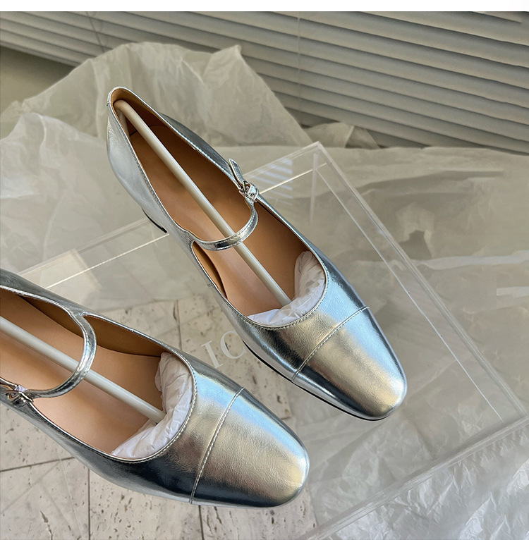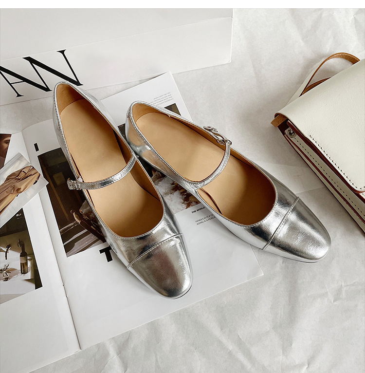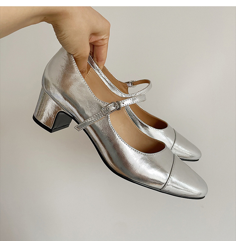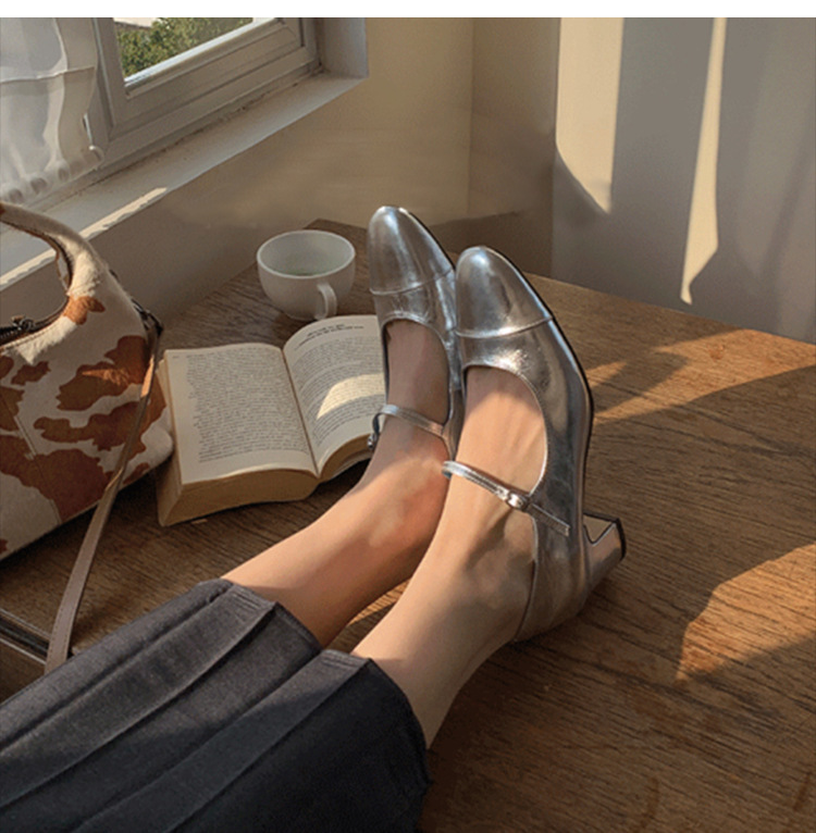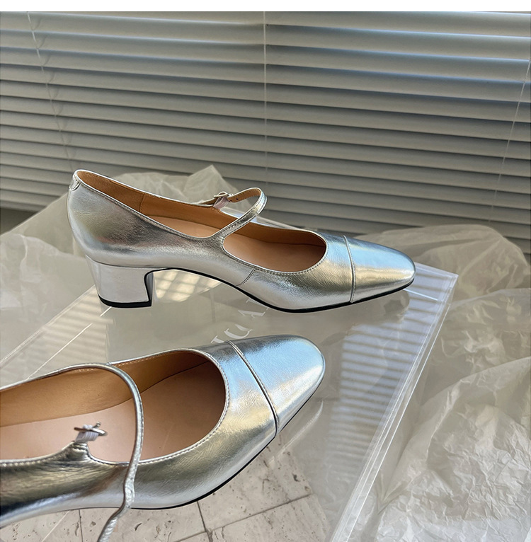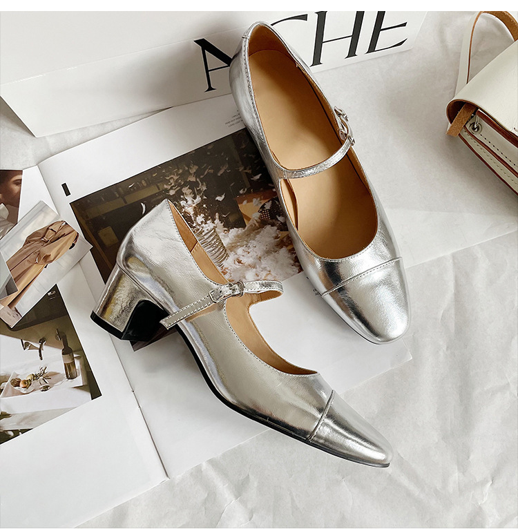 재고 있음 ~ 여성용 실버 화이트 정품 가죽 프랑스 신발의 양가죽 버전 2025 새로운 두꺼운 뒤꿈치 메리 제인 작은 가죽 신발스토어 가기