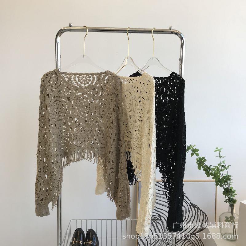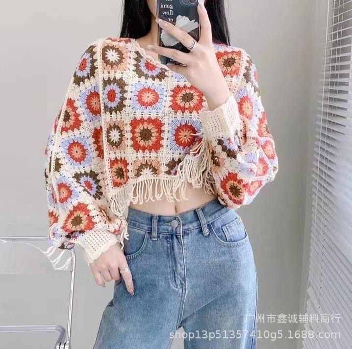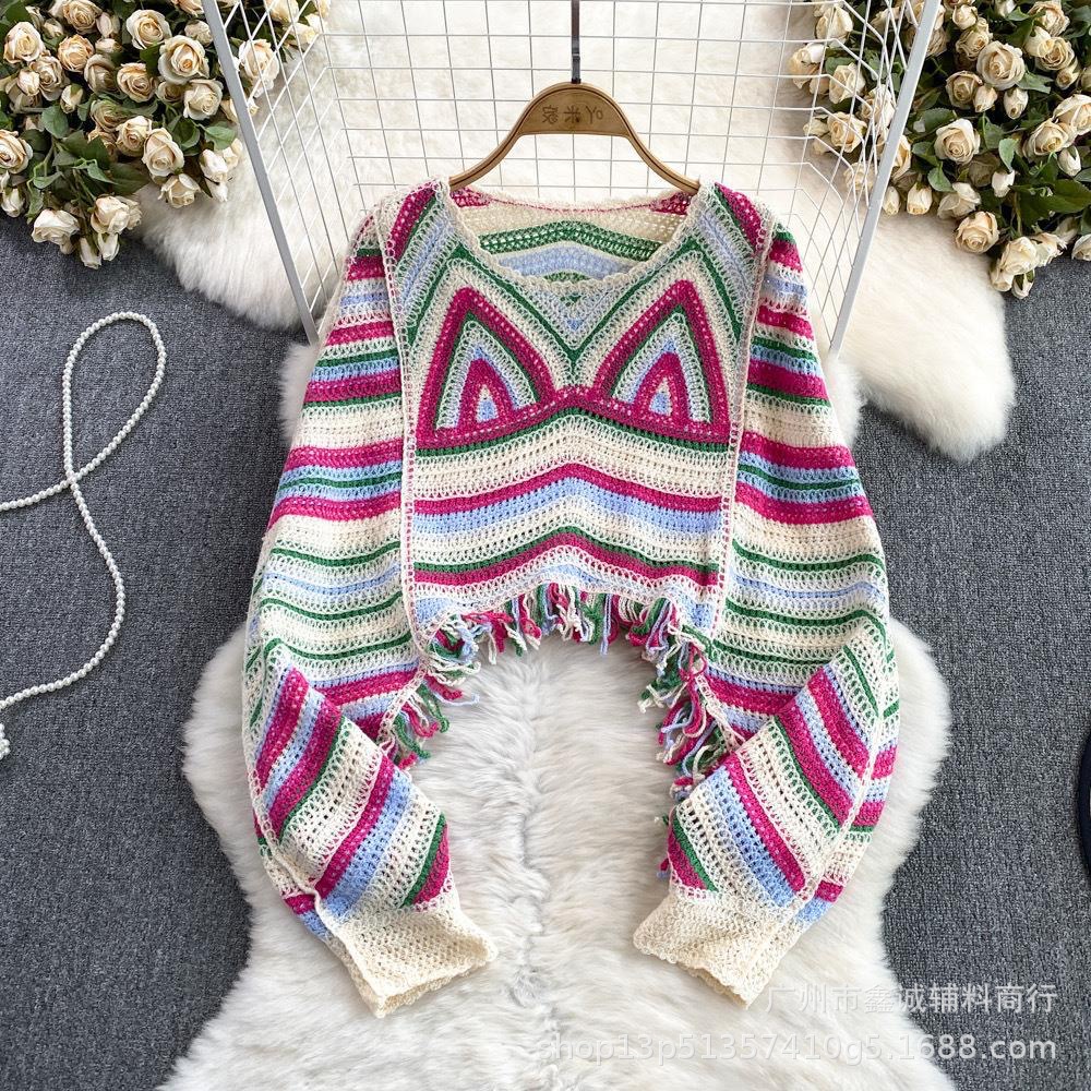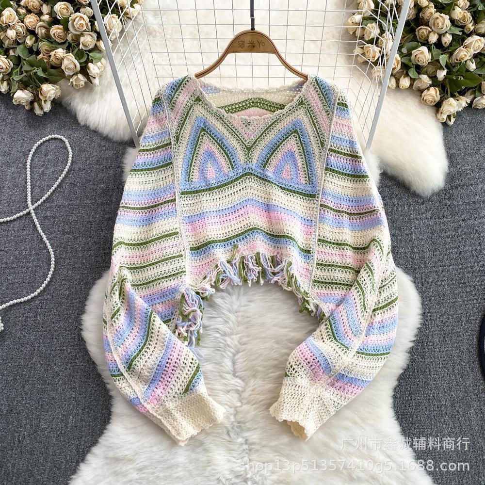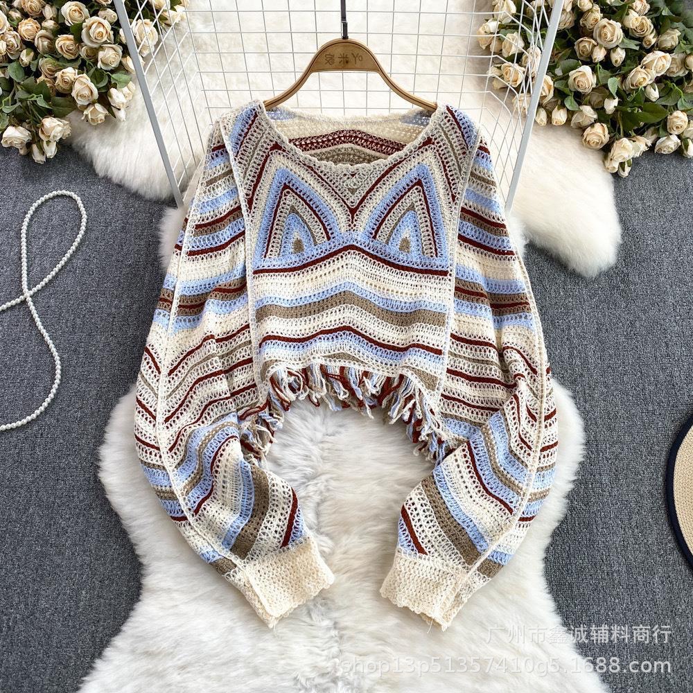 빈티지 라운드 넥 박쥐 소매 대조 컬러 할로우 짧은 술 긴 소매 스웨터 유행 우아한 느슨한 슬림 탑
