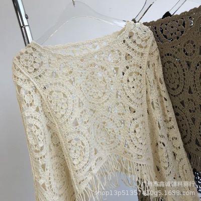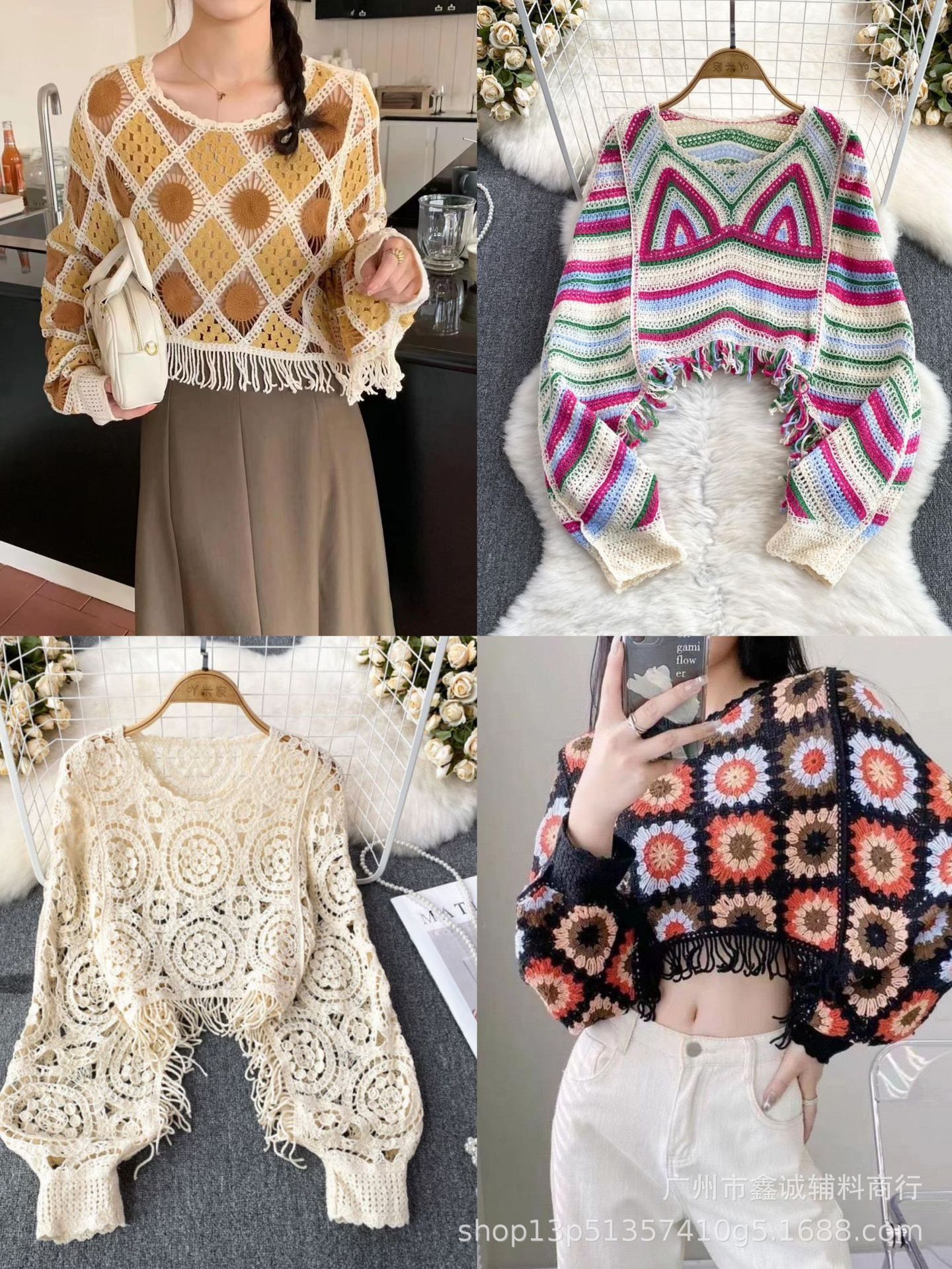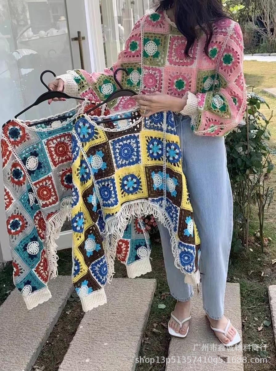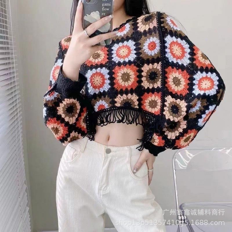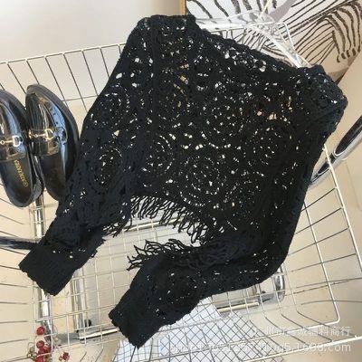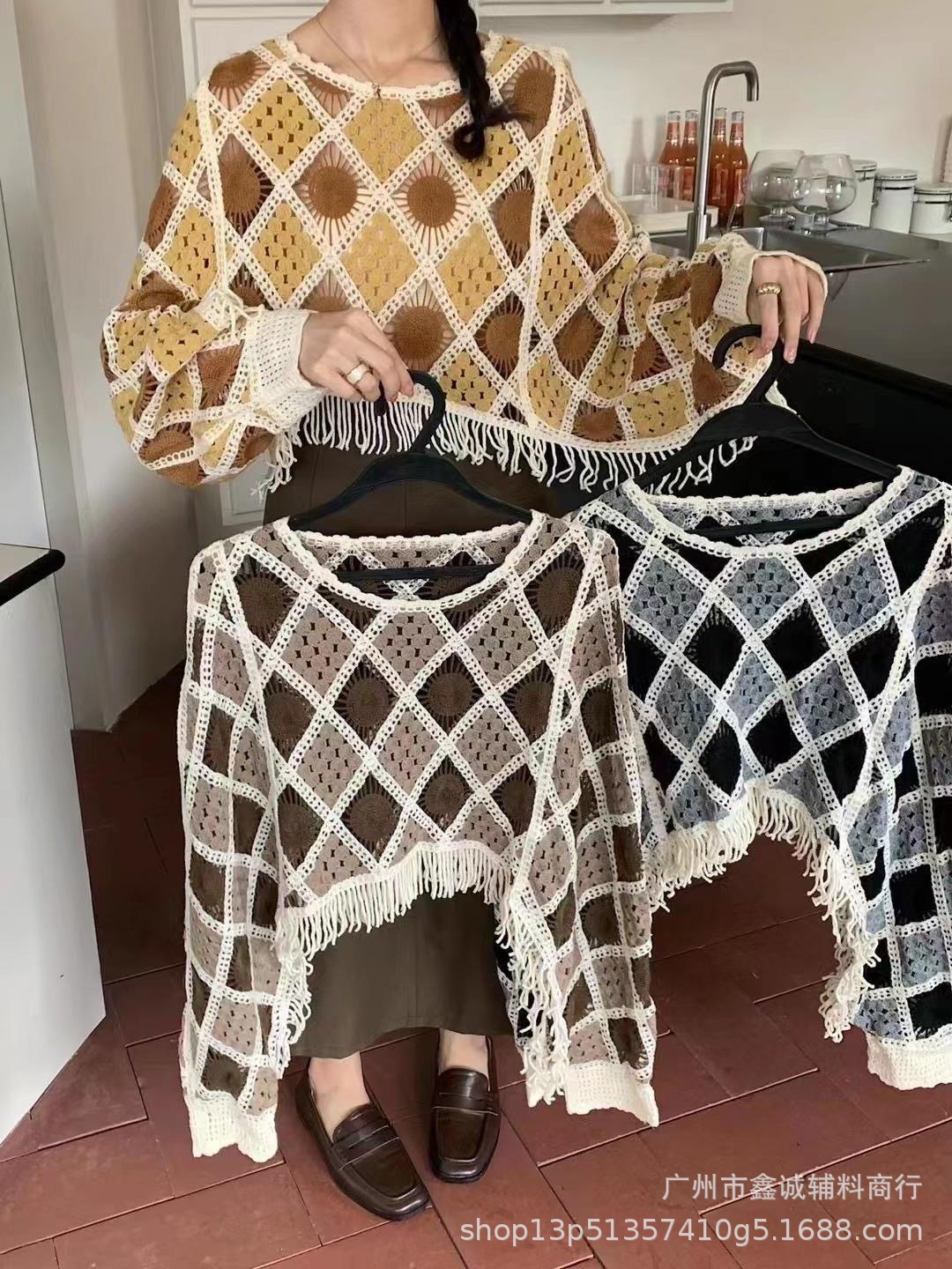 빈티지 라운드 넥 박쥐 소매 대조 컬러 할로우 짧은 술 긴 소매 스웨터 유행 우아한 느슨한 슬림 탑