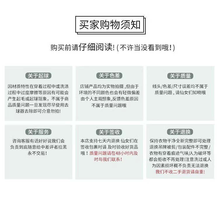 关于售后:偶有存在线头杂线/三标不全(剪标无吊牌)/抽丝等不影响穿着的小问题,介意勿拍有现货的一般1-2天内发走,个别款很慢的2天内未发出会留言.节假日会在3天左右发走,默认发中通快递