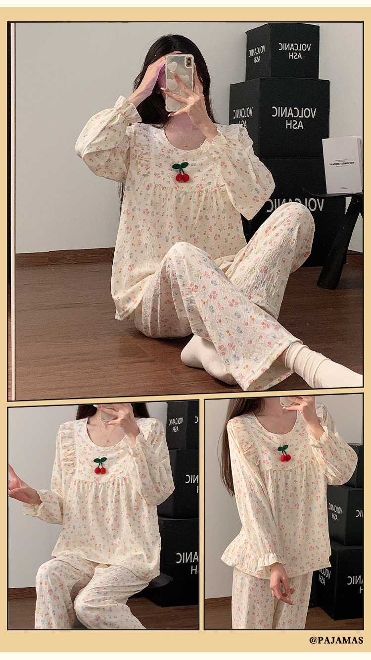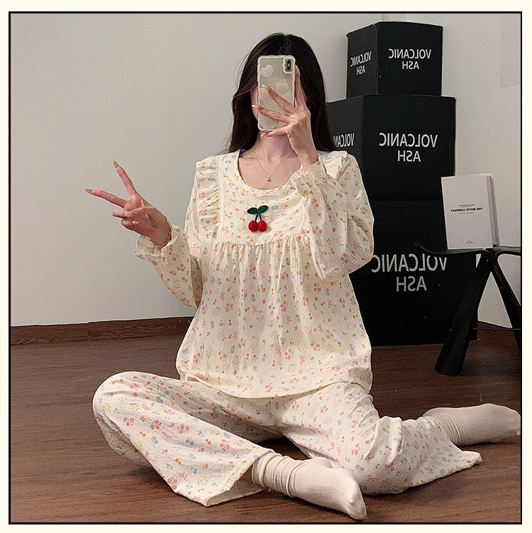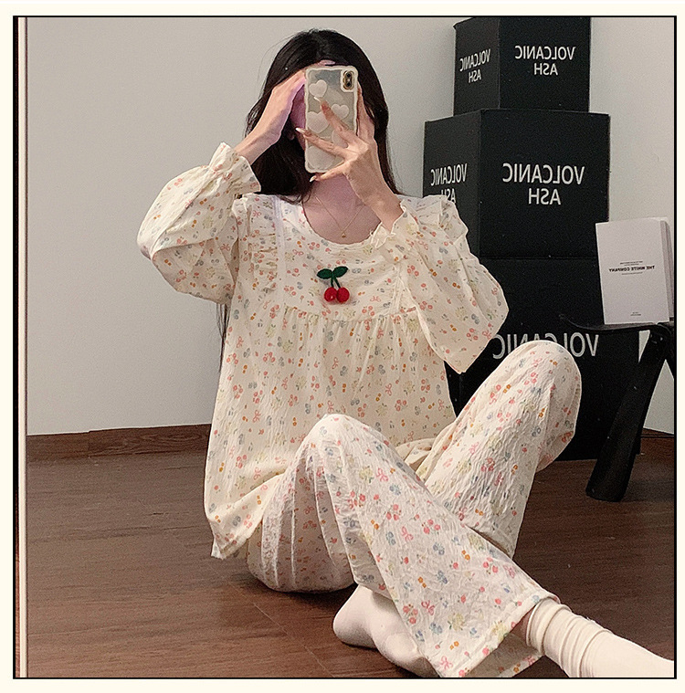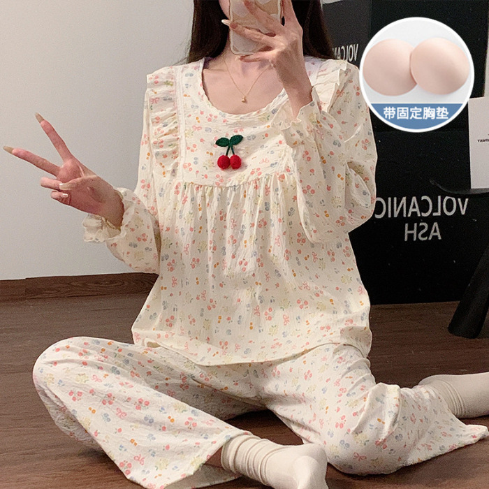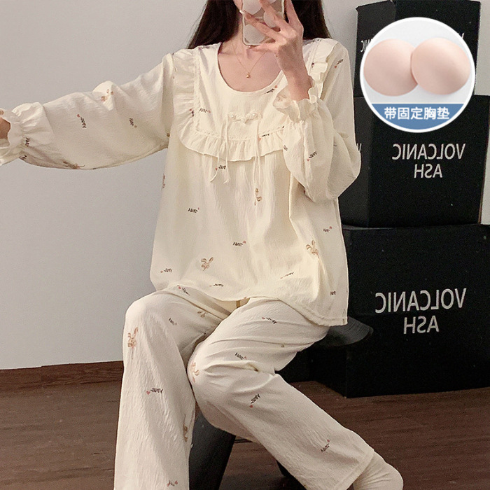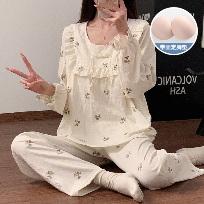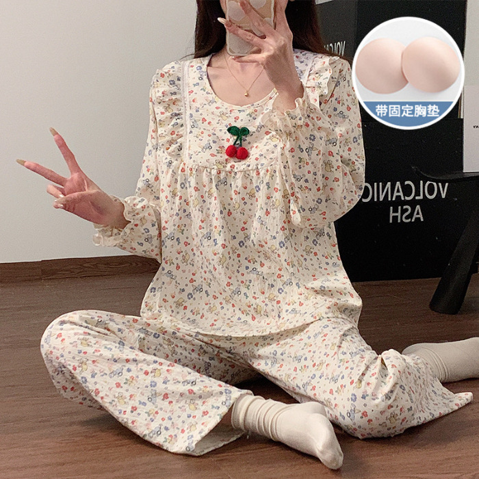 봄과 가을 새로운 잠옷 여자 가슴 패드 짠 구름 코튼 긴 소매 달콤한 귀여운 공주 스타일 홈 의류 세트스토어 가기