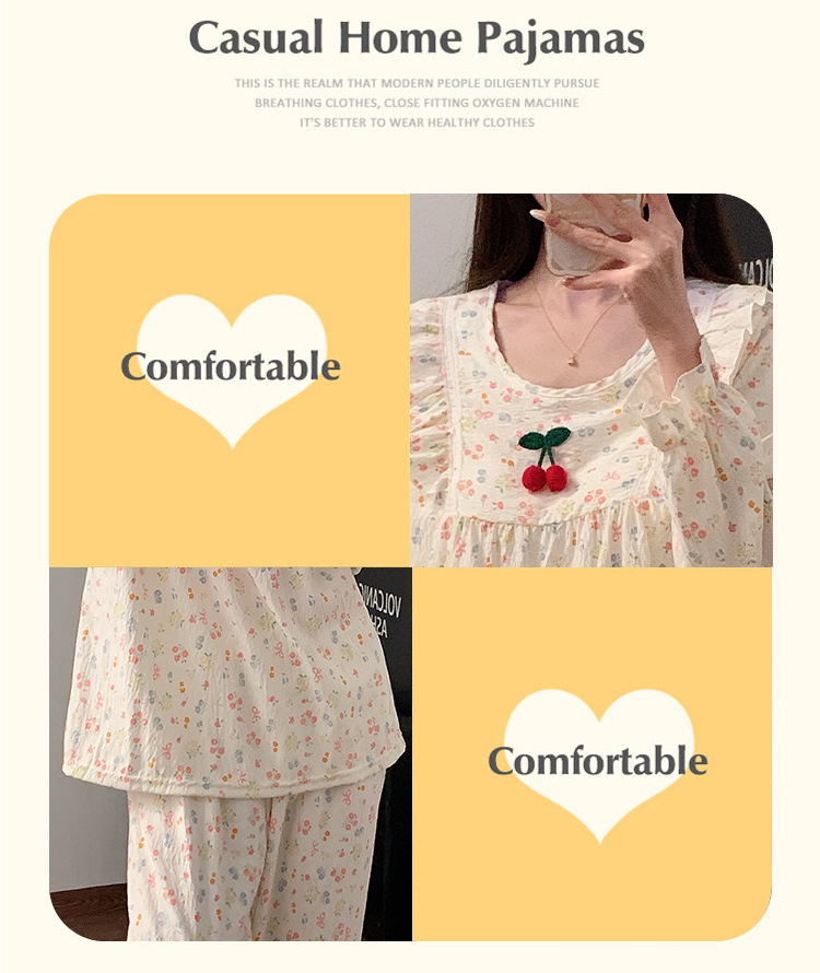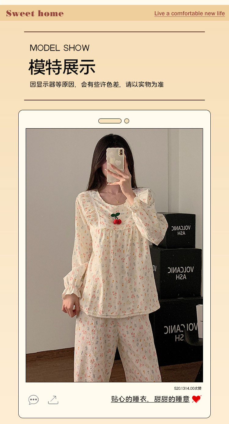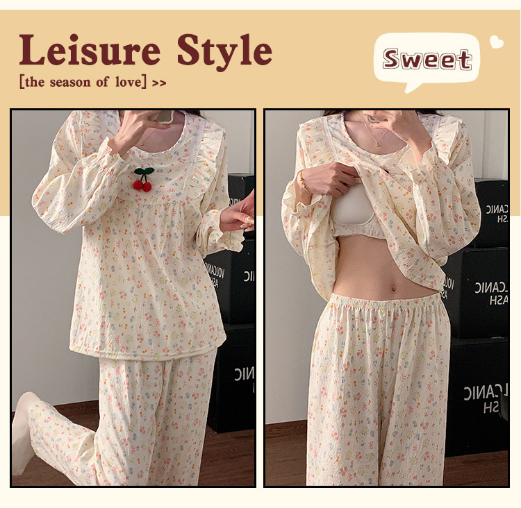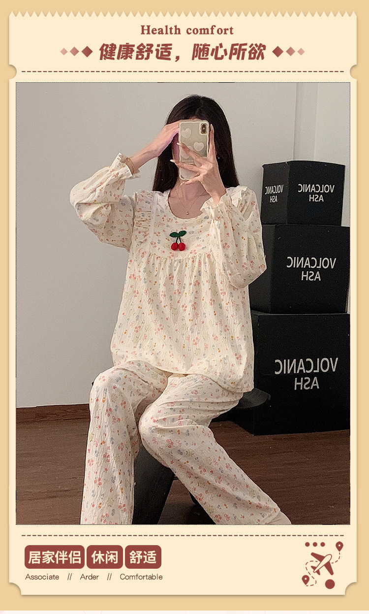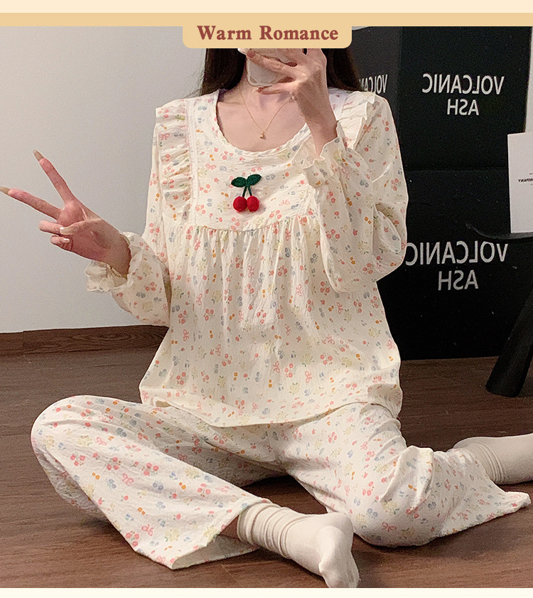 봄과 가을 새로운 잠옷 여자 가슴 패드 짠 구름 코튼 긴 소매 달콤한 귀여운 공주 스타일 홈 의류 세트스토어 가기