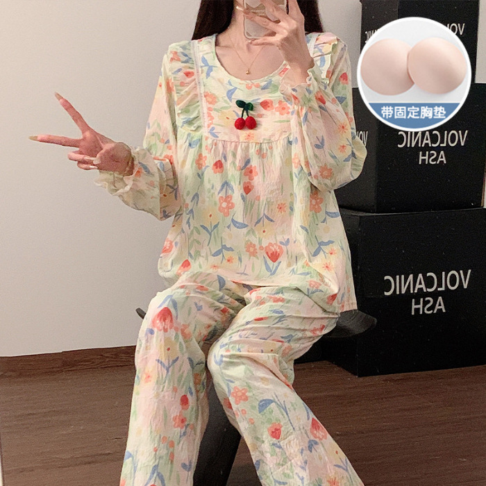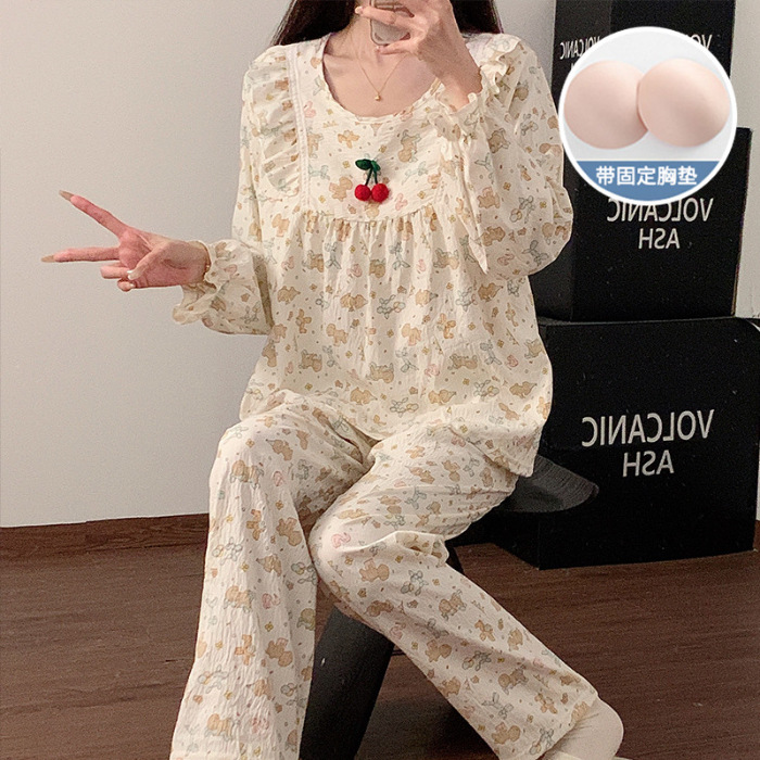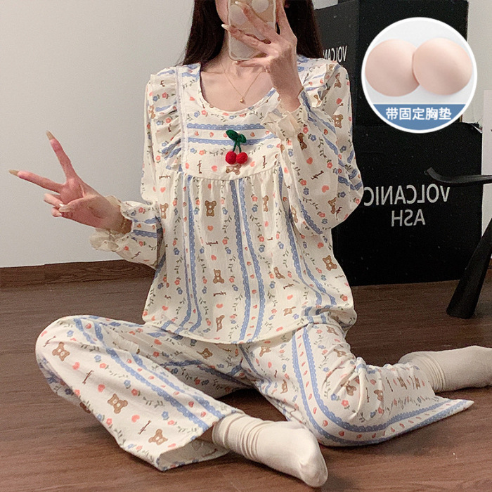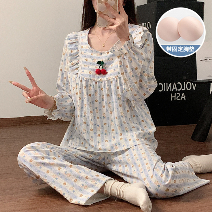 봄과 가을 새로운 잠옷 여자 가슴 패드 짠 구름 코튼 긴 소매 달콤한 귀여운 공주 스타일 홈 의류 세트