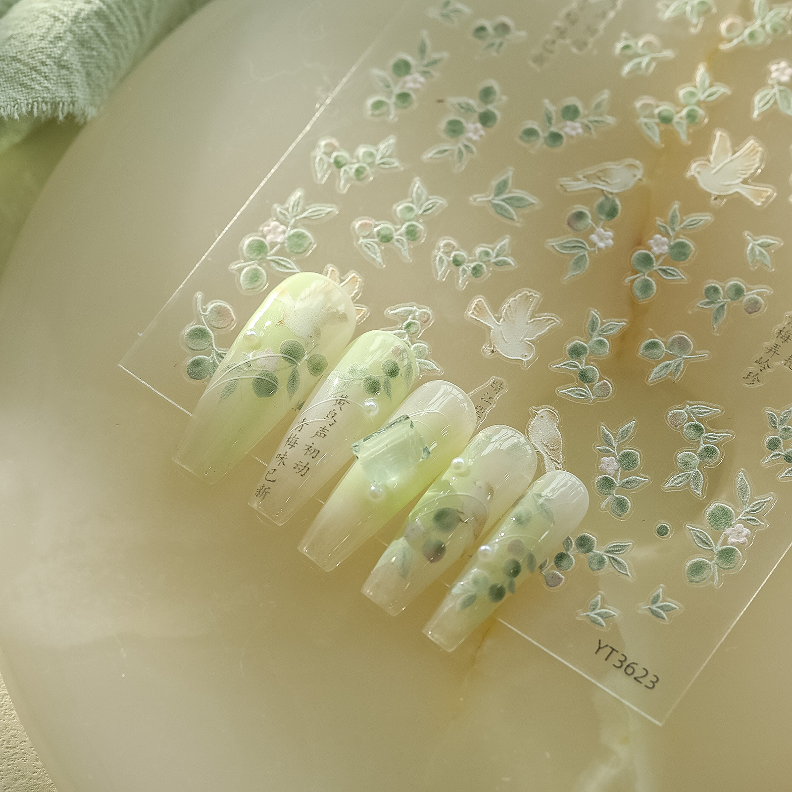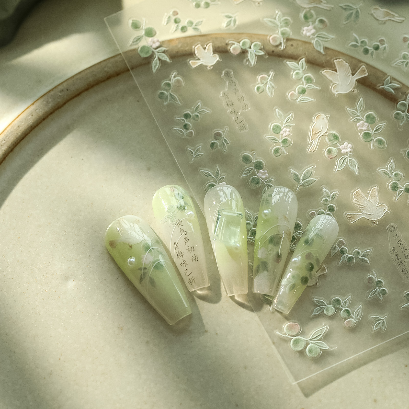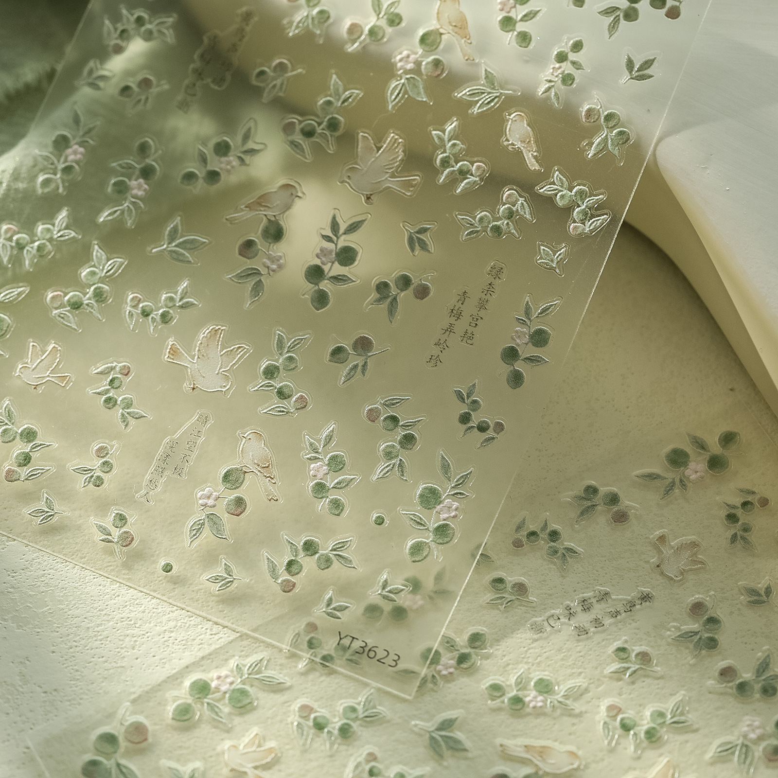 개미 그림 YITU 녹색 매화 황잉 구호 네일 아트 스티커 접착 얇은 터프 고대 라임 꽃과 새 네일 장식 스티커 YT3623