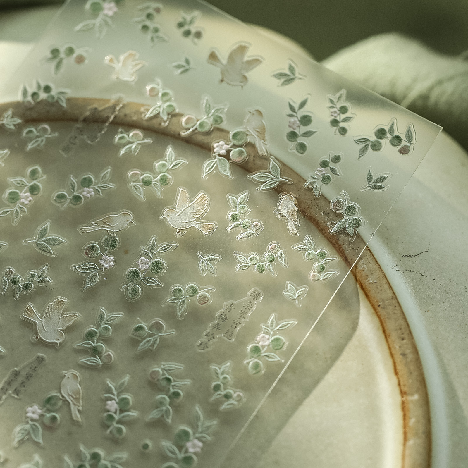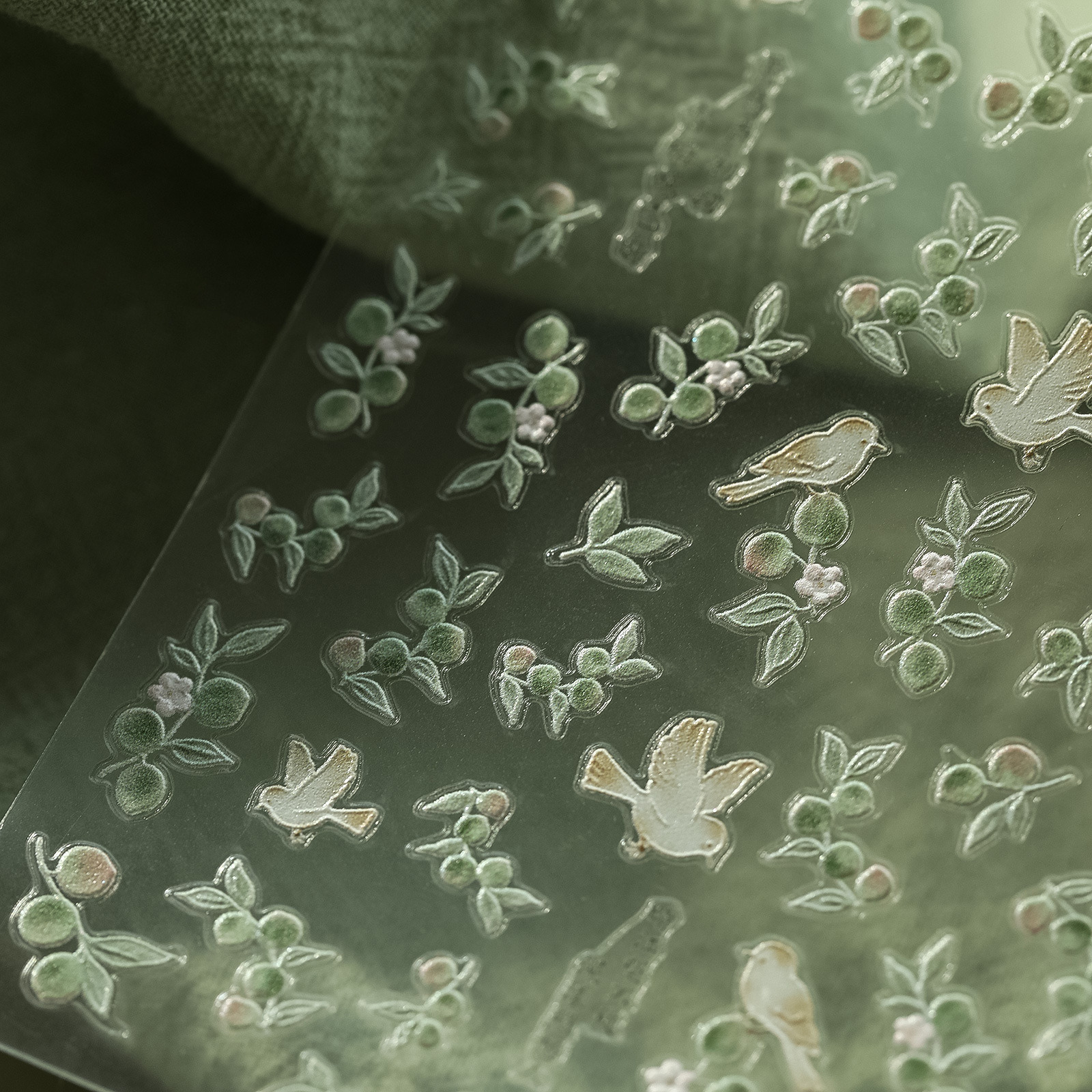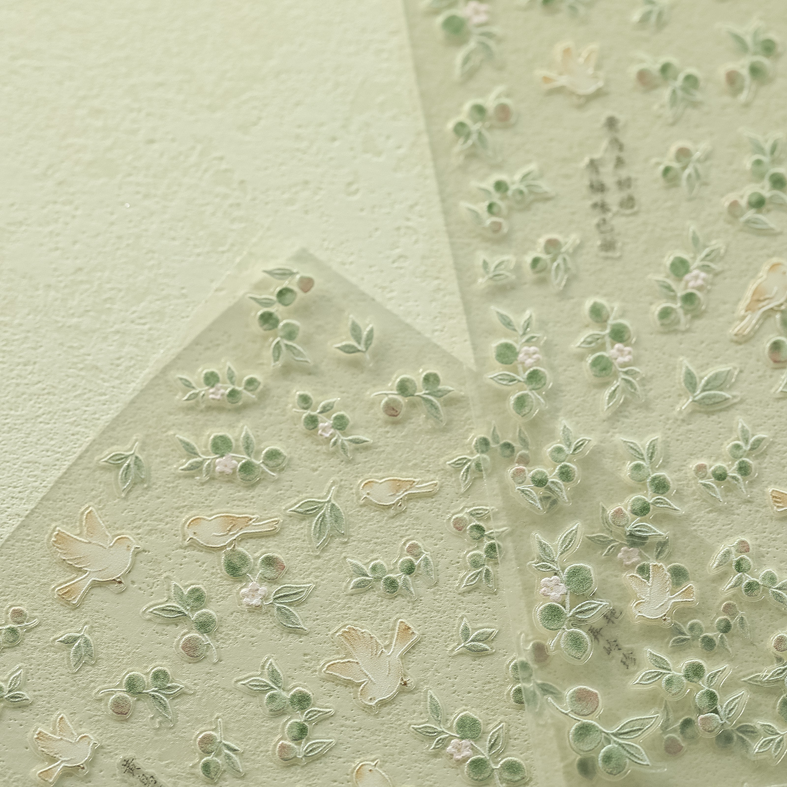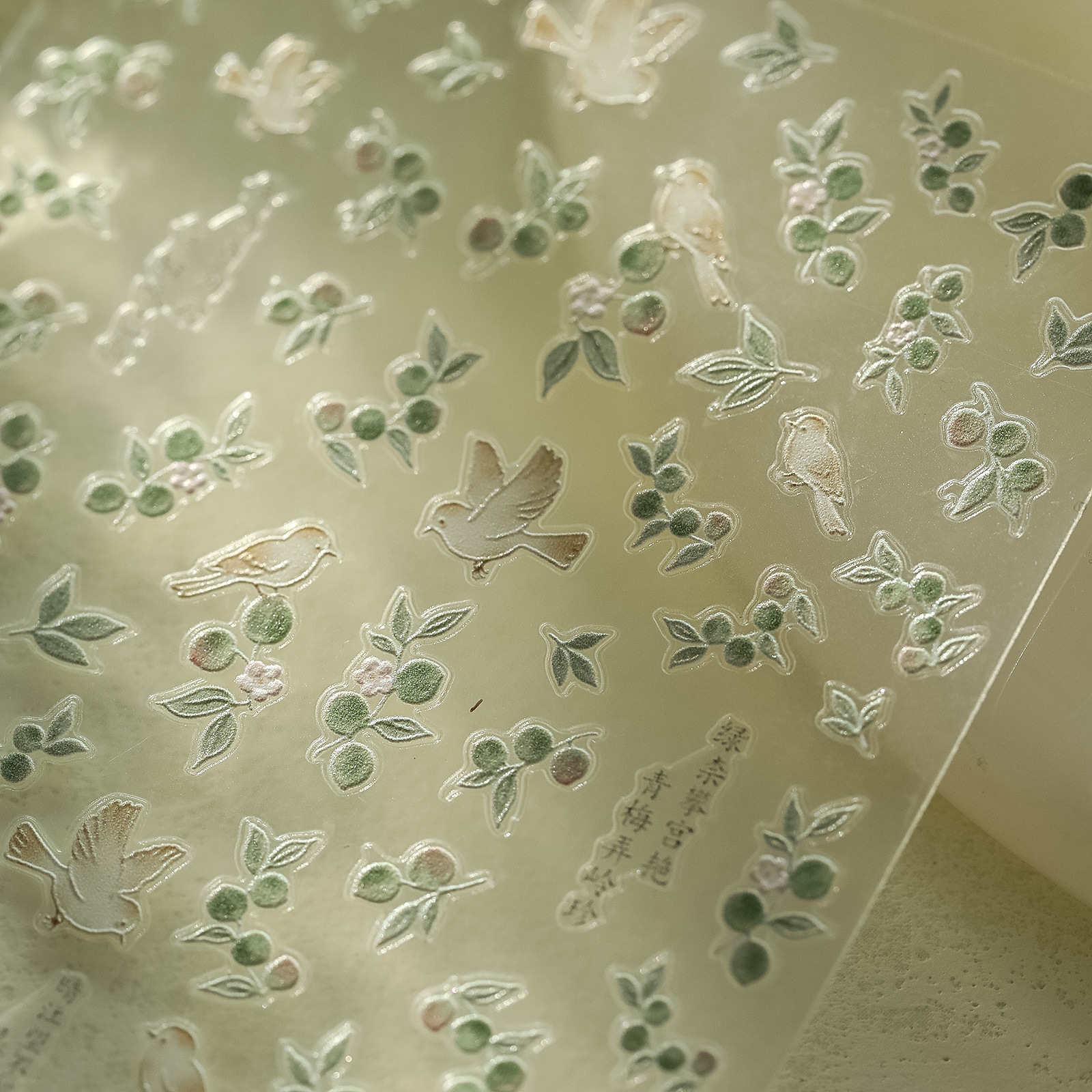 개미 그림 YITU 녹색 매화 황잉 구호 네일 아트 스티커 접착 얇은 터프 고대 라임 꽃과 새 네일 장식 스티커 YT3623