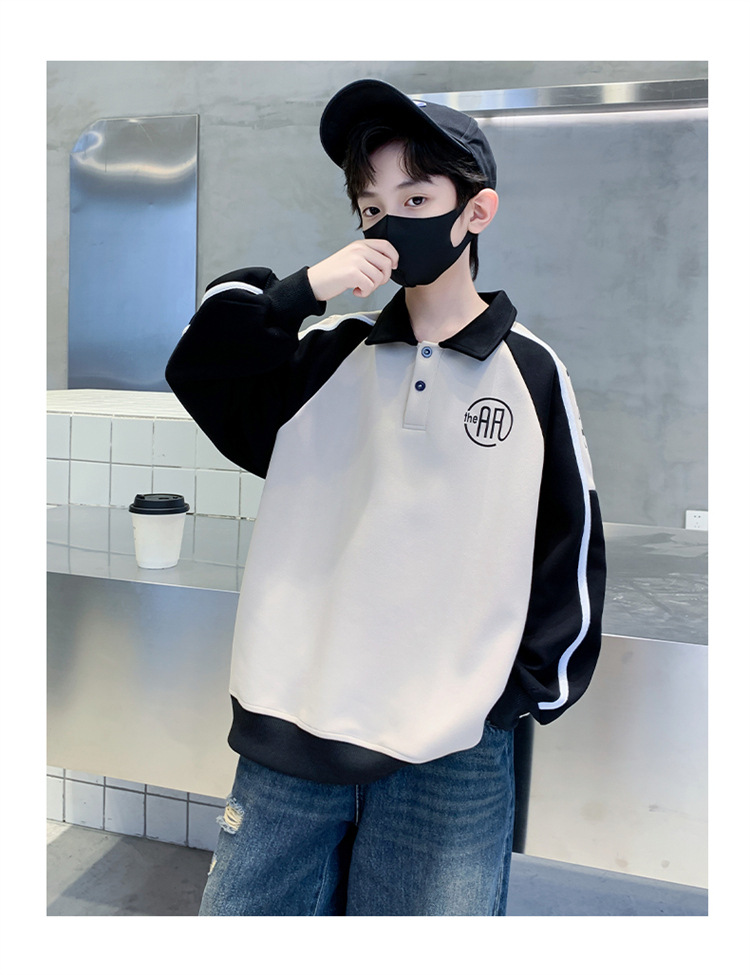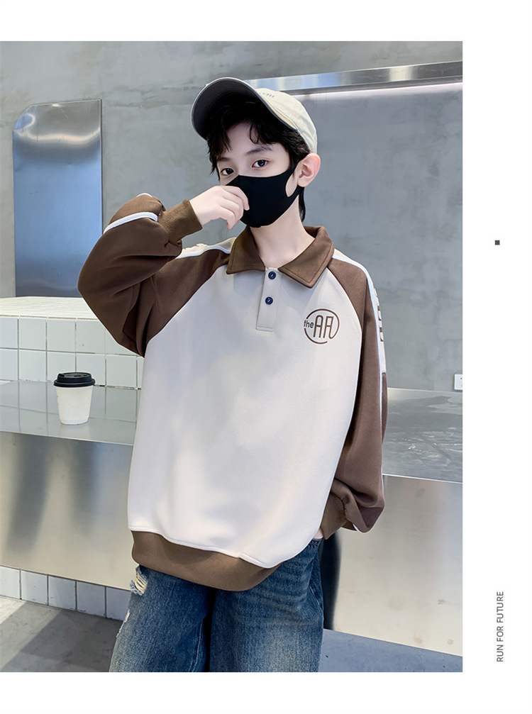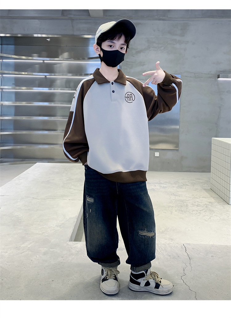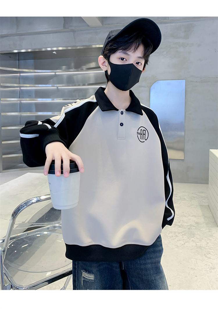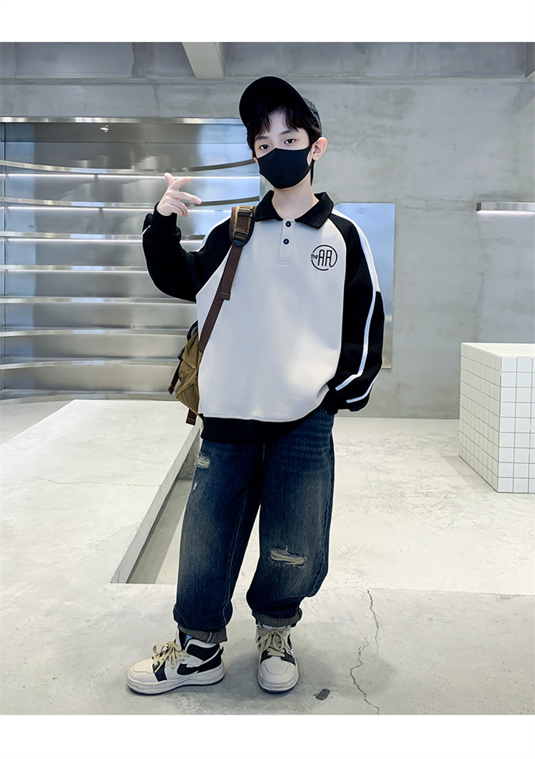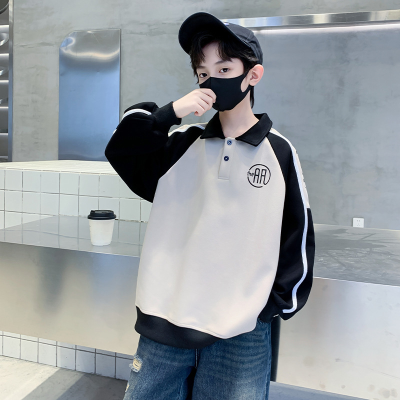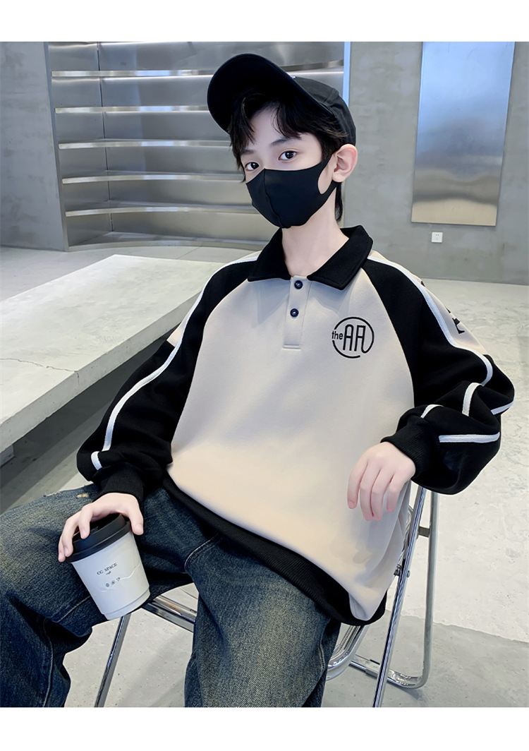 소년의 폴로 칼라 기모 스웨터 가을과 겨울 의류 2024 어린이 서양식 색상 매칭 두꺼운 긴 소매 탑베이스 셔츠스토어 가기