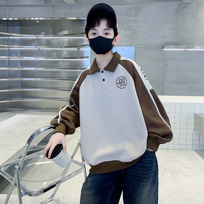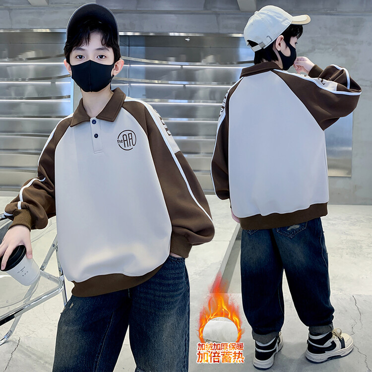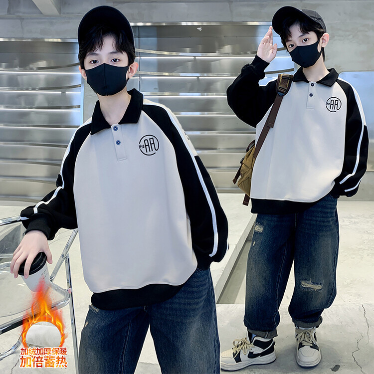 소년의 폴로 칼라 기모 스웨터 가을과 겨울 의류 2024 어린이 서양식 색상 매칭 두꺼운 긴 소매 탑베이스 셔츠