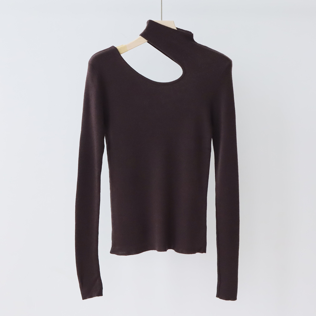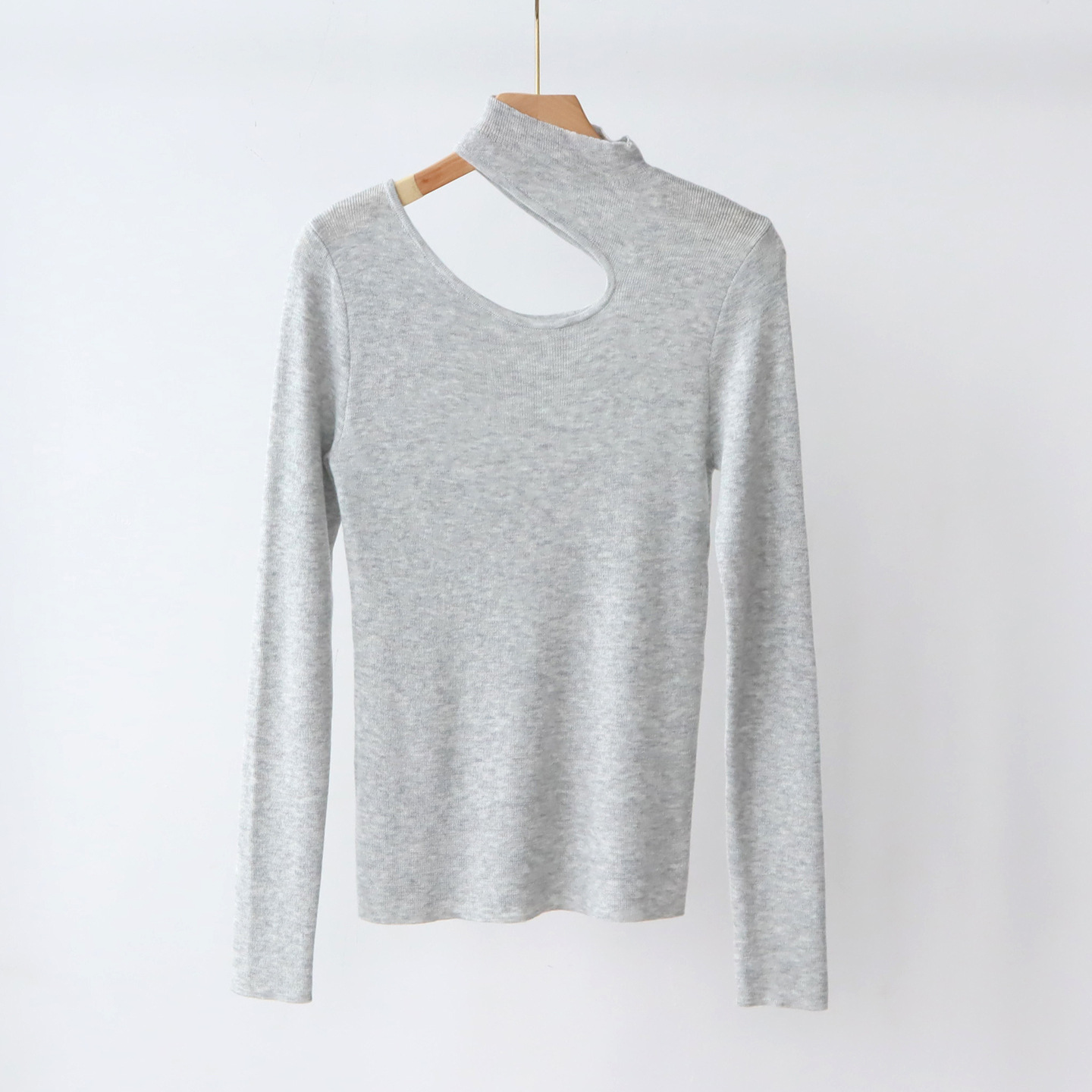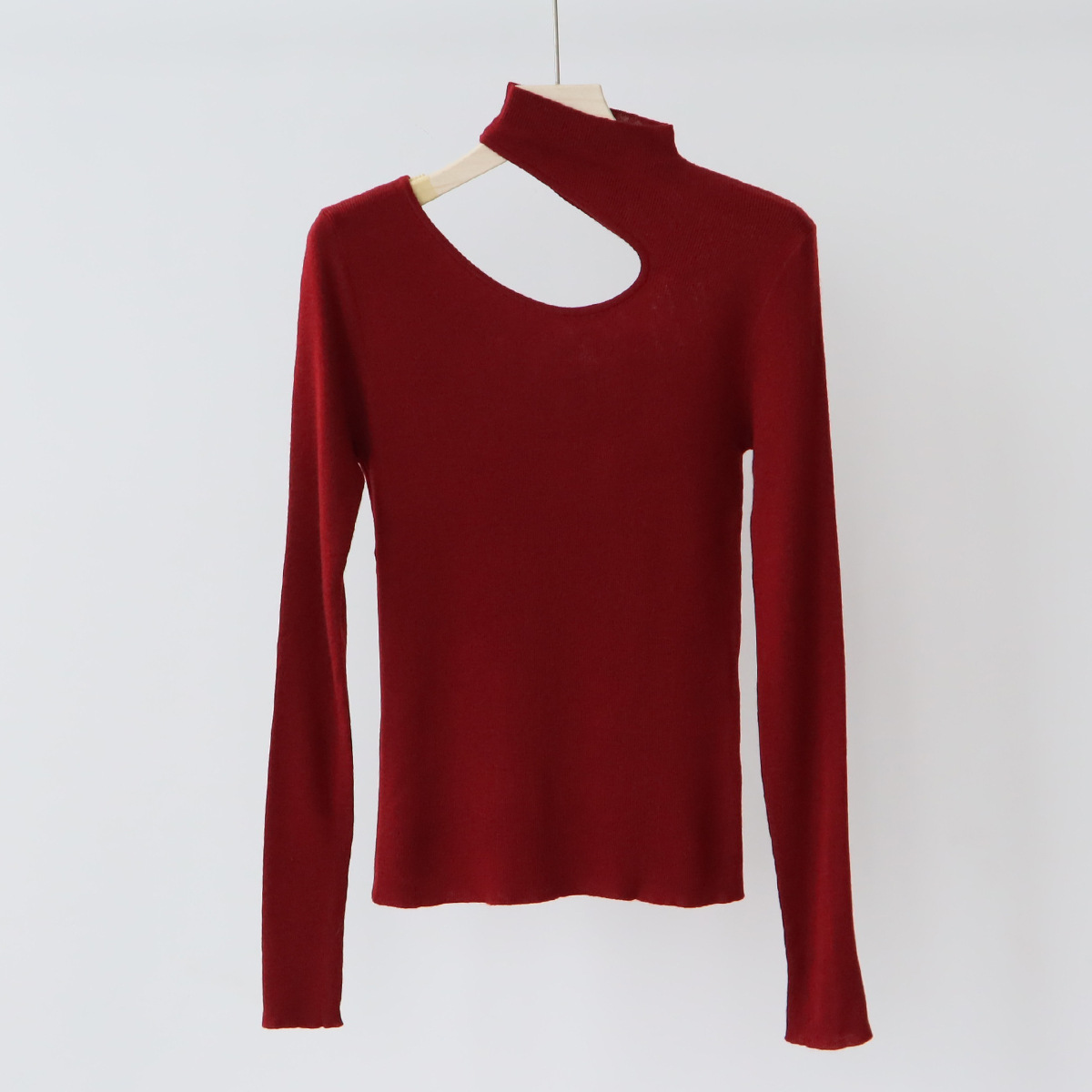 양모 블렌드 부드러운 바람 파는 어깨 높은 목 니트베이스 셔츠 여성용 겨울 새로운 탄성 슬림-핏 할로우 스웨터스토어 가기