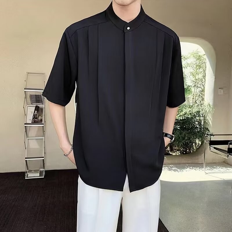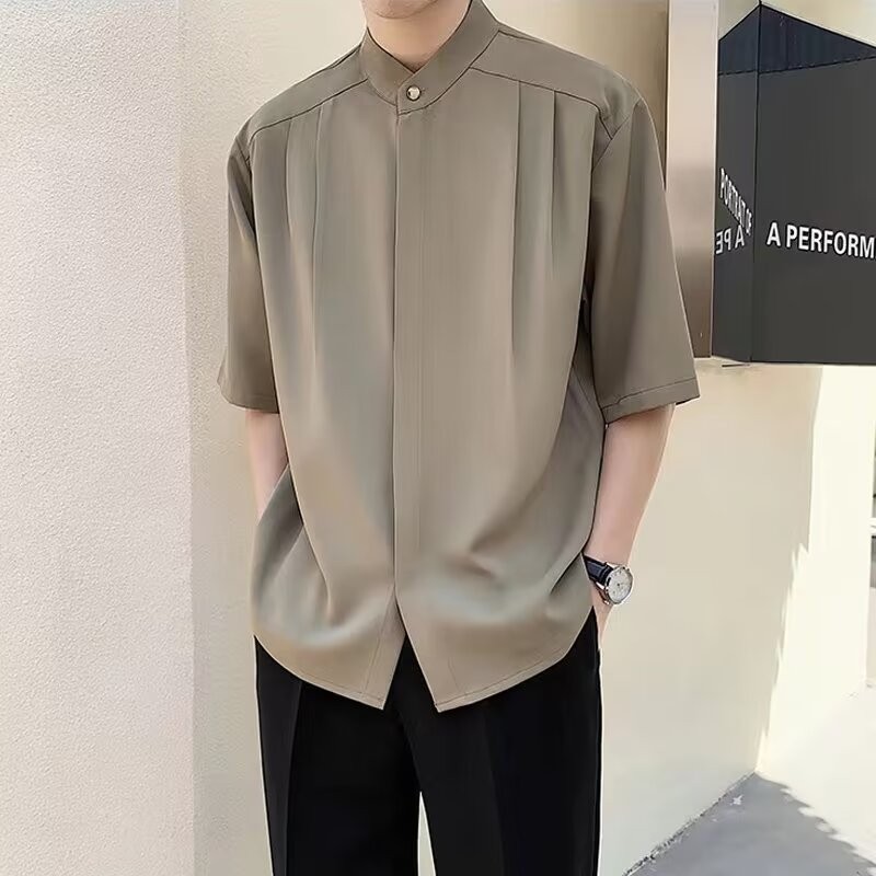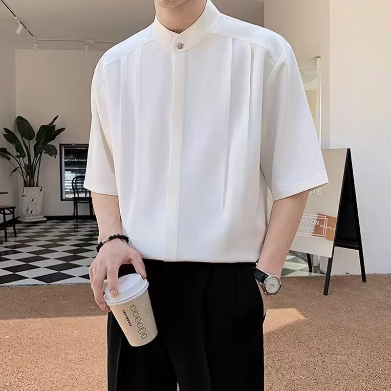 남자 2024 여름 새로운 스타일 수직 칼라 셔츠 남자의 얇은 느슨한 단색 청소년 반소매 하이 엔드 짧은 소매 셔츠