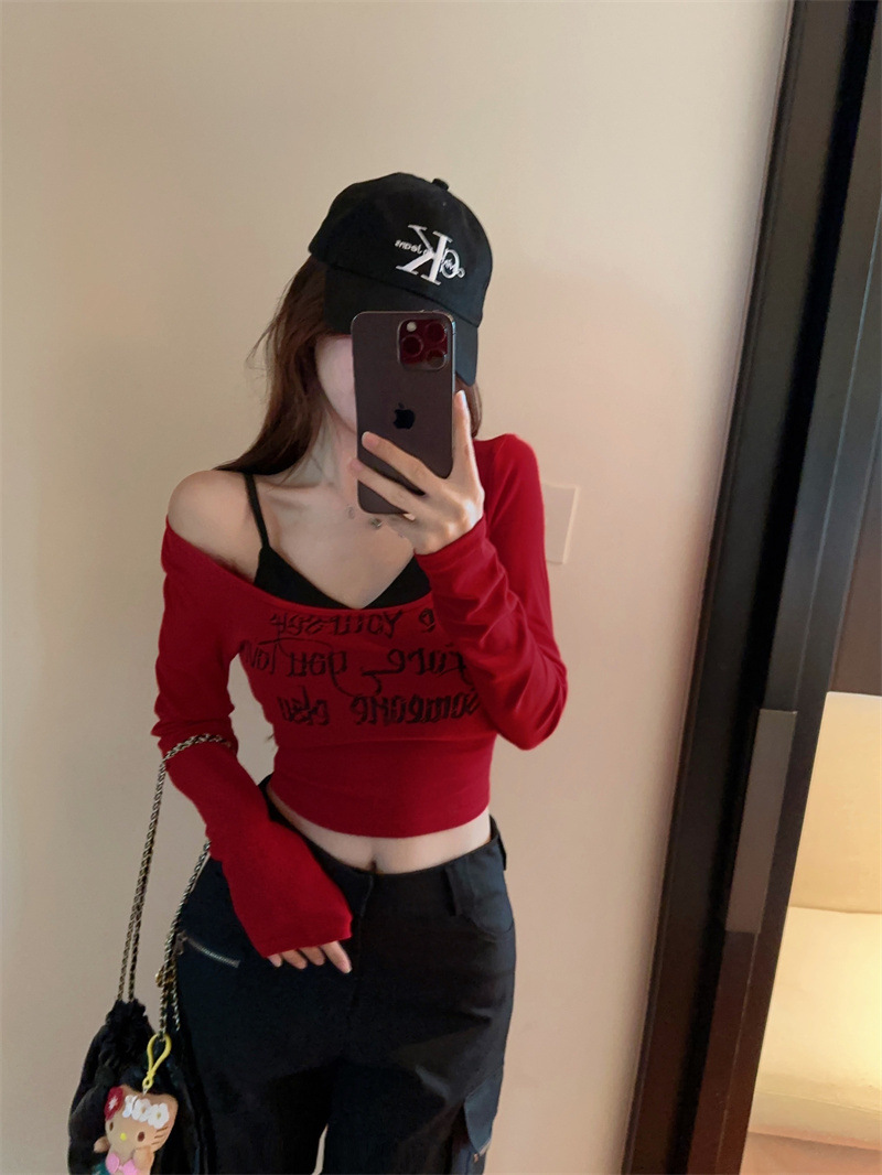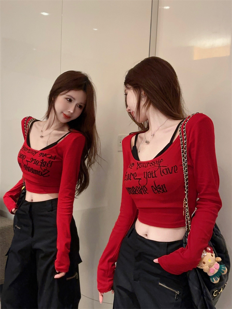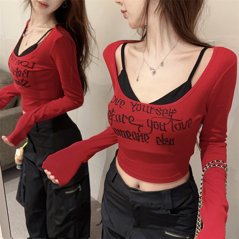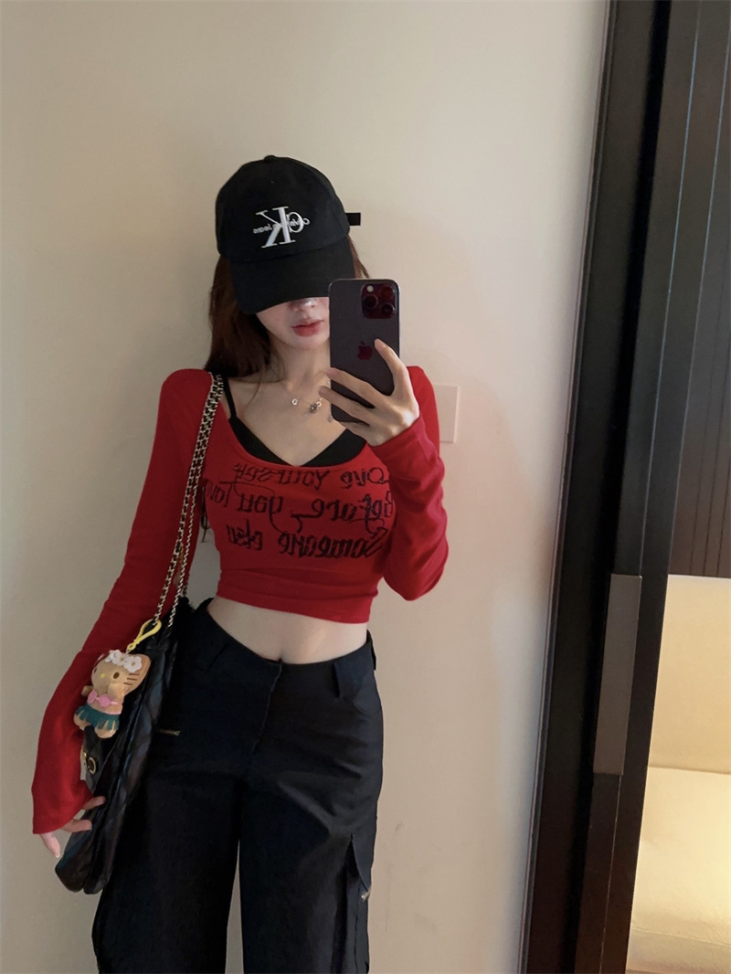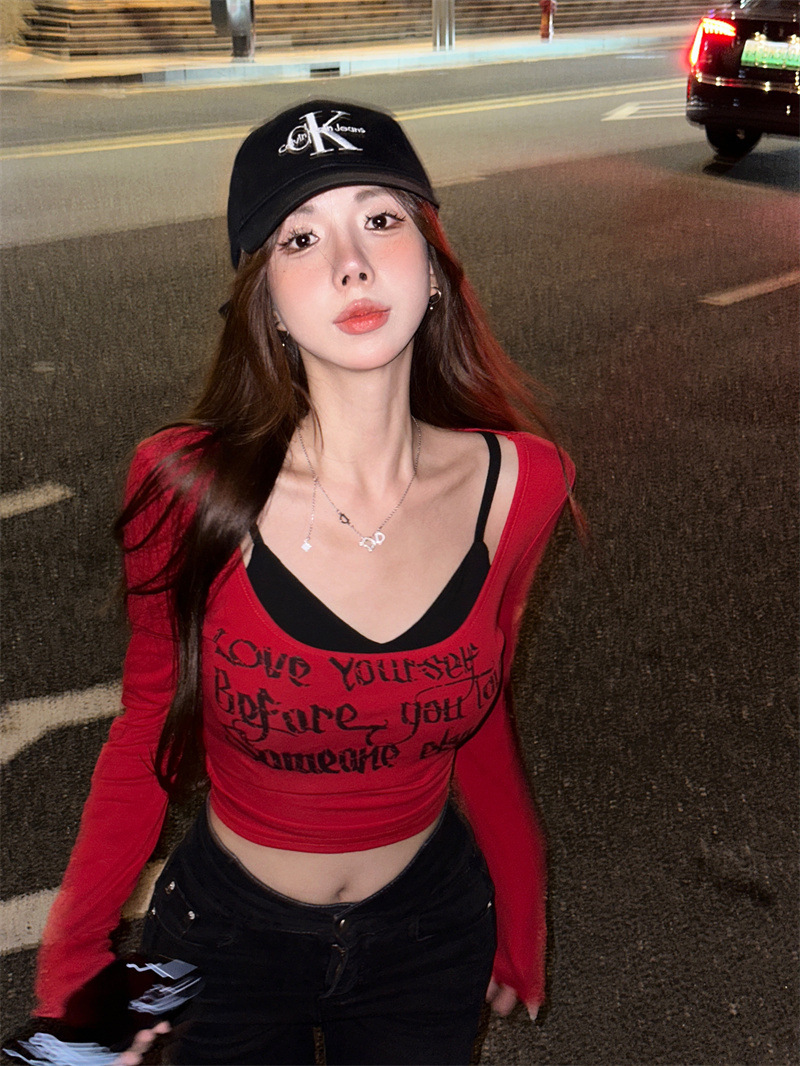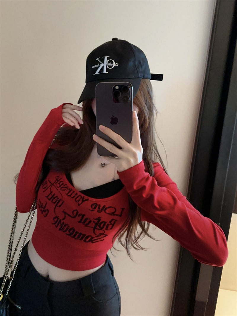 미국식 레트로 레드 긴팔 티셔츠 여성용 초가을 슬림 핏 타이트한 내베이스 셔츠 스파이스 걸스 쇼트 탑스토어 가기