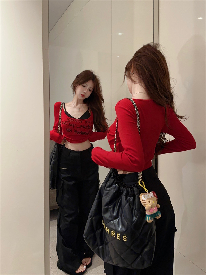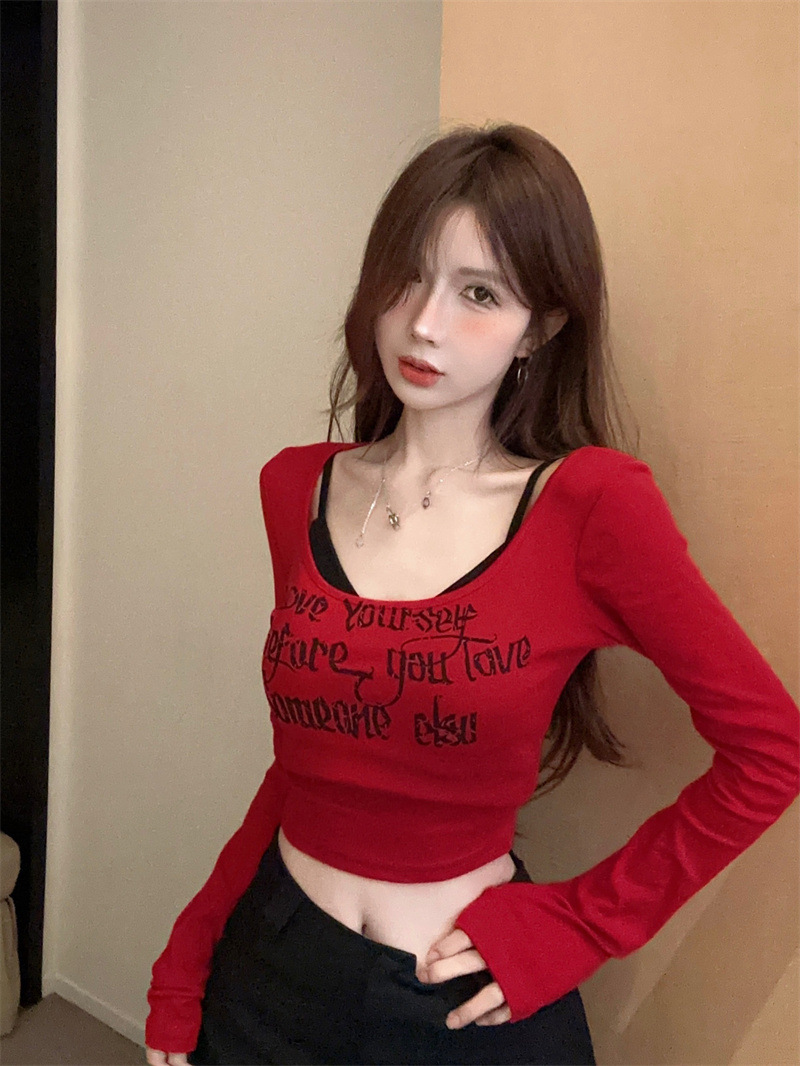 미국식 레트로 레드 긴팔 티셔츠 여성용 초가을 슬림 핏 타이트한 내베이스 셔츠 스파이스 걸스 쇼트 탑