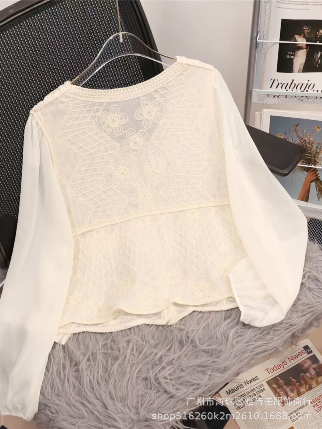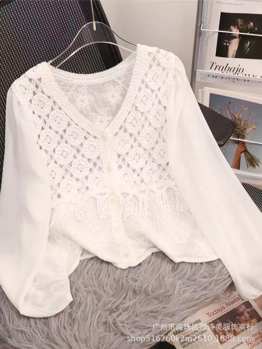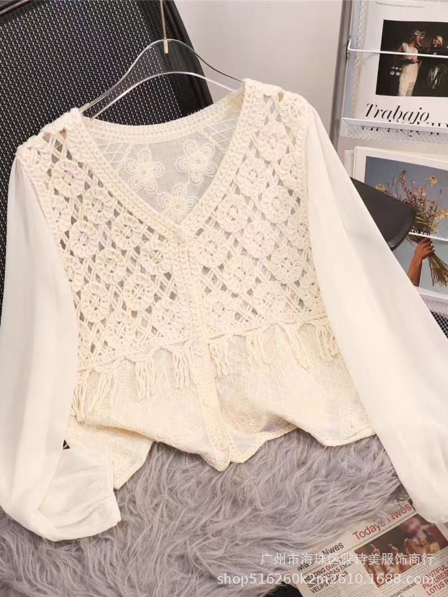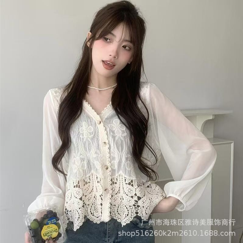 이른 가을 시대-세련된 올 매치 퍼프 슬리브 쉬폰 셔츠 여성의 새로운 V 넥 할로우 아웃 느슨한 아우터 착용 긴팔 탑 트렌디