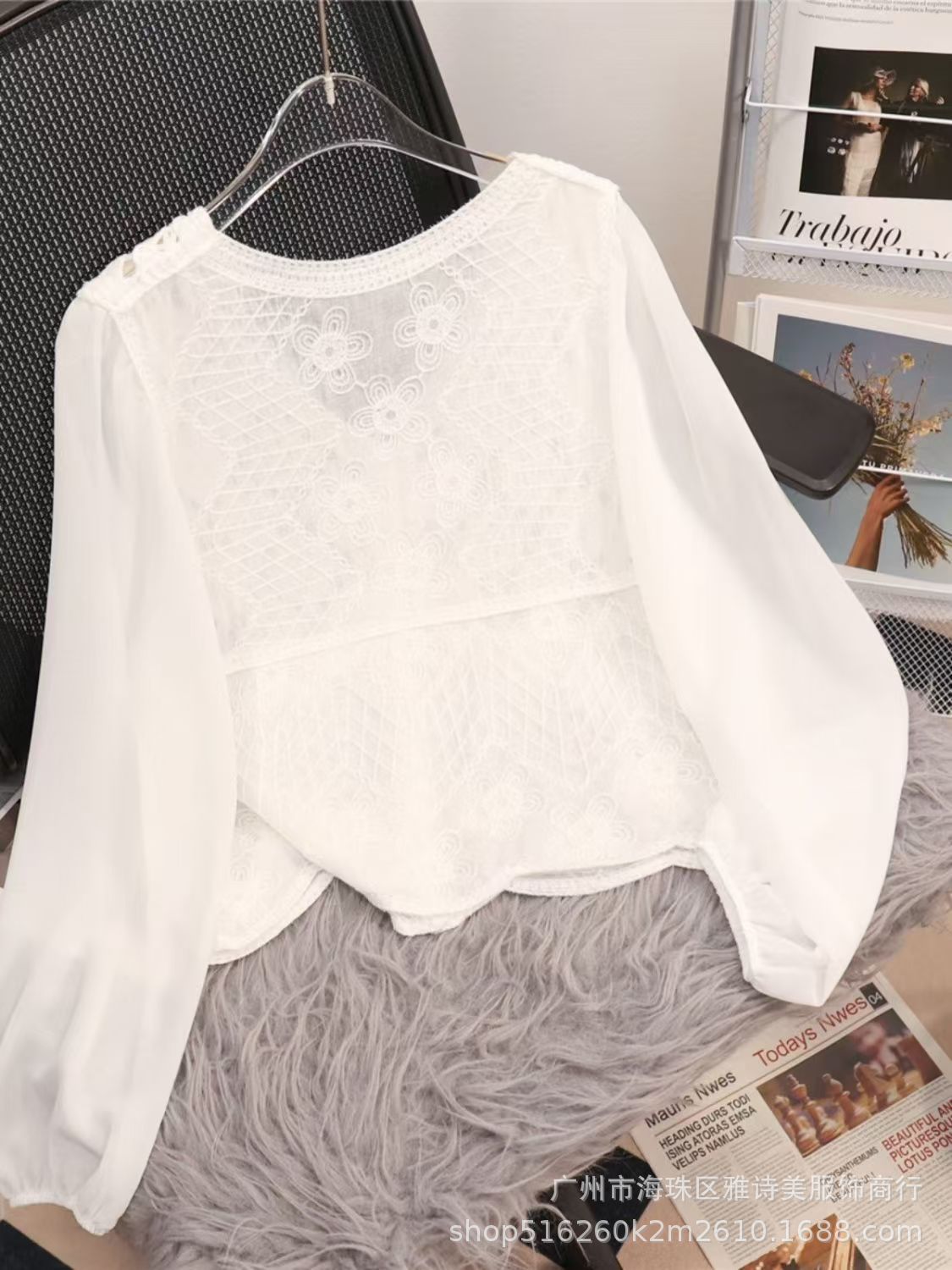 이른 가을 시대-세련된 올 매치 퍼프 슬리브 쉬폰 셔츠 여성의 새로운 V 넥 할로우 아웃 느슨한 아우터 착용 긴팔 탑 트렌디스토어 가기