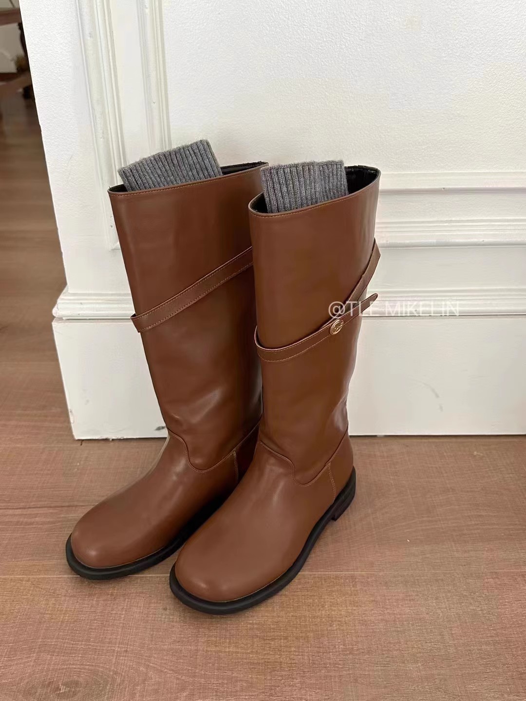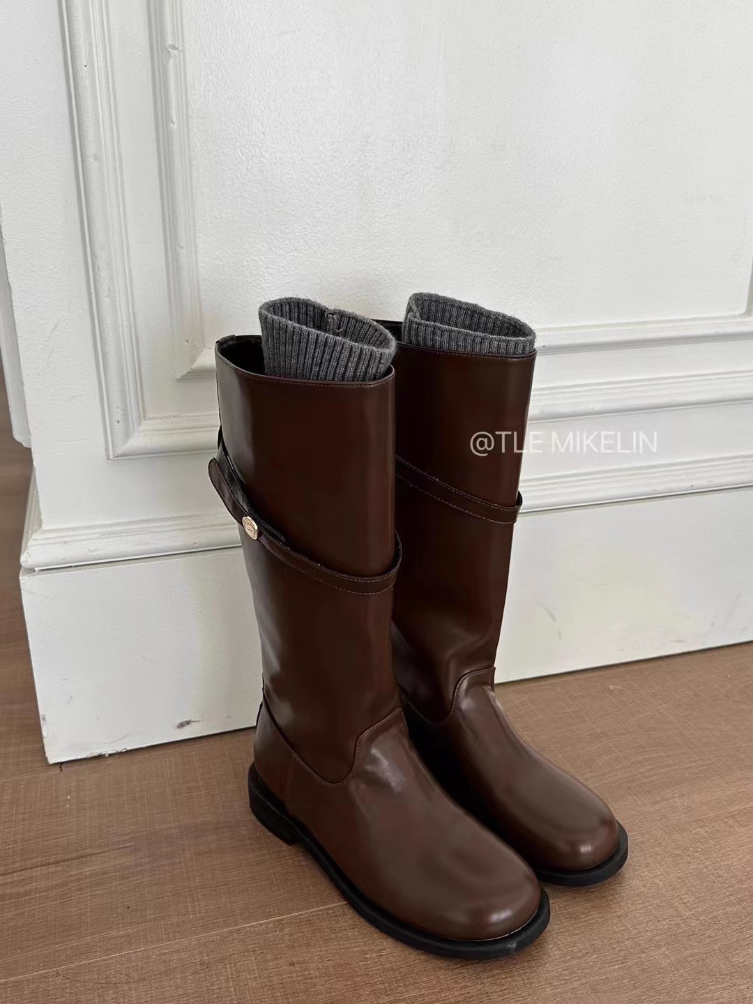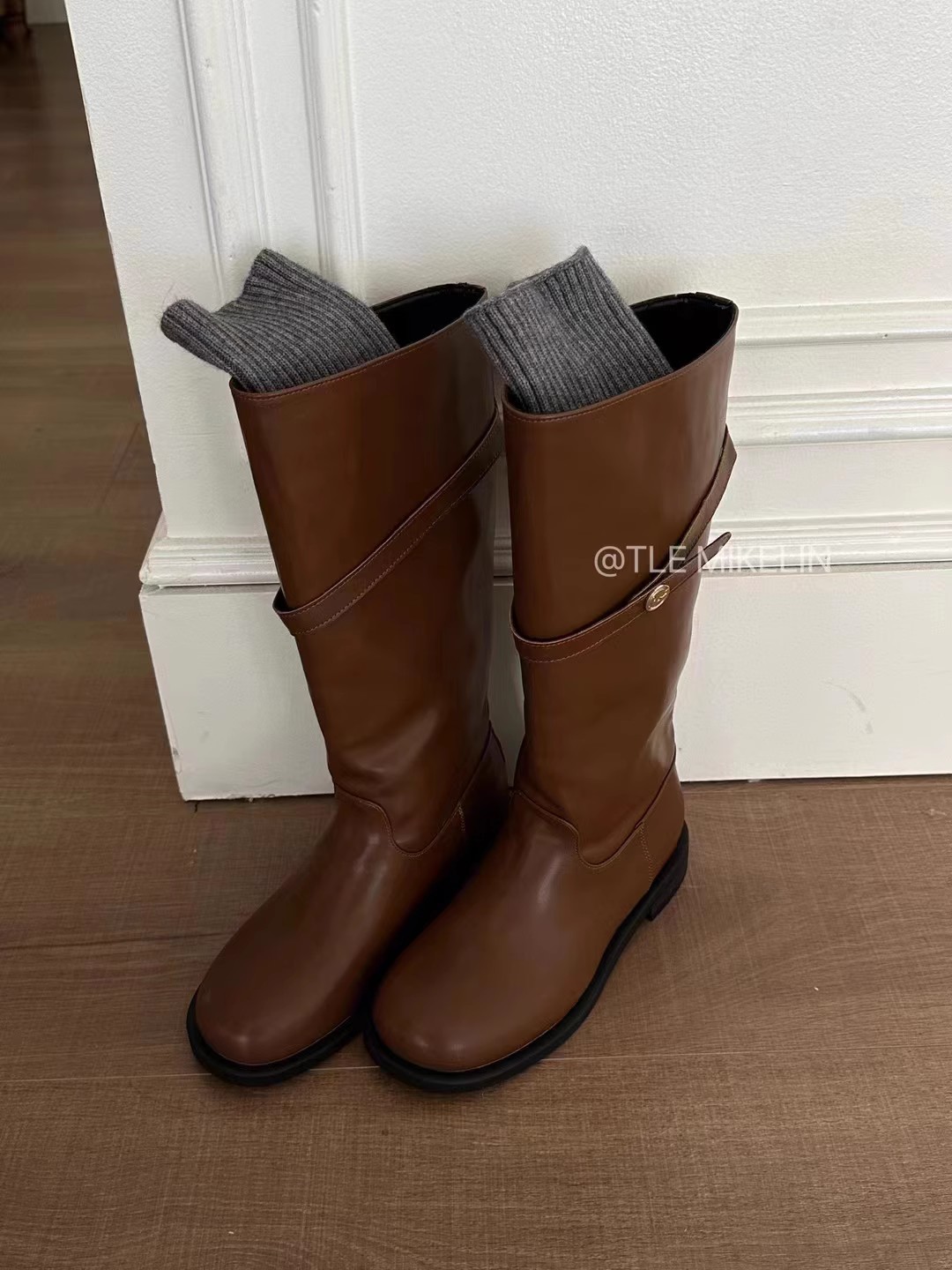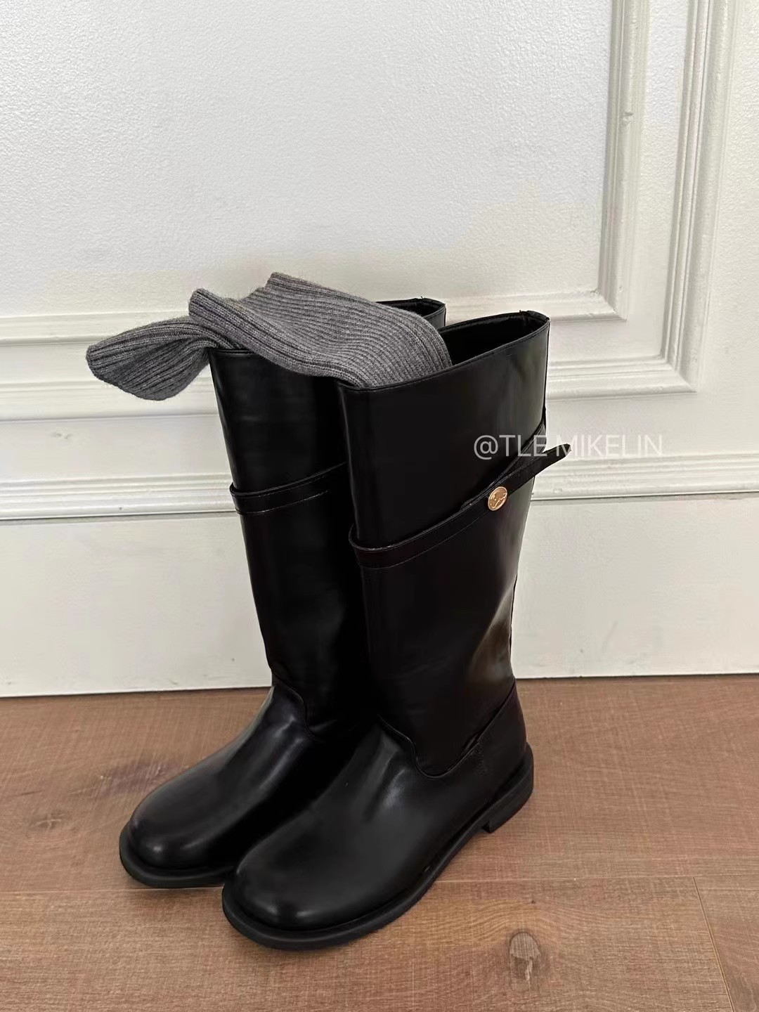 2024 가을과 겨울 새로운 패션 올 매치 부츠 슬리브 골드 버클 하이 부츠 하이 라운드 헤드 나이트 부츠 여성스토어 가기