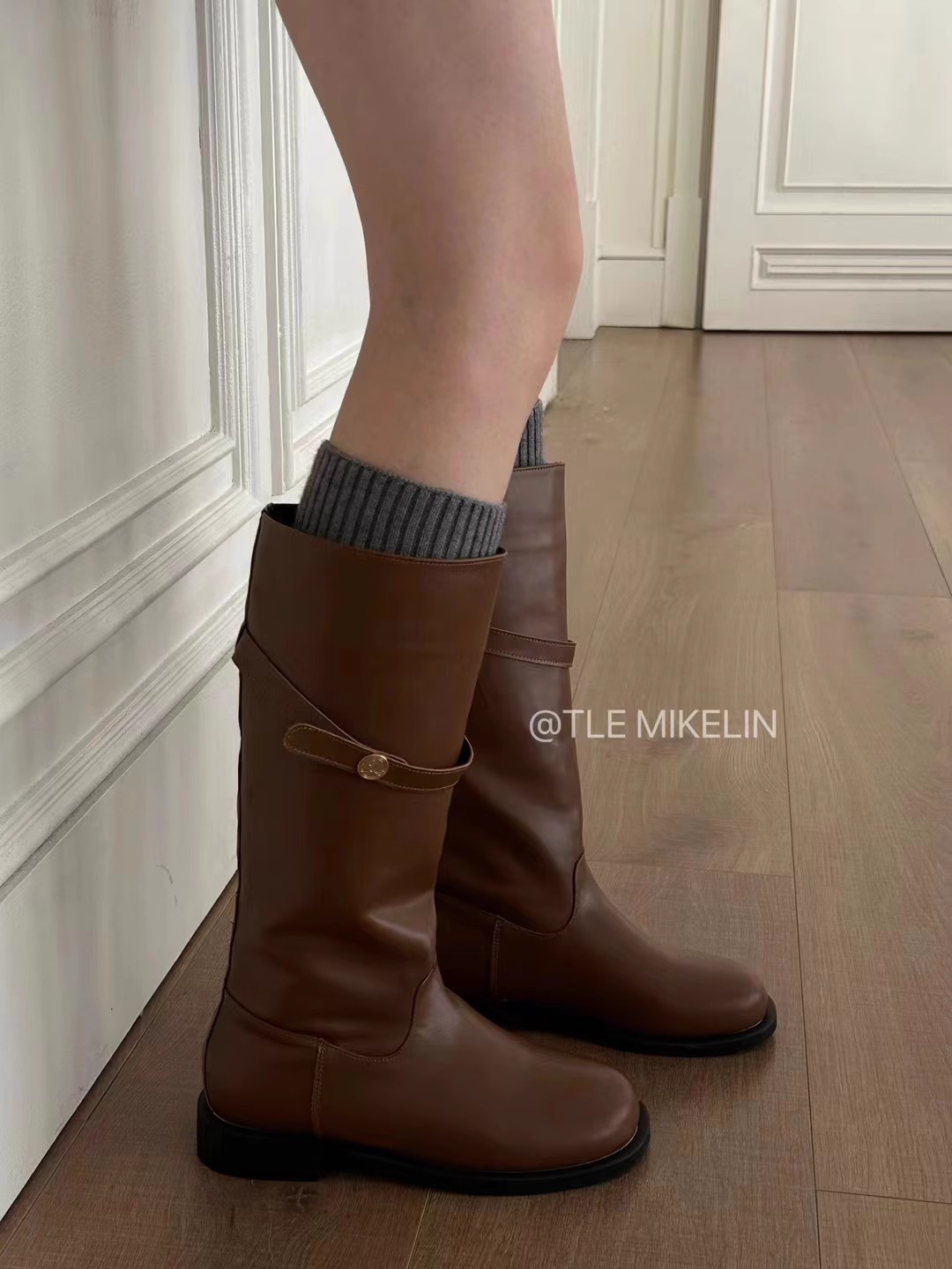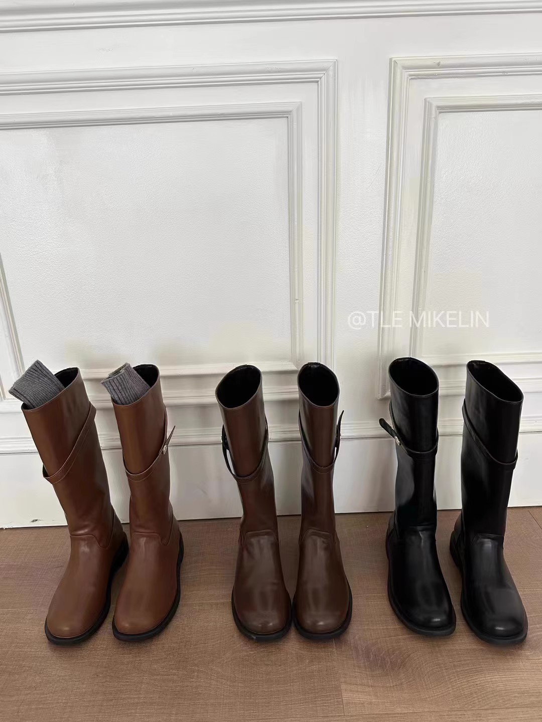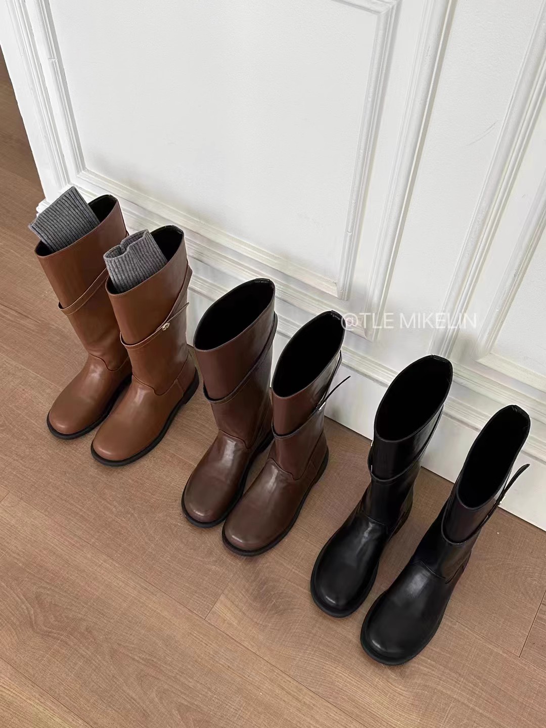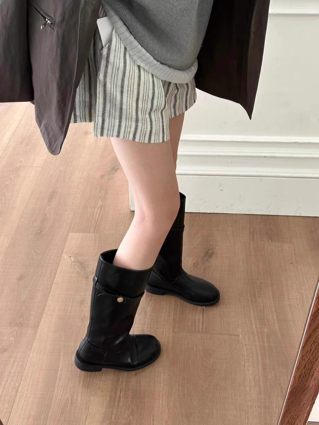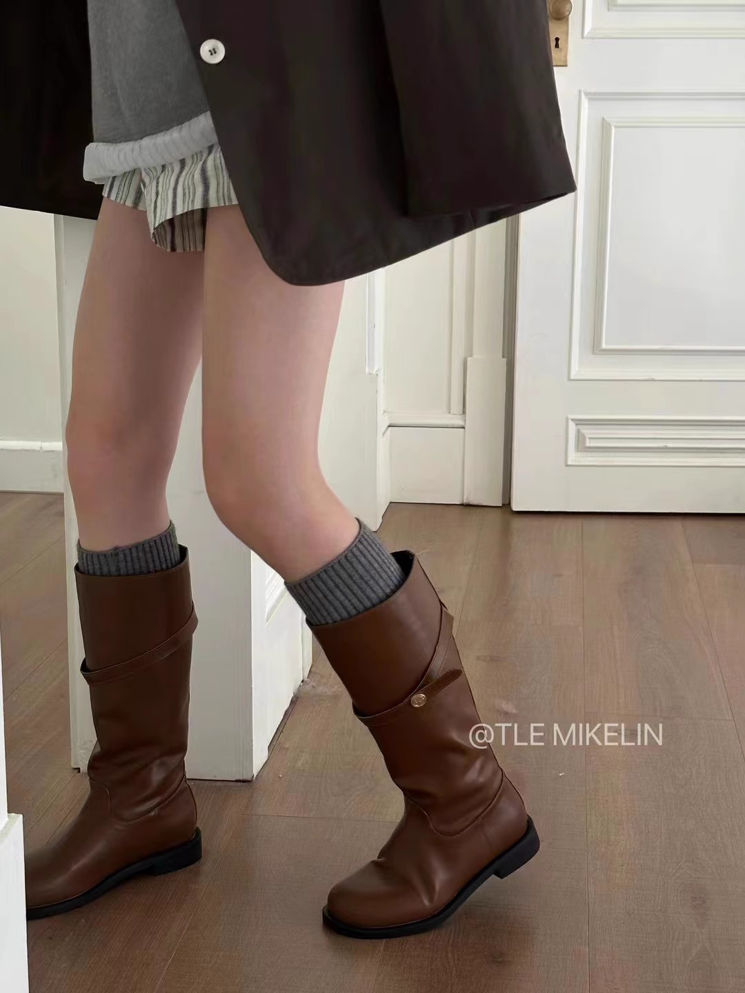 2024 가을과 겨울 새로운 패션 올 매치 부츠 슬리브 골드 버클 하이 부츠 하이 라운드 헤드 나이트 부츠 여성스토어 가기