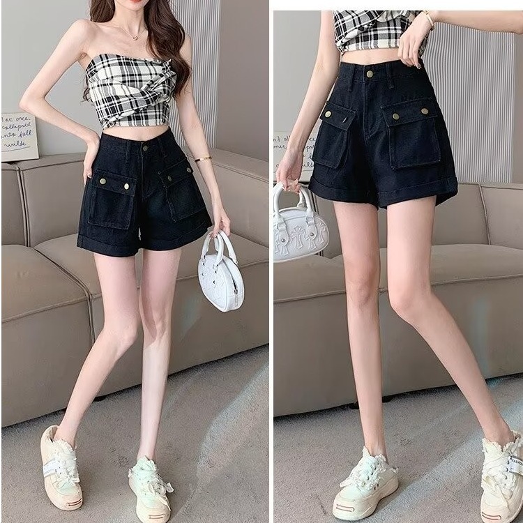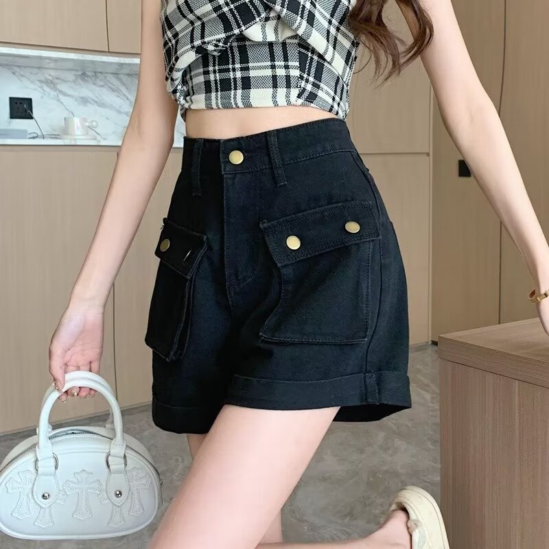 데님 핫 바지 여자 여름 레트로 올매치 패셔너블 슬림 룩 작업복 포켓 높은 허리 와이드 다리 한국 스타일 느슨한 짧은 바지