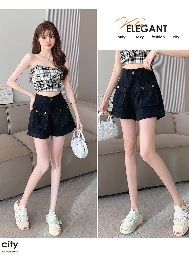 데님 핫 바지 여자 여름 레트로 올매치 패셔너블 슬림 룩 작업복 포켓 높은 허리 와이드 다리 한국 스타일 느슨한 짧은 바지스토어 가기