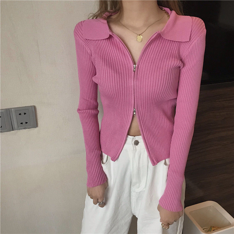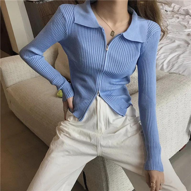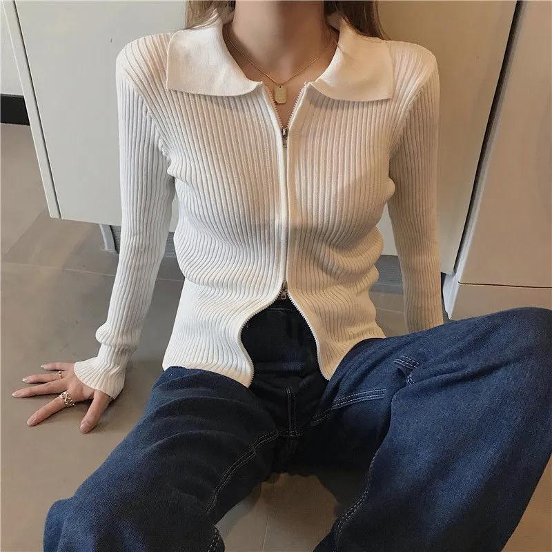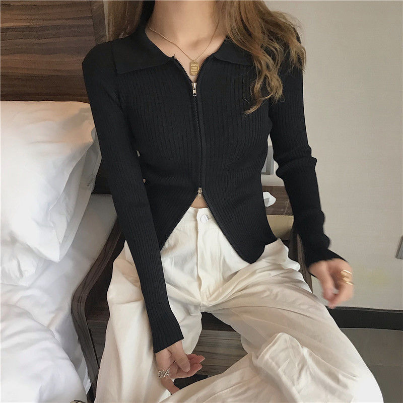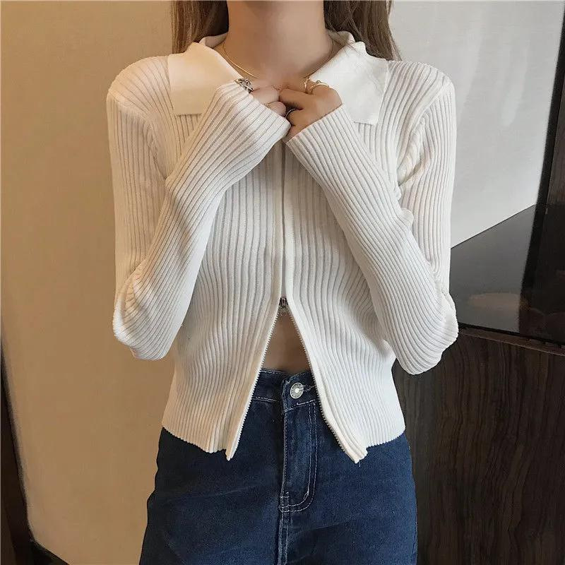 이른 가을 새로운 폴로 칼라 니트 카디건 여성의 가을과 겨울 슬림 핏 디자인 센스 스웨터 더블 지퍼 쇼트 탑 코트스토어 가기