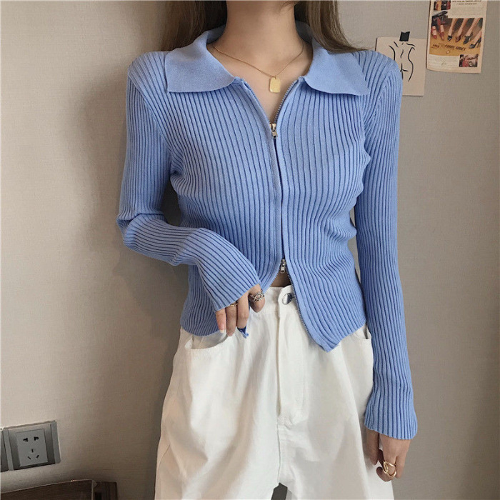 이른 가을 새로운 폴로 칼라 니트 카디건 여성의 가을과 겨울 슬림 핏 디자인 센스 스웨터 더블 지퍼 쇼트 탑 코트