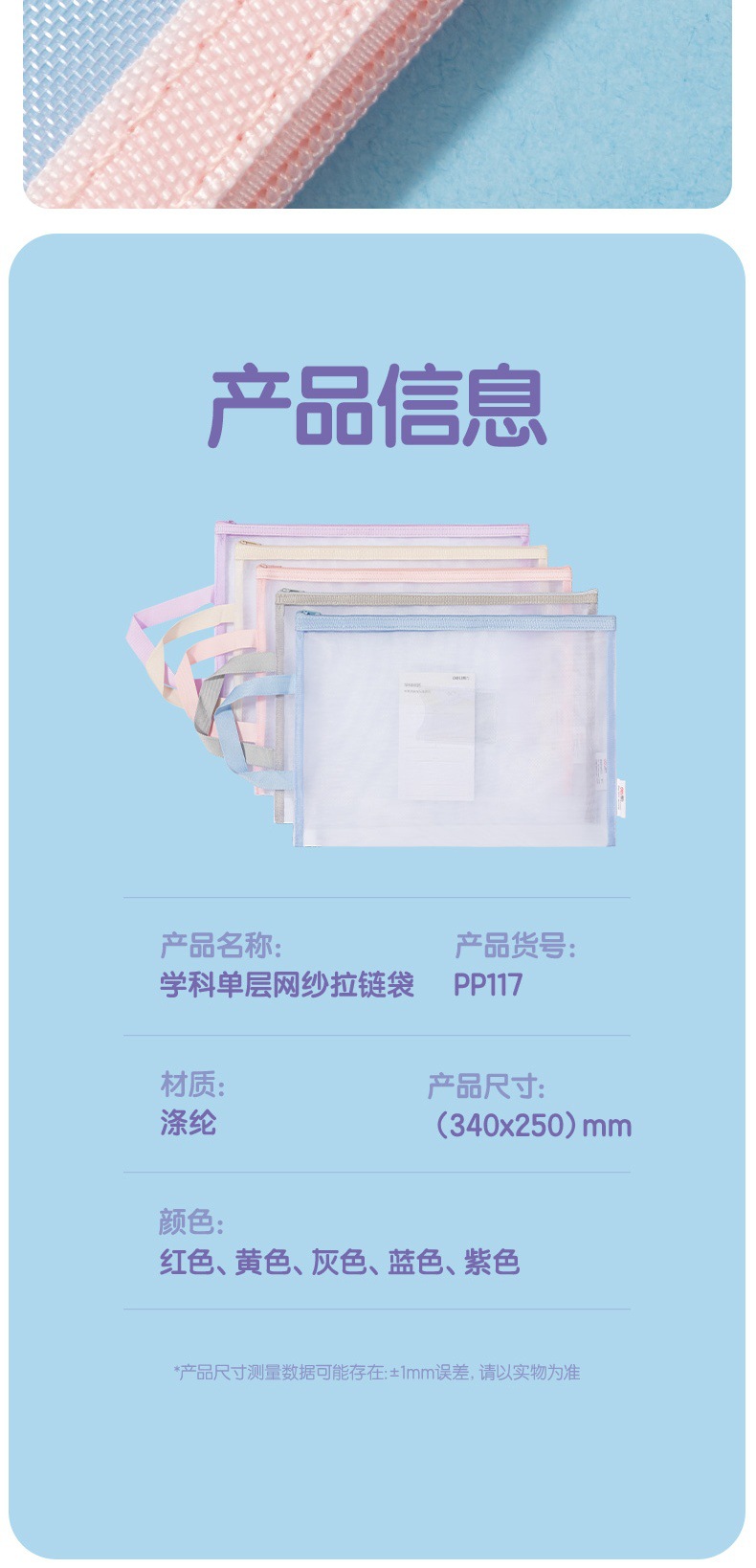 델리 PP117 단일 레이어 a4 메쉬 제목 분류 가방 문서 가방 학생 나일론 메쉬 지퍼 핸드백
