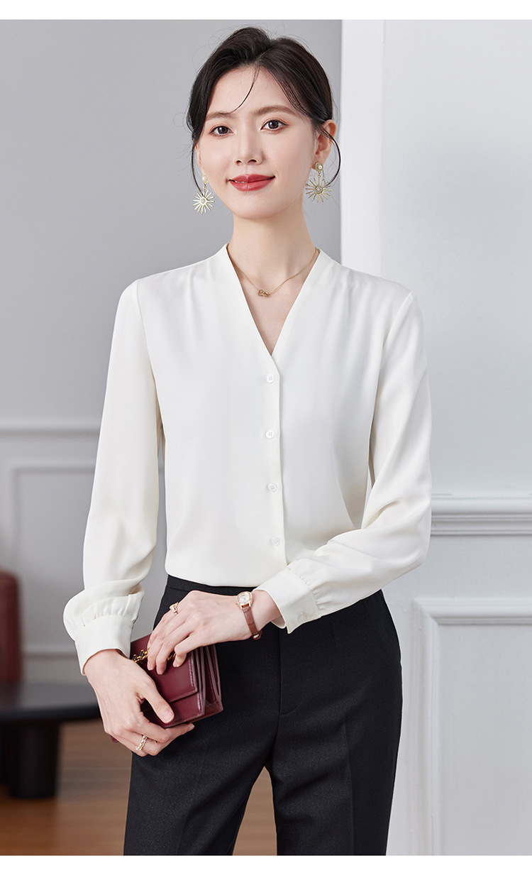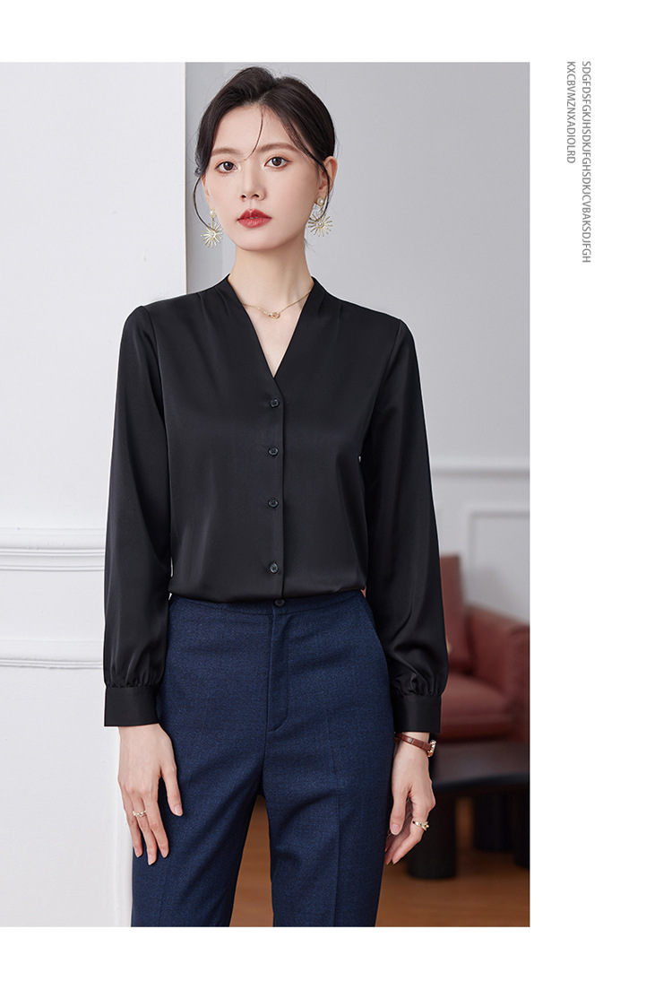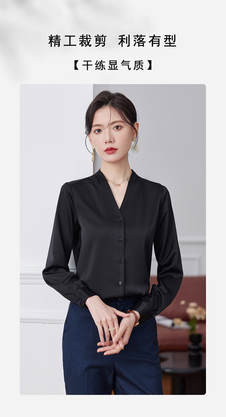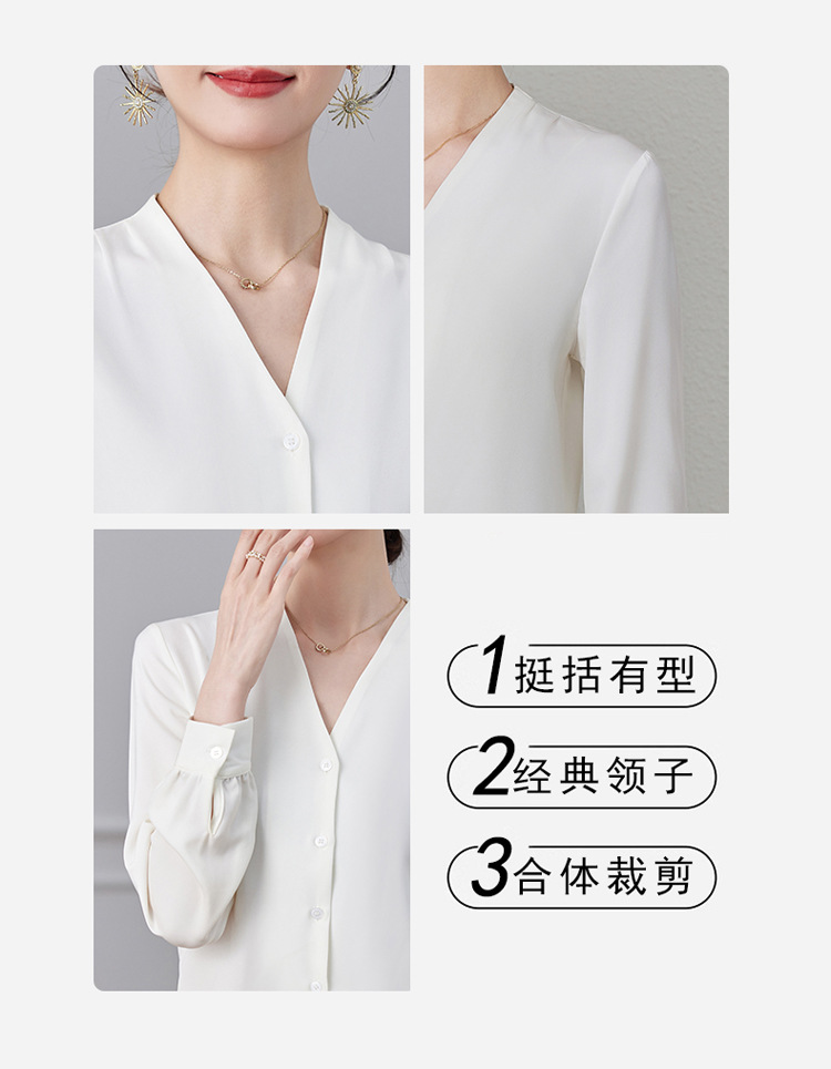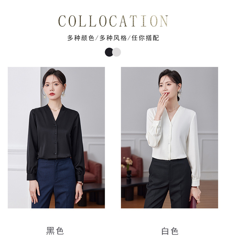 프랑스 스타일 Collarless Niche 긴팔 Satin Chiffon 셔츠 여성의 우아한 하이 엔드 V 넥 전문 통근 작업 셔츠스토어 가기