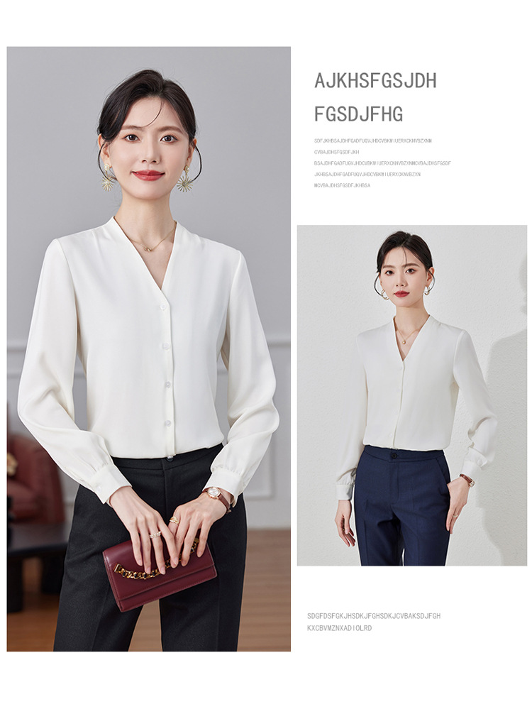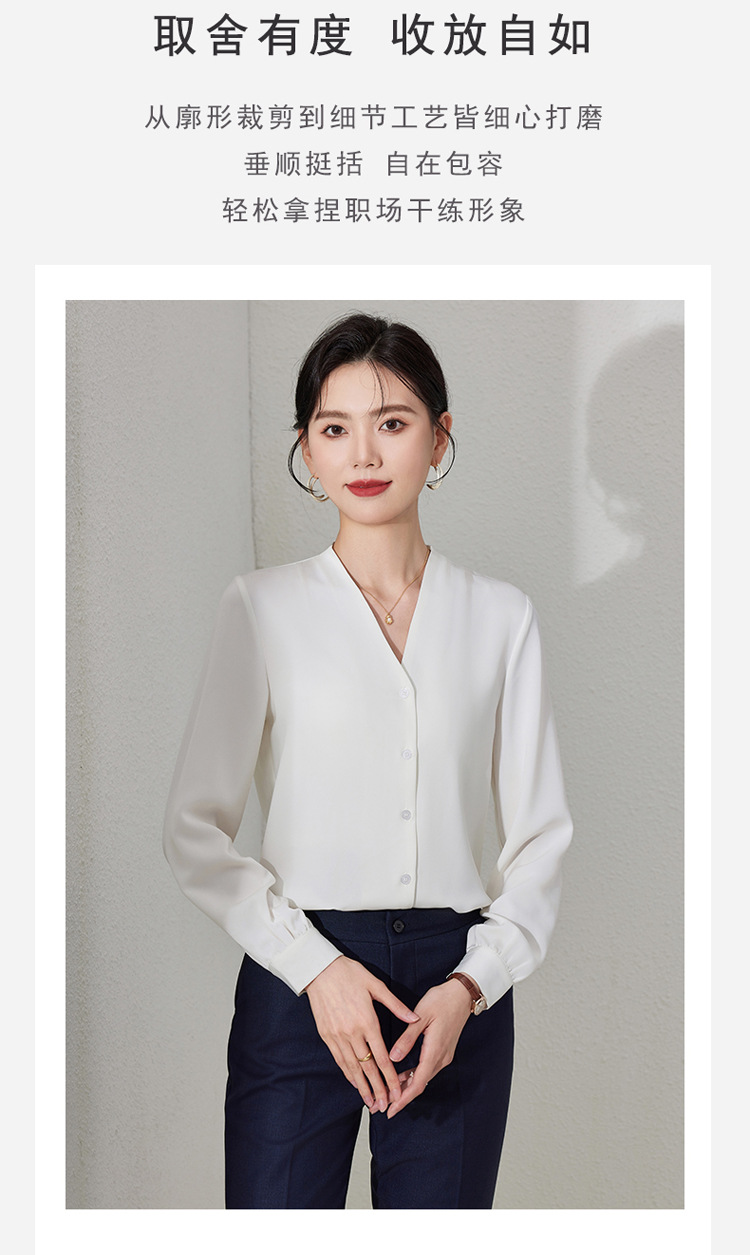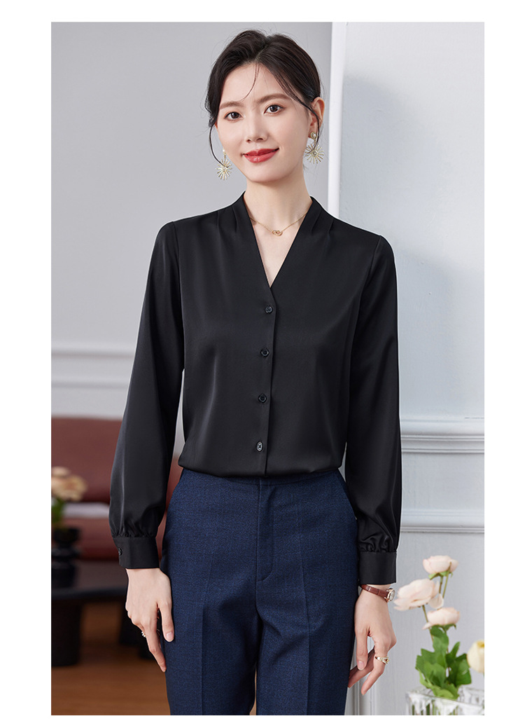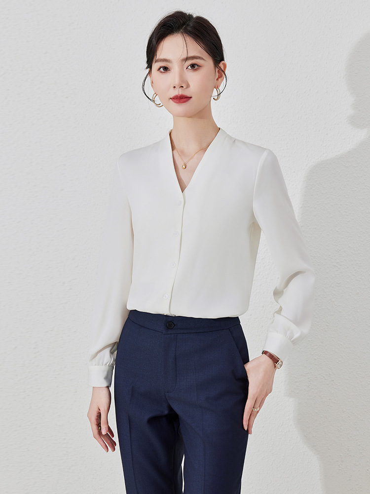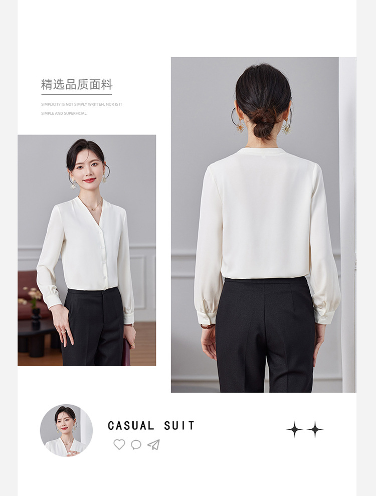 프랑스 스타일 Collarless Niche 긴팔 Satin Chiffon 셔츠 여성의 우아한 하이 엔드 V 넥 전문 통근 작업 셔츠스토어 가기