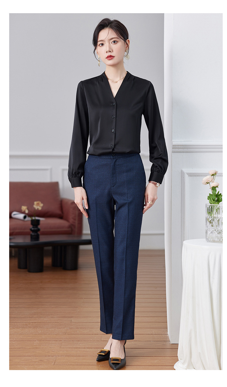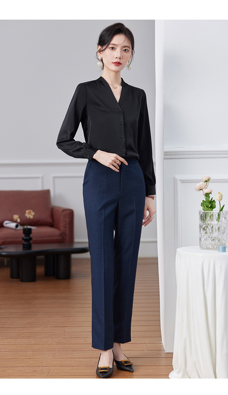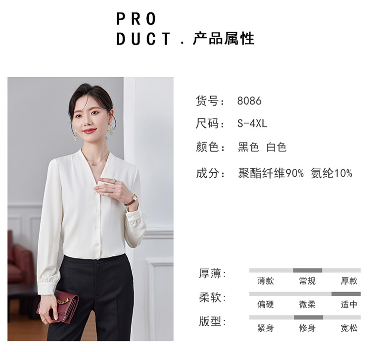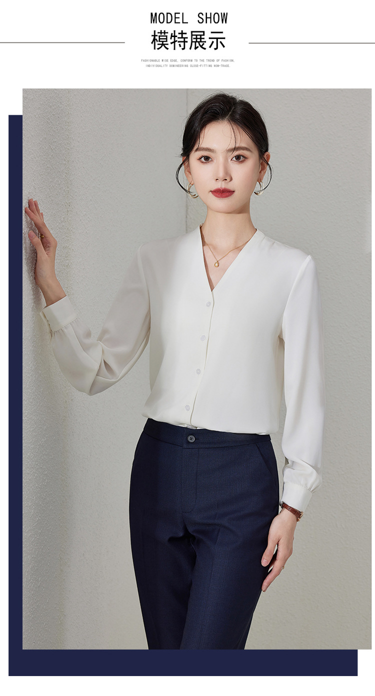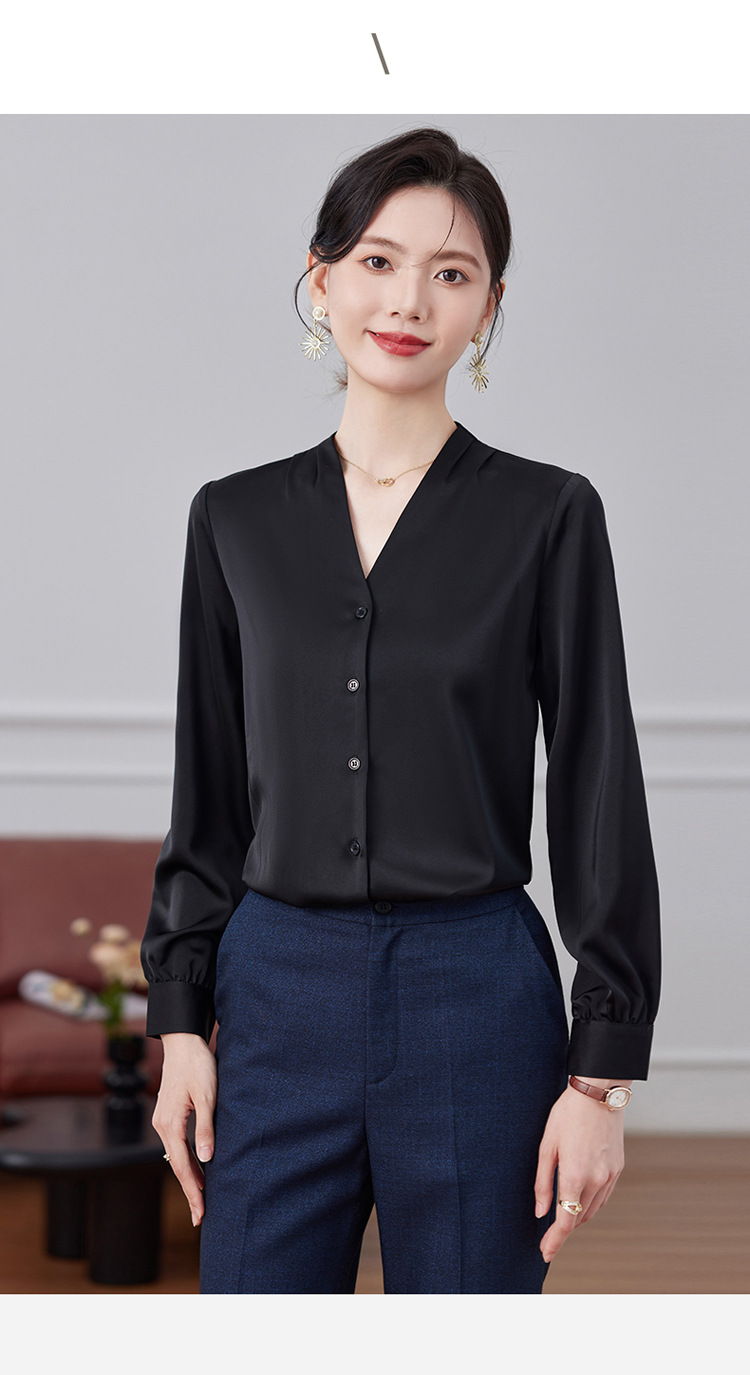 프랑스 스타일 Collarless Niche 긴팔 Satin Chiffon 셔츠 여성의 우아한 하이 엔드 V 넥 전문 통근 작업 셔츠스토어 가기