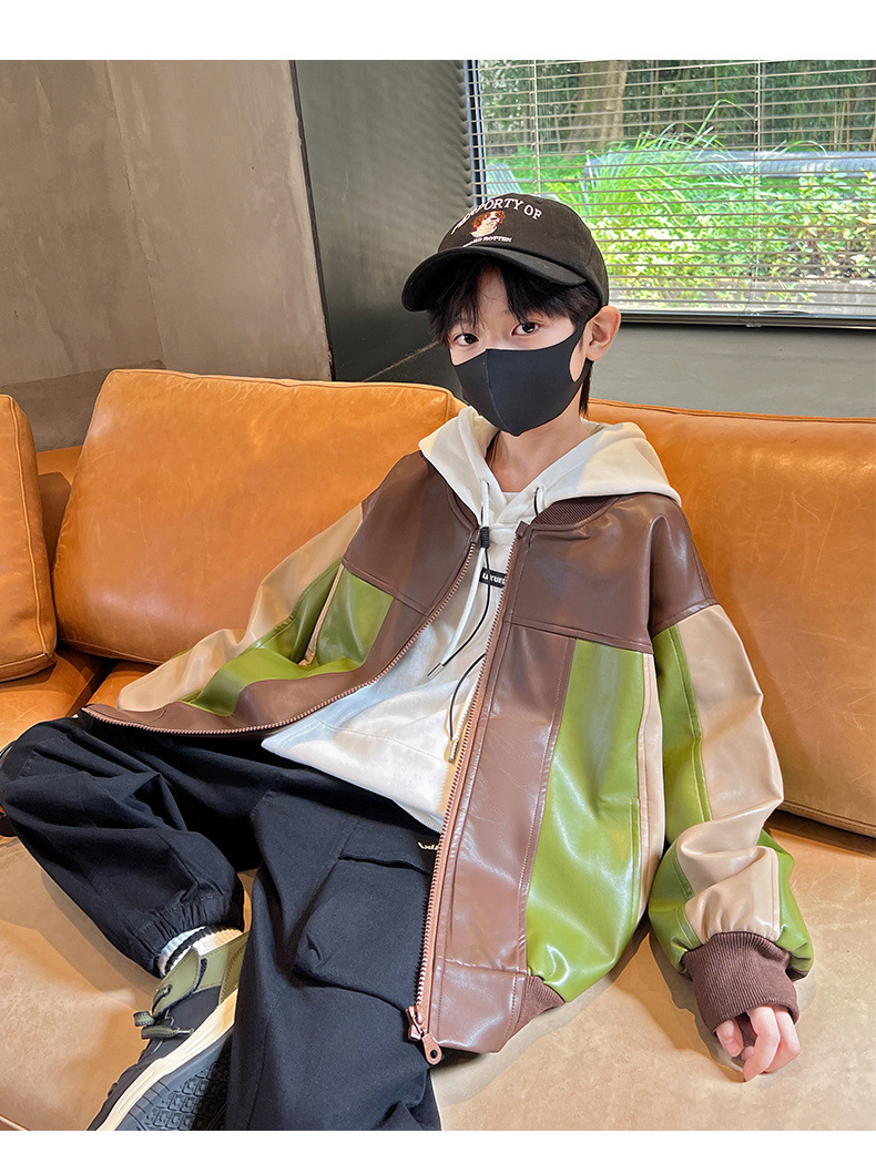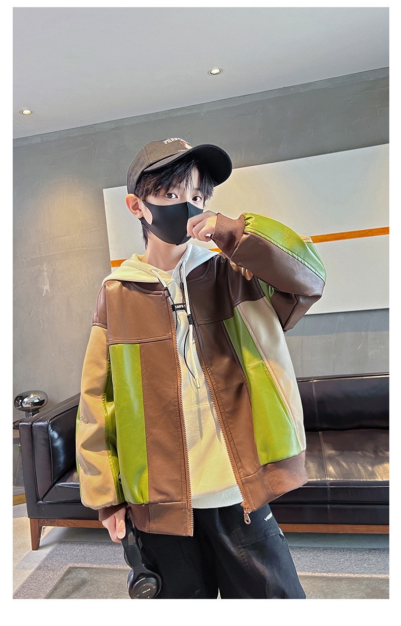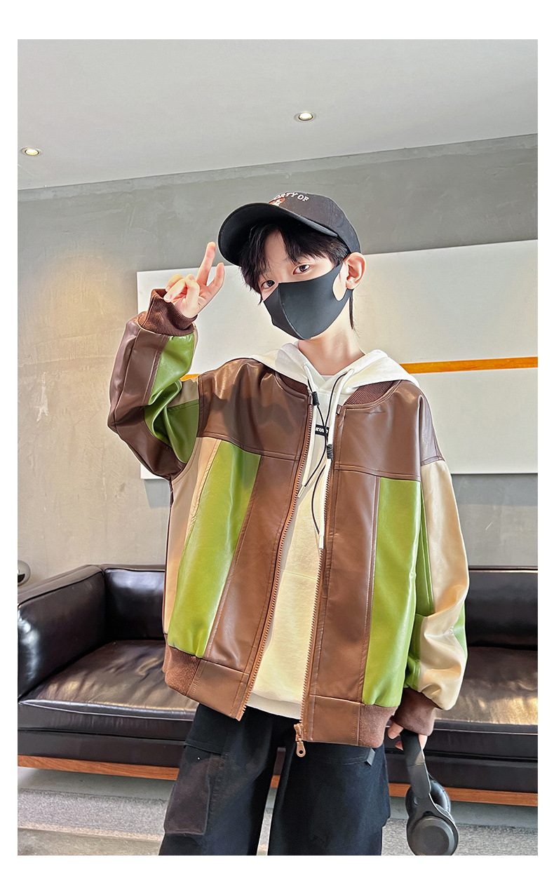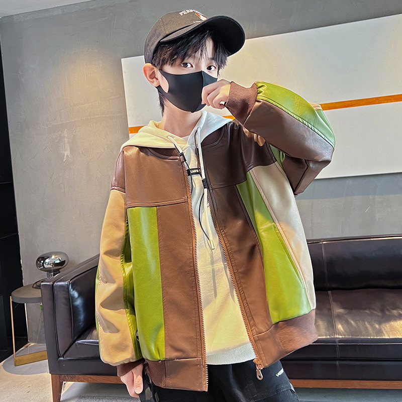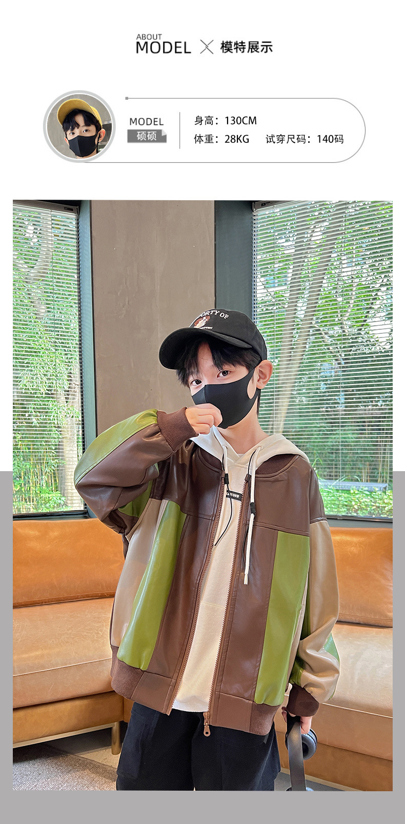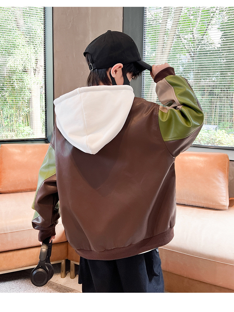 남학생 가죽 코트 가을과 겨울 코트 다크 브라운 바느질 서양식 루피아 핸섬 오토바이 가죽 자켓 소년 중 및 빅 키즈 야구 세트