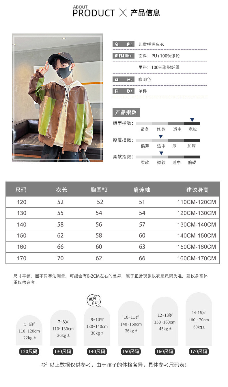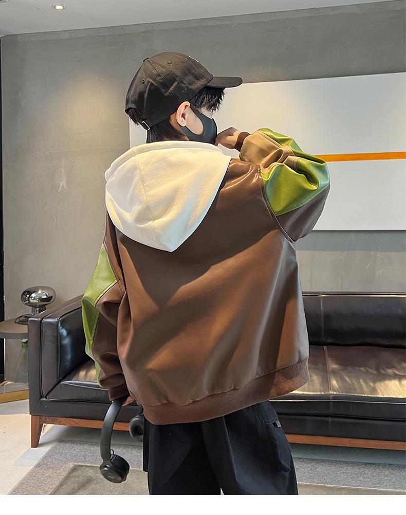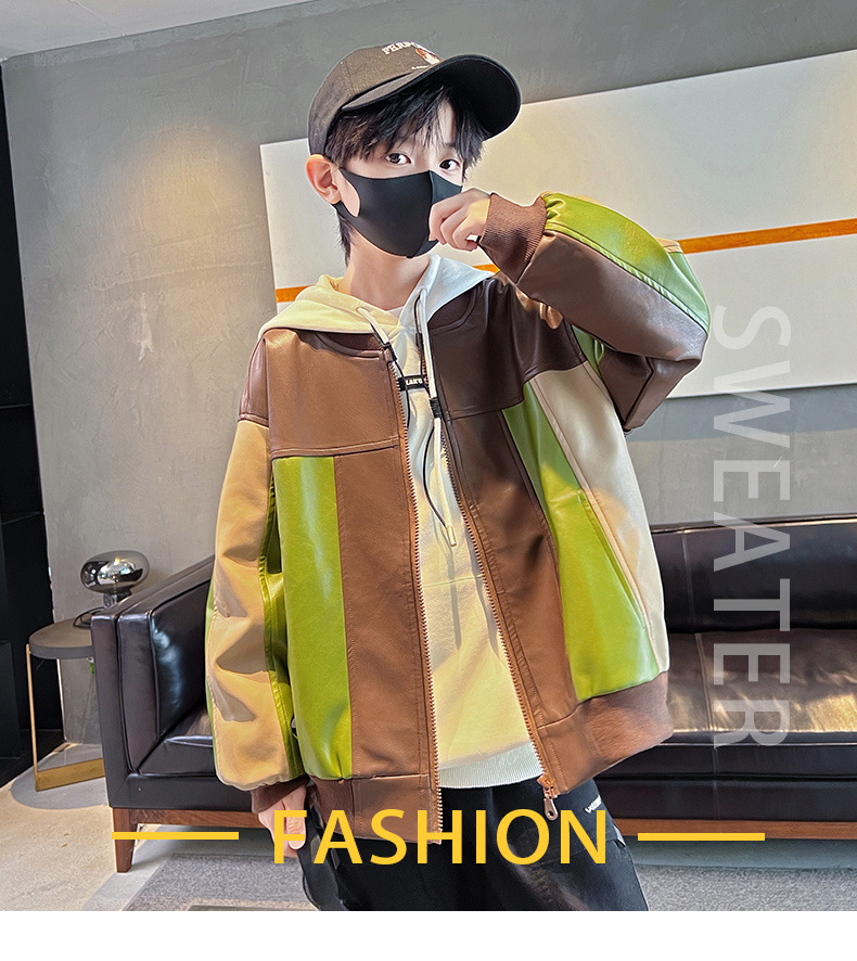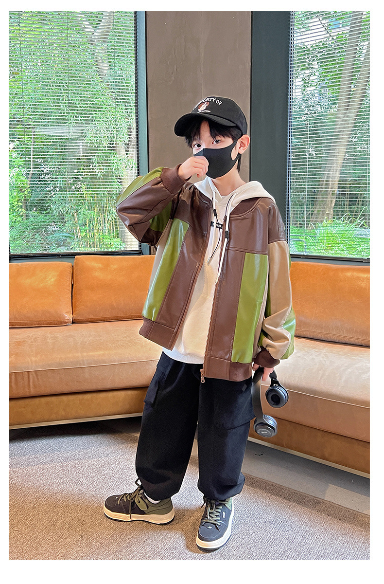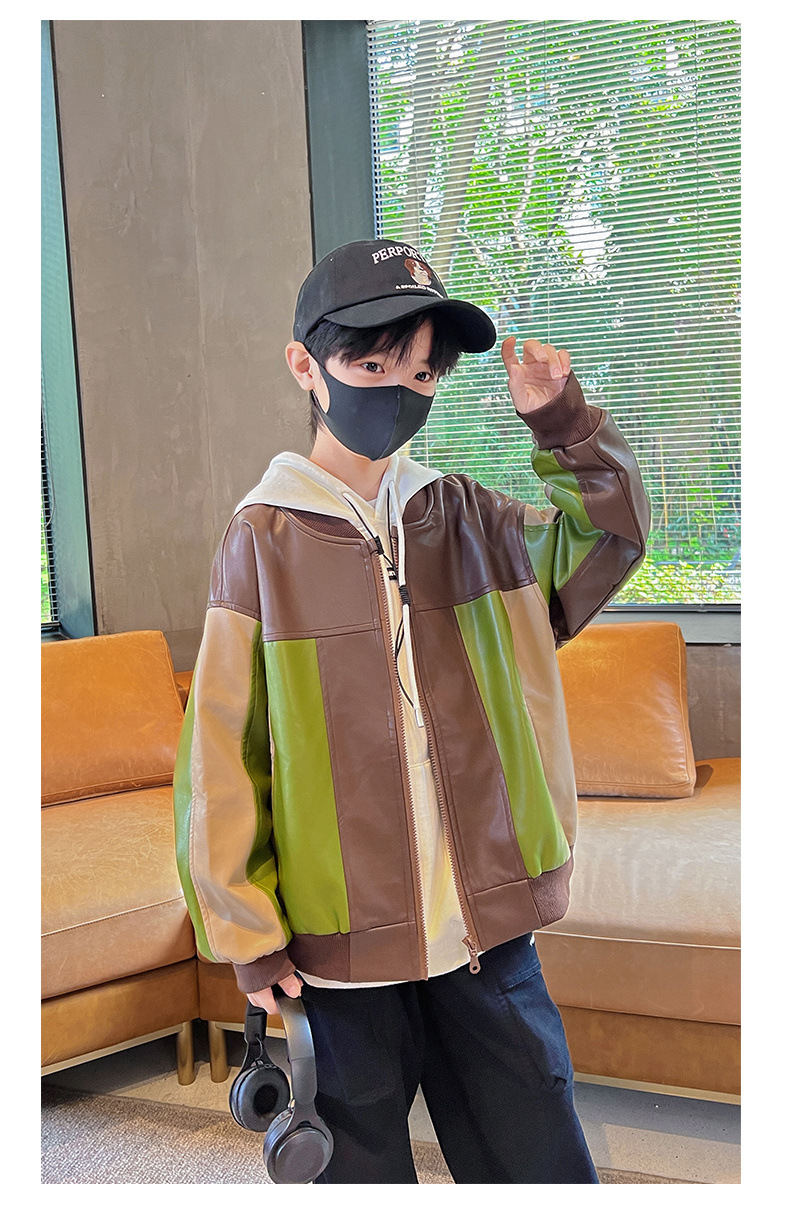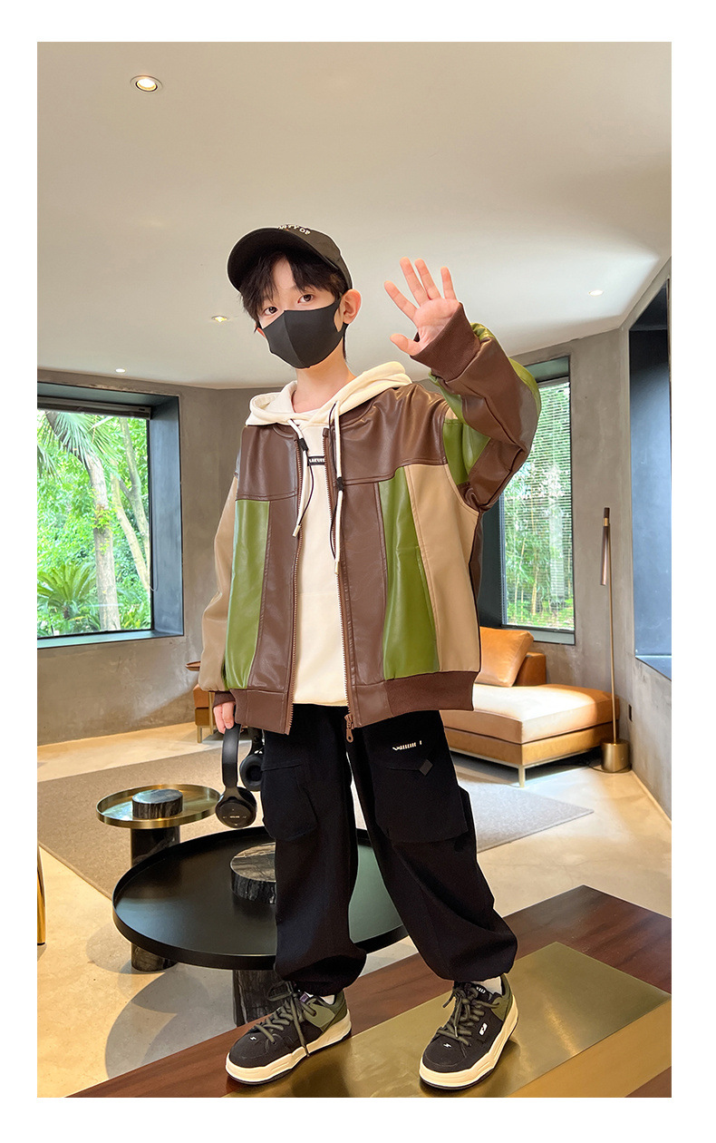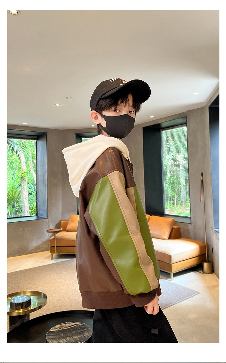 남학생 가죽 코트 가을과 겨울 코트 다크 브라운 바느질 서양식 루피아 핸섬 오토바이 가죽 자켓 소년 중 및 빅 키즈 야구 세트