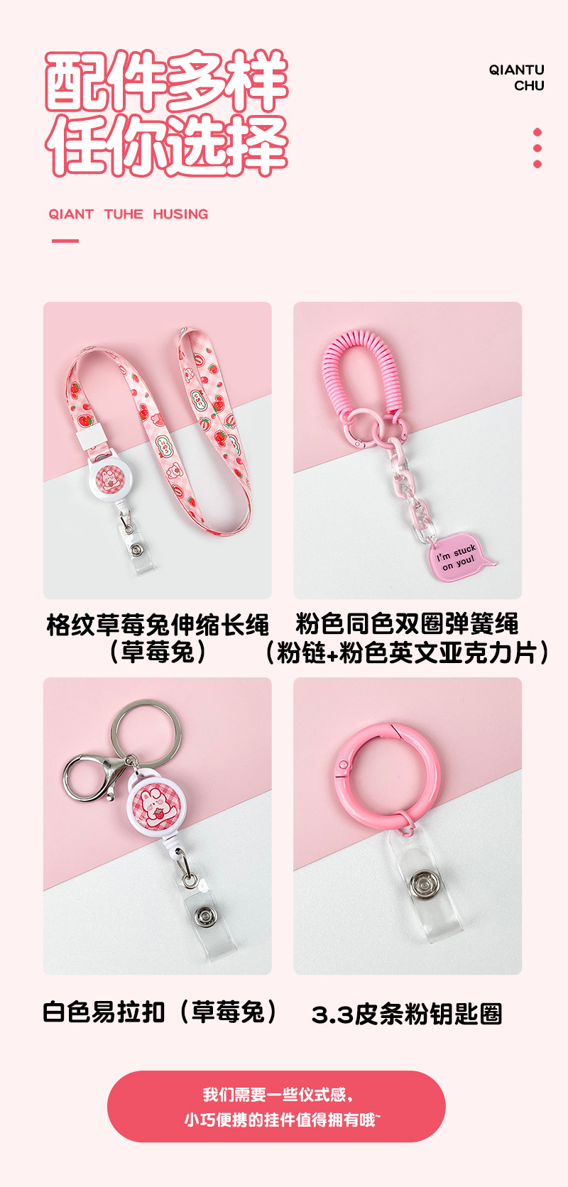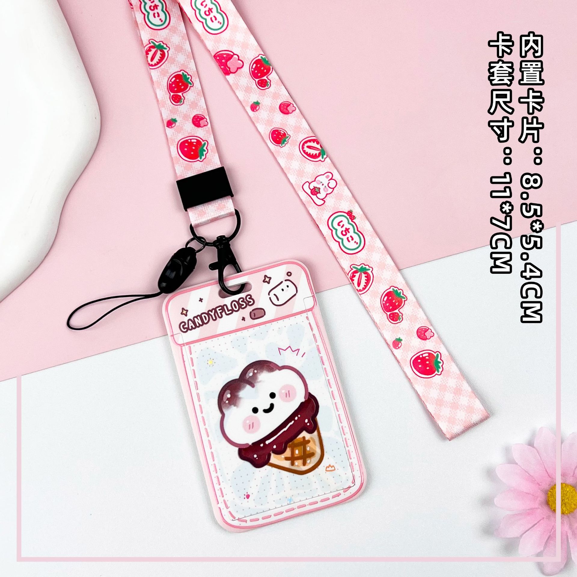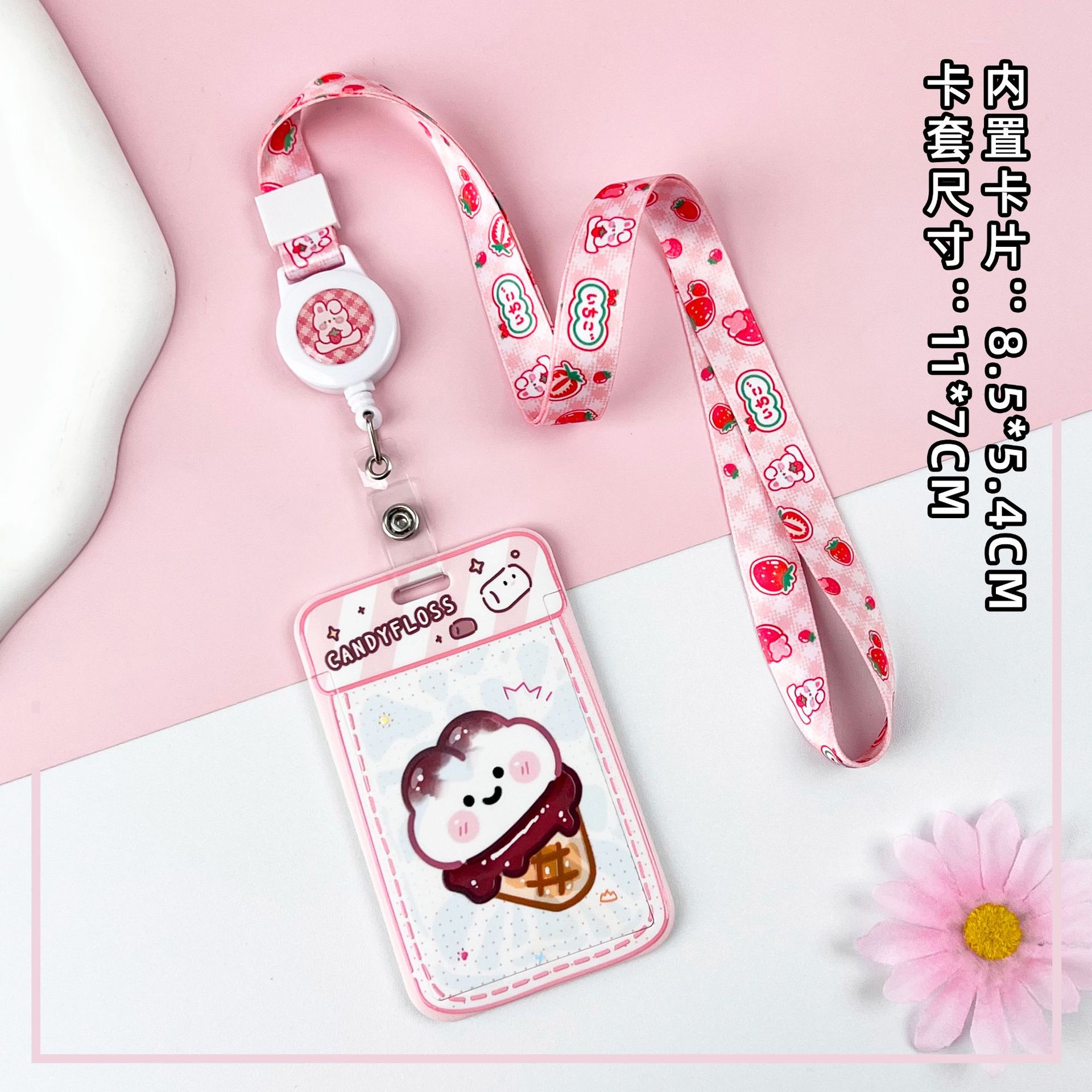 • 라이트 핑크 요거트 콘 + 체크 무늬 딸기 토끼 텔레스코픽 롱 로프 (딸기 토끼)