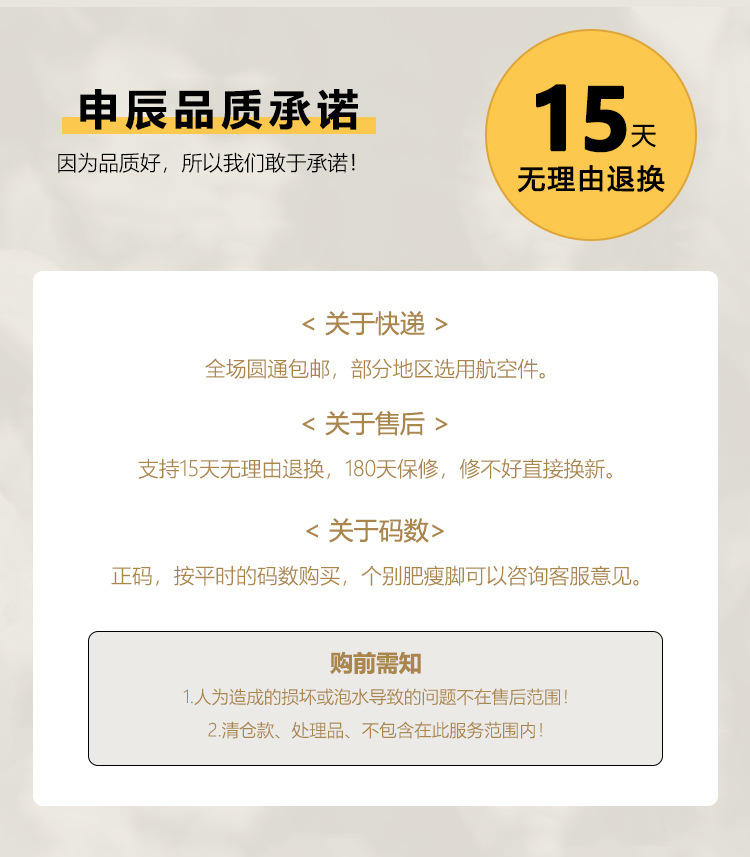 【关于货运】默认中通、优速,如需指定快递请联系客服,量大可以选【关于质量】断底、脱胶、破损、 严重污点由我们负责处理,小线头、小污点、微色差、微欠胶、微胶水气味等均不属于质量问题范围。