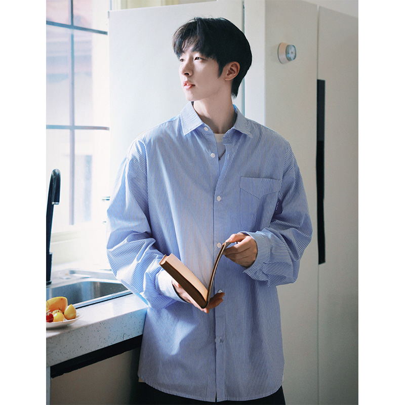 가을 신식 셔츠 남성용 버클 사이드 라벨 디자인 센스 탑 한국식 긴 소매 셔츠 남성복스토어 가기