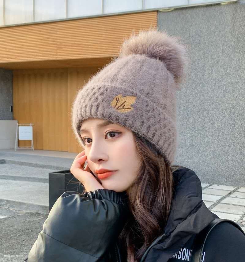 • 可爱小熊毛帽子女冬季可系带毛线帽女生显脸小护耳灰色保暖针织帽