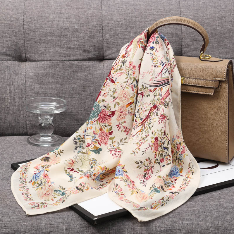 • 면과 린넨 사각 스카프 - 꽃과 새 흰색